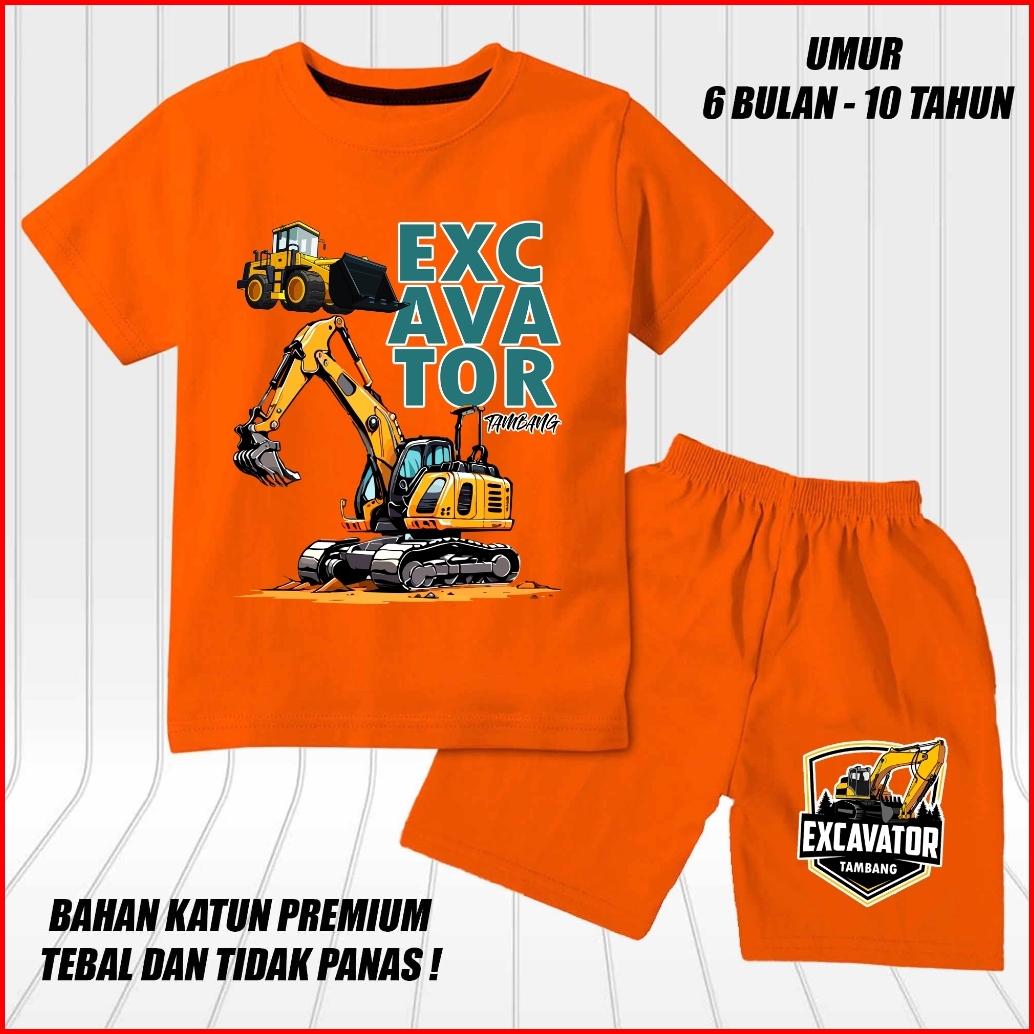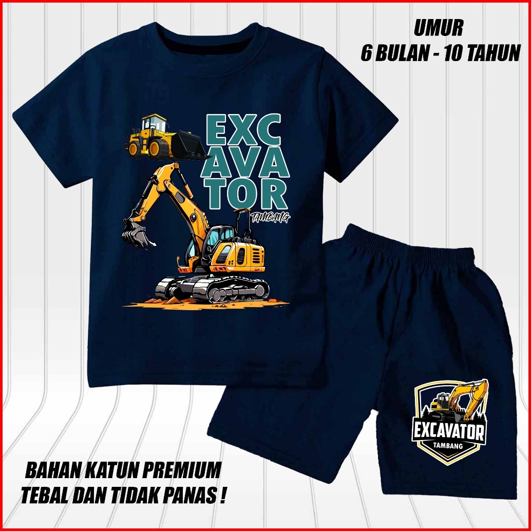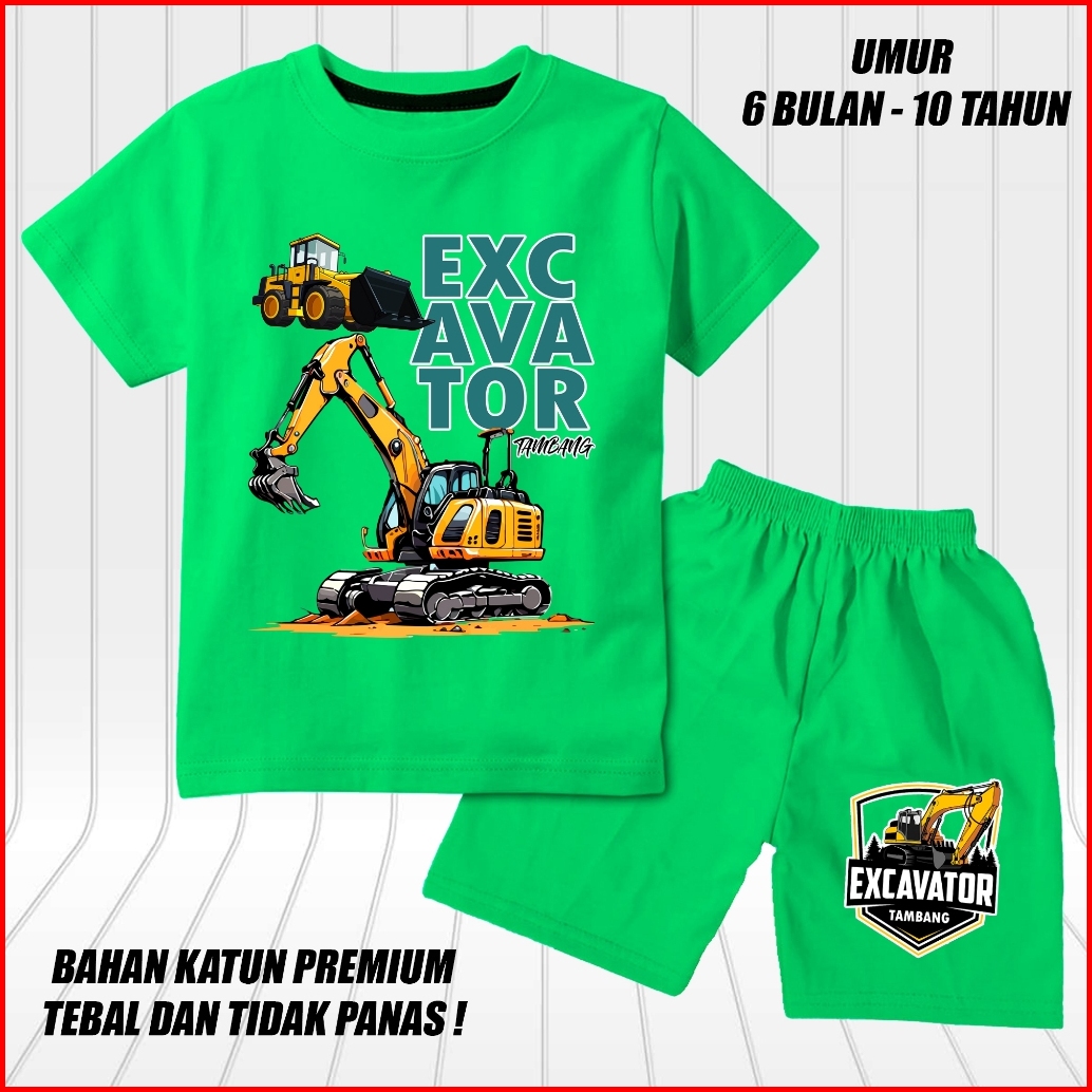Setelan Lengan Pendek Anak Laki Laki Perempuan Set Baju Kaos Pendek Anak Cowok Motif Excavator 2 Tambang Dtf