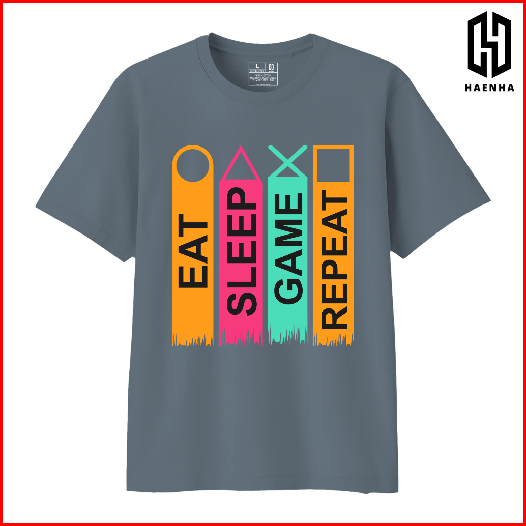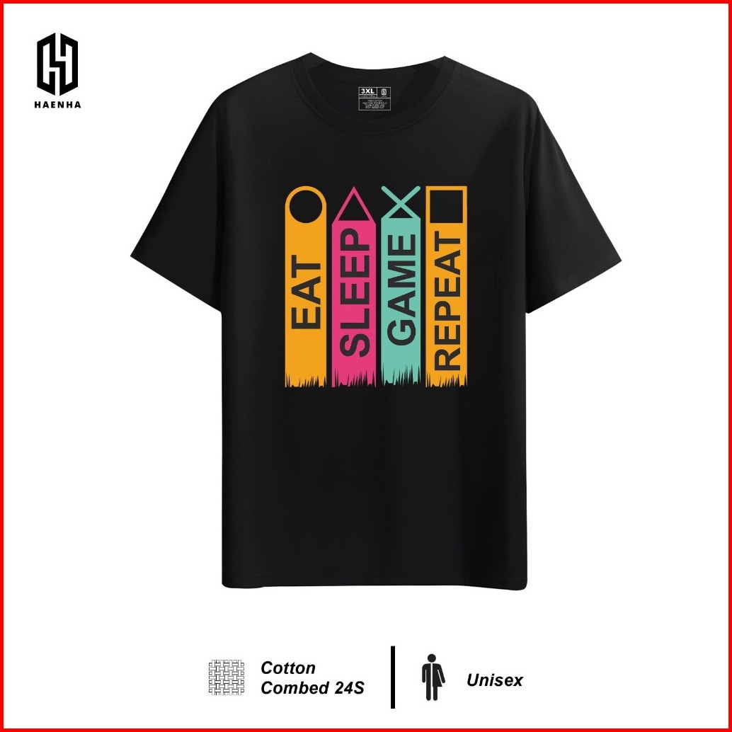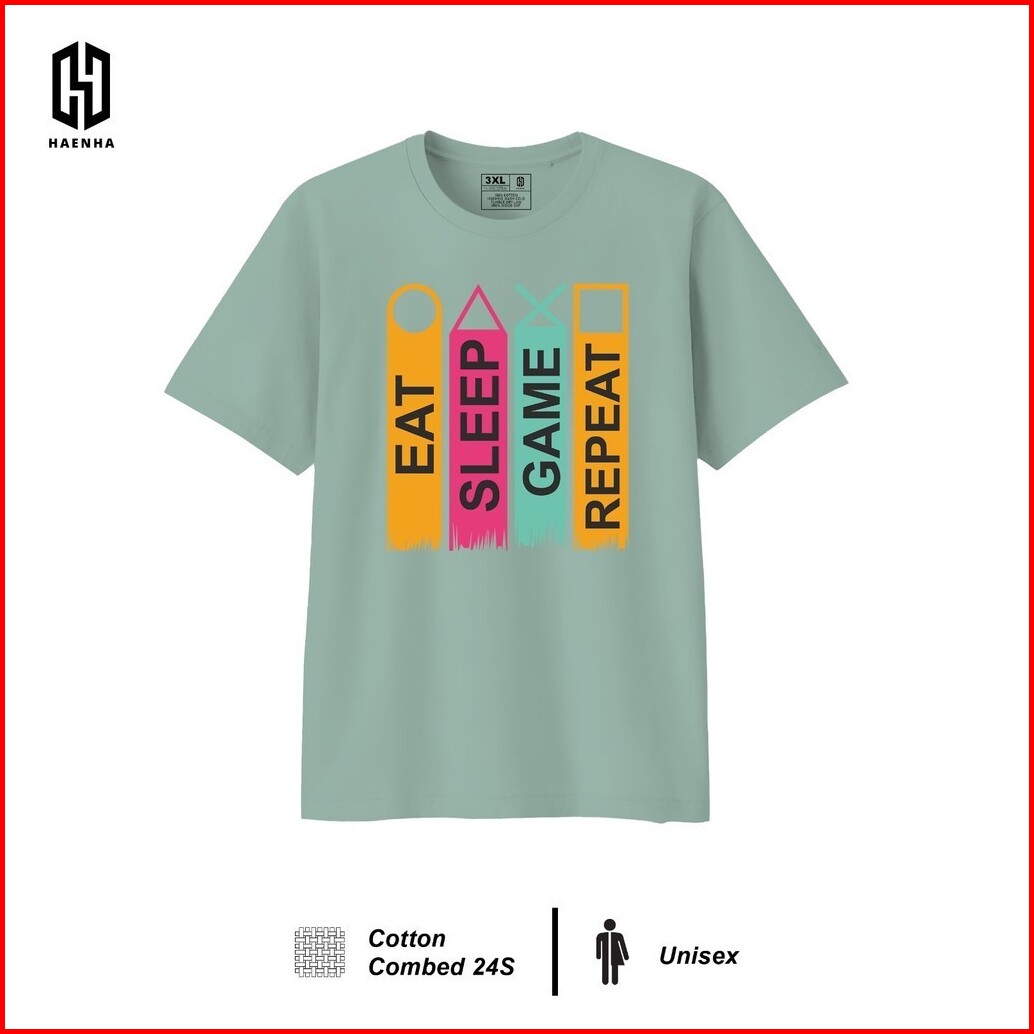 Haenha Eat Sleep Game Repeart Baju Kaos Distro - T Shirt Sablon Unisex Black White Sage Cream