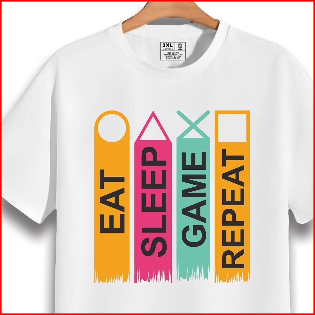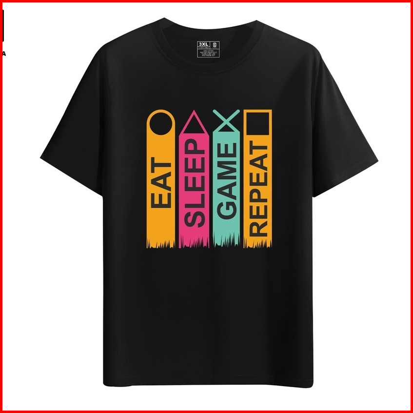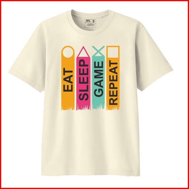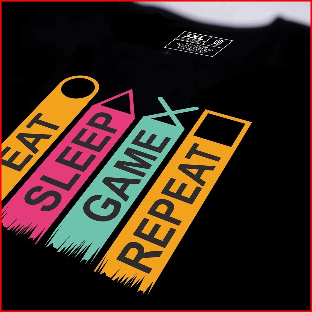 Haenha Eat Sleep Game Repeart Baju Kaos Distro - T Shirt Sablon Unisex Black White Sage Cream