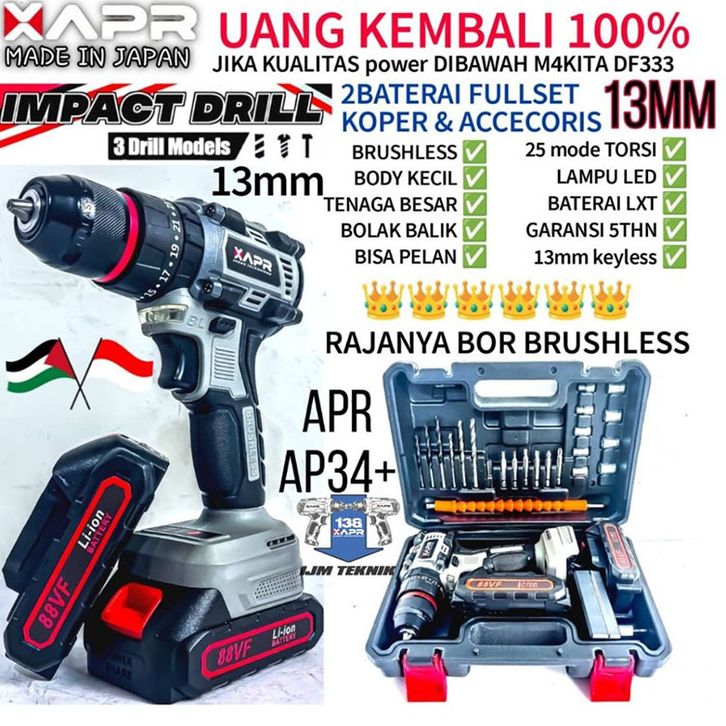APR BOR impact drill BRUSHLESS TYPE AP34+ 13mm keyless auto lock 2baterai lxt 88v GARANSI 5 TAHUN