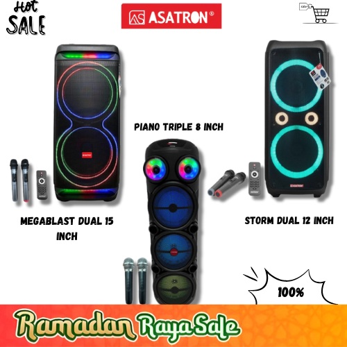 SPEAKER BLUETOOTH ASATRON MEGABLAST WITH 2 WIRELESS MIC DUAL 15 INCH STORM DUAL 12 INCH PIANO TRIPLE 8 INCH ORIGINAL