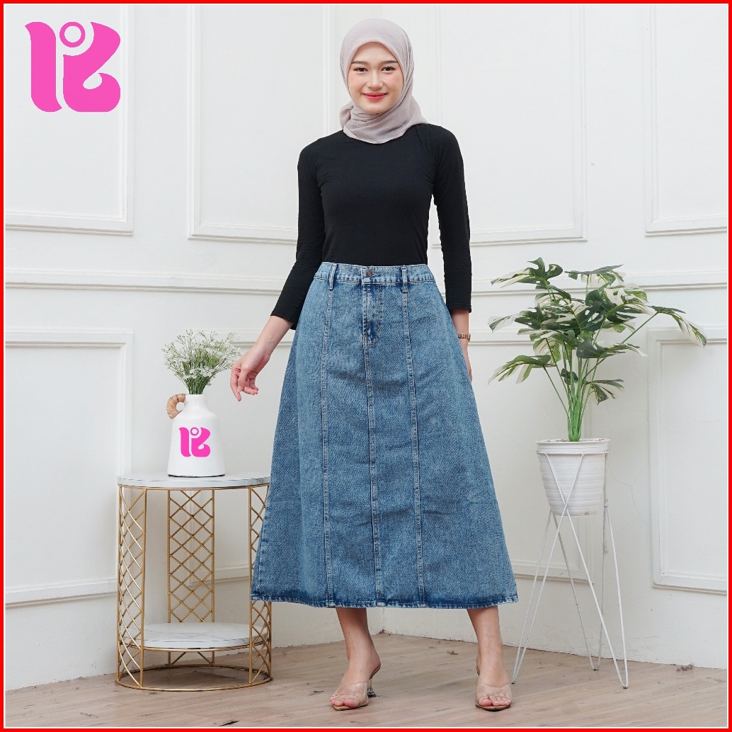 Jisso Rok Jeans Mayung Premium Wanita A- Line 7 8 Model Payung Pinggang Karet - Rok Wanita Hihgwaist Skirt Denim