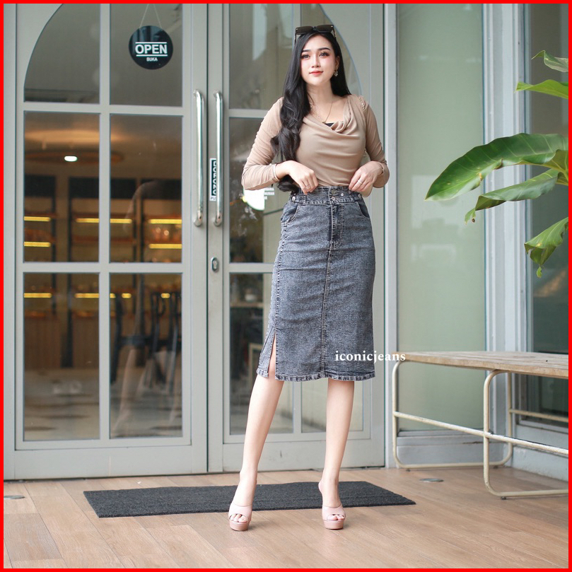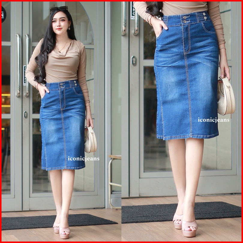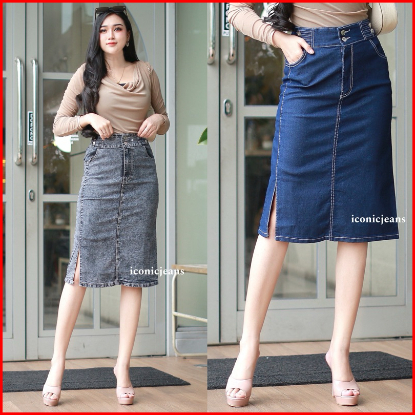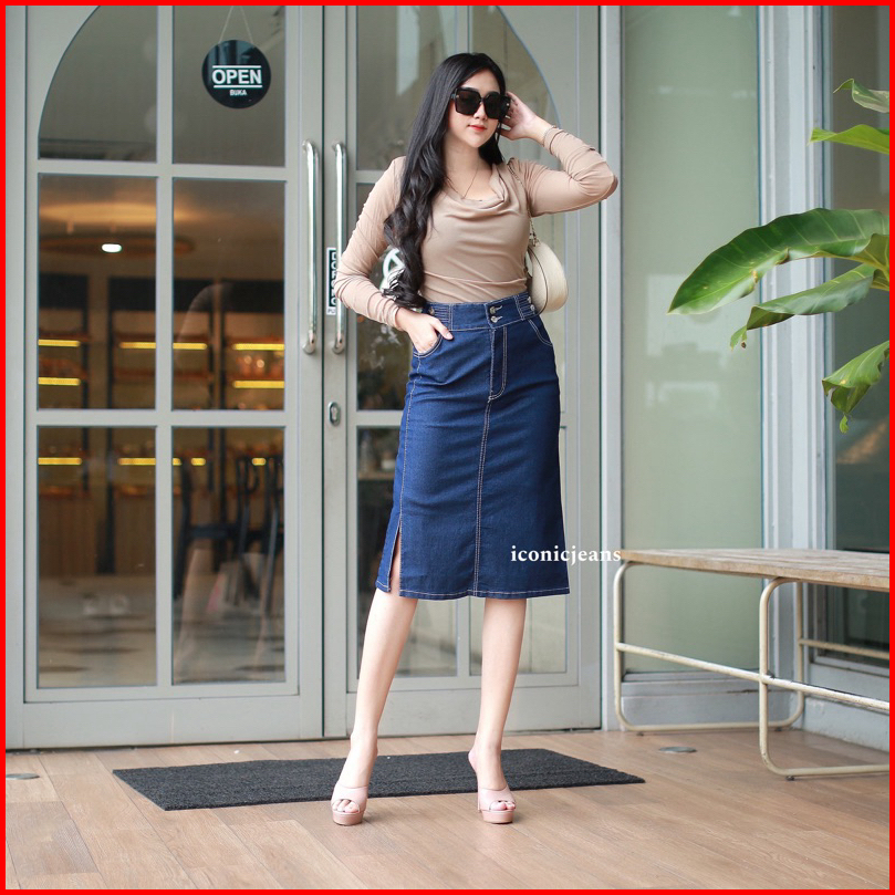 Iconicjeans-cecilia Jeans Skirt Rok Jeans Stretch Pendek Belah Samping Pinggang Karet