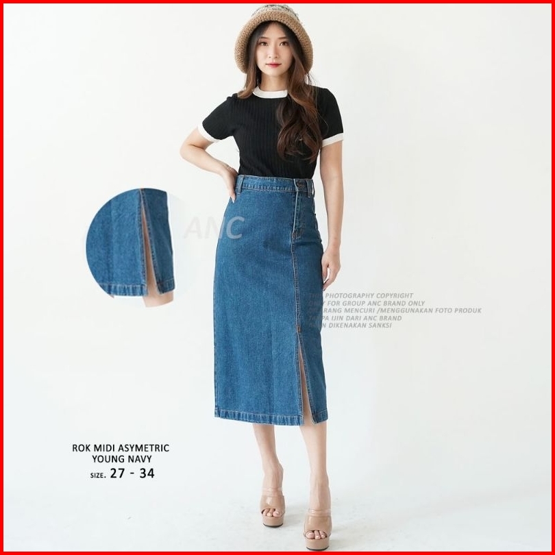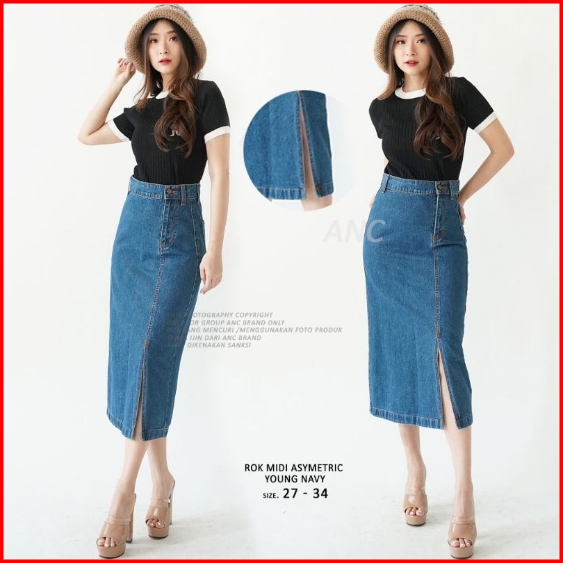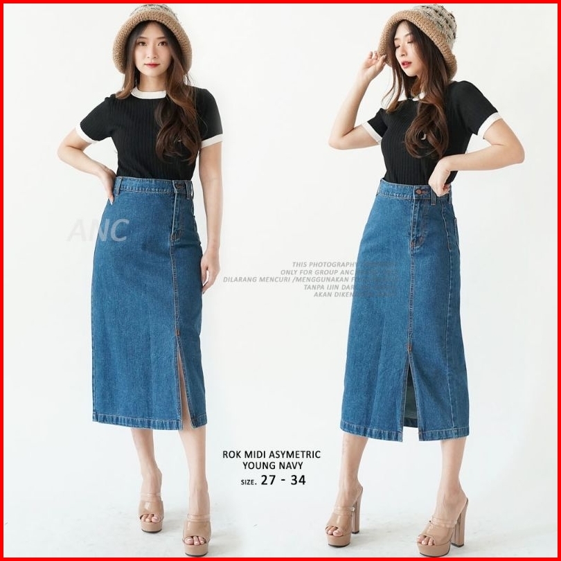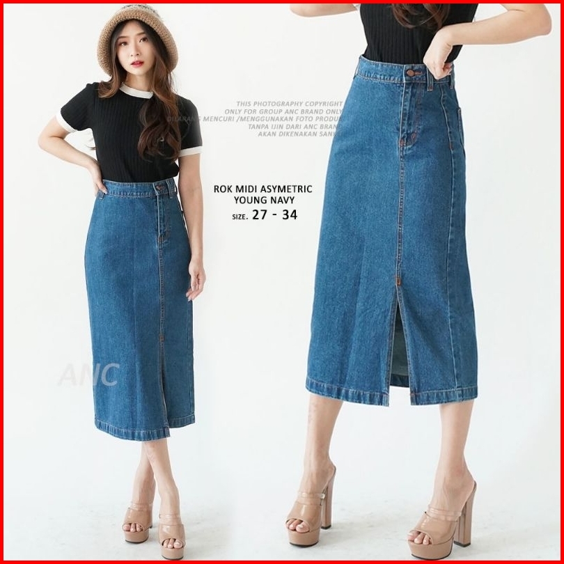 Rok Jeans Midi 7 9 - Rok Span Midi Asimetris Belah Samping Navy Young