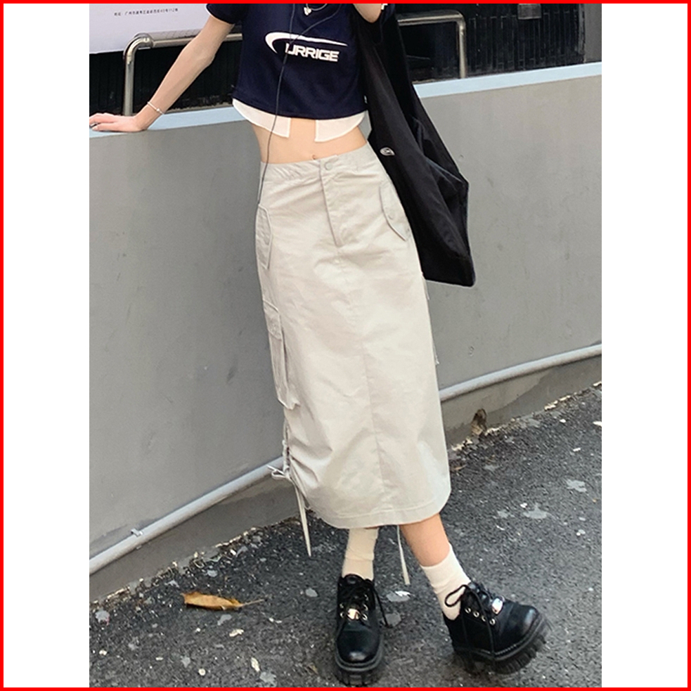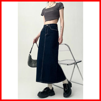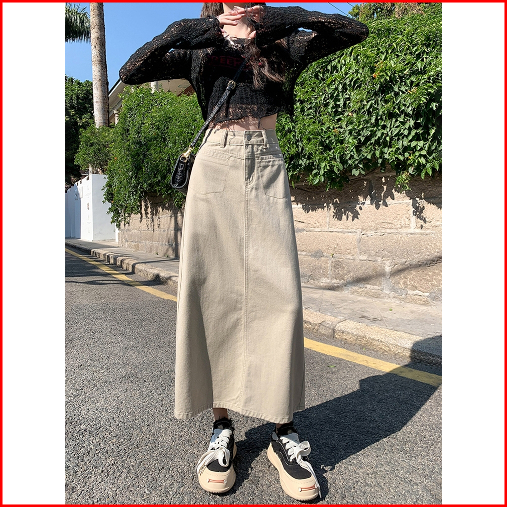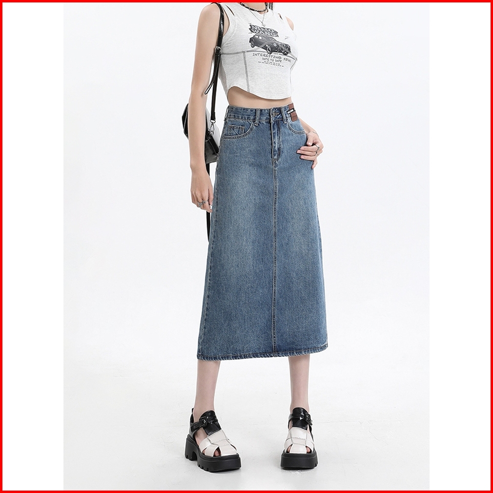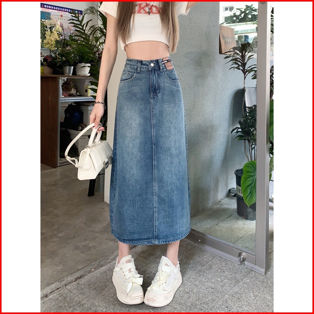 Highwaist Korean Style Rok Jeans Wanita Belah Belakang Midi Skirt A-line