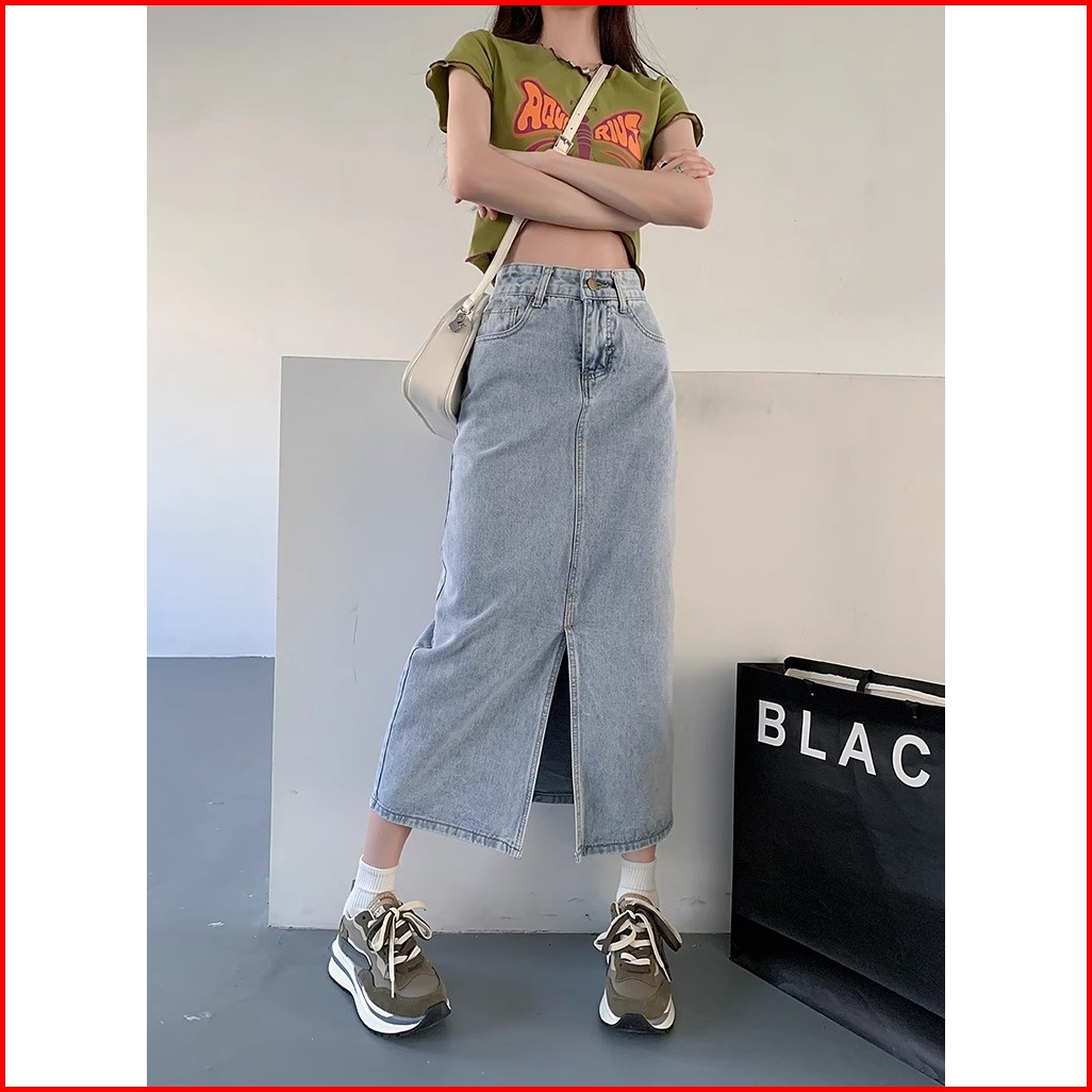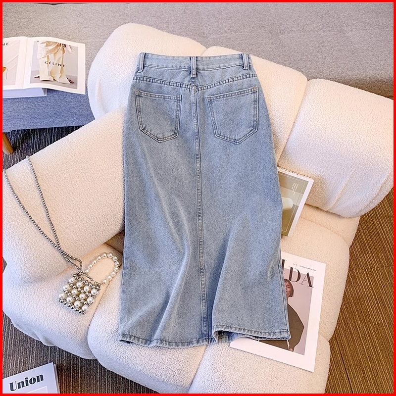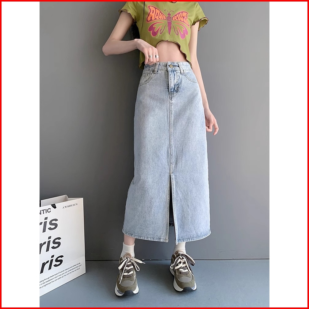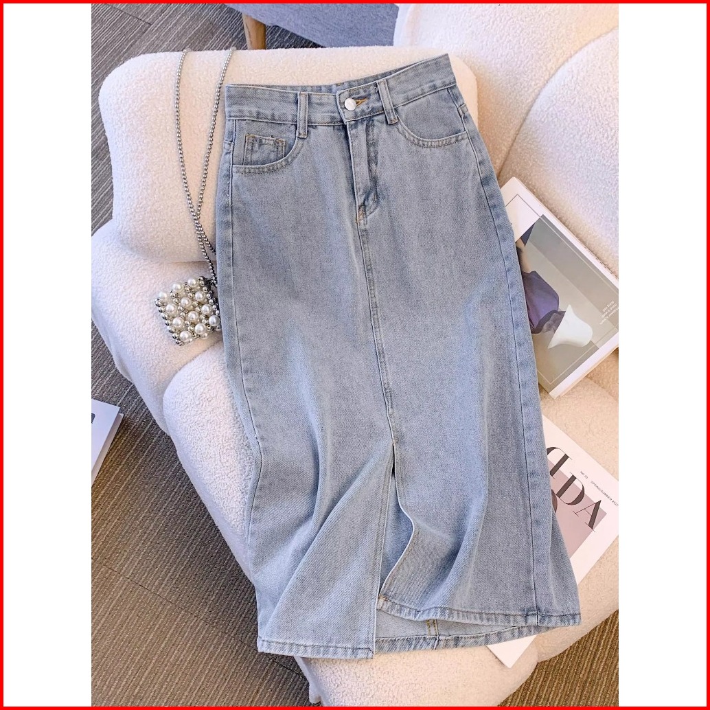 Luck Wanitabiru Muda Belahan Depan Rok Jeans Highwaist A-line Rok Jeans Wanita Polos