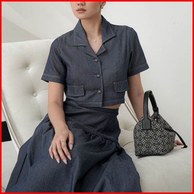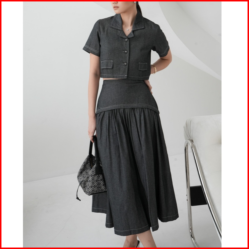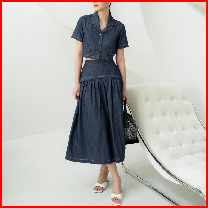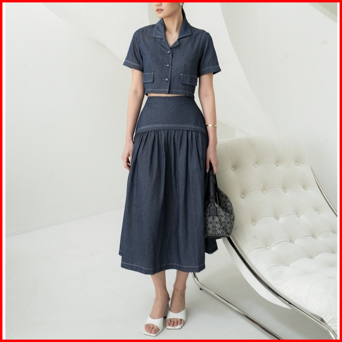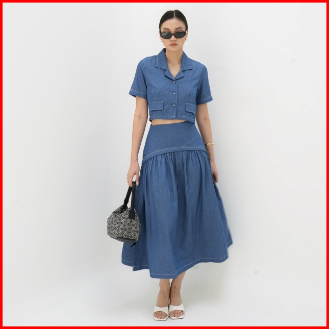 Tavia Yura Denim Skirt Set Setelan Wanita Setelan Rok Midi Baju Set Wanita