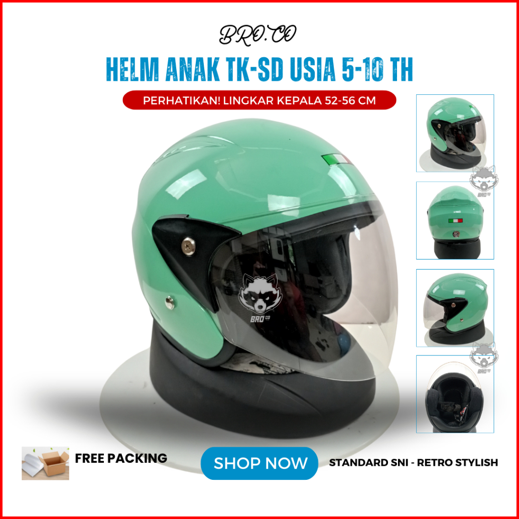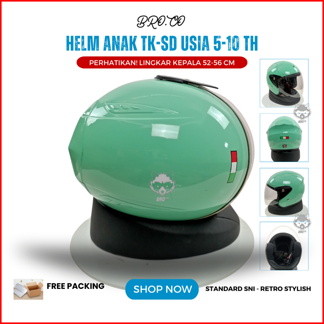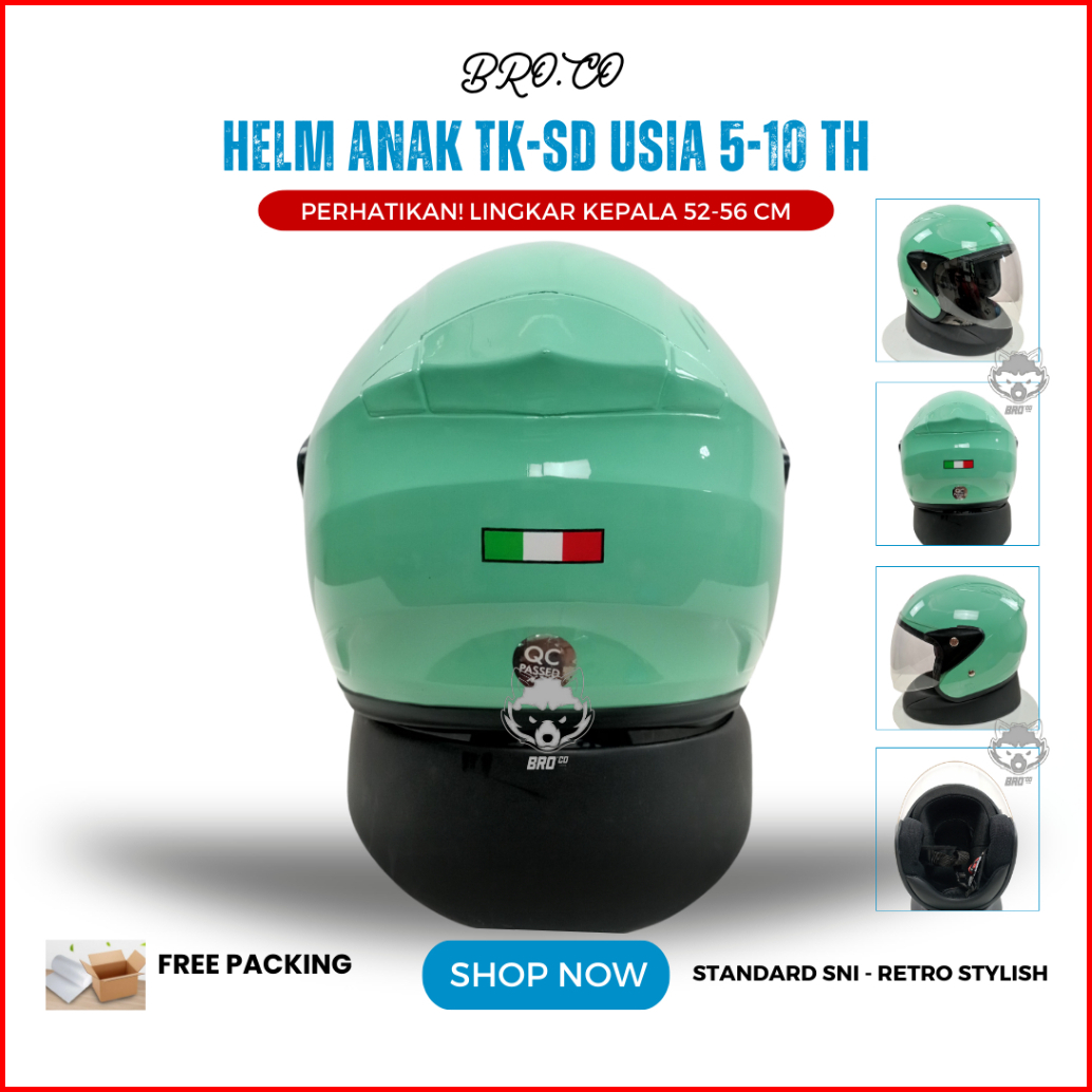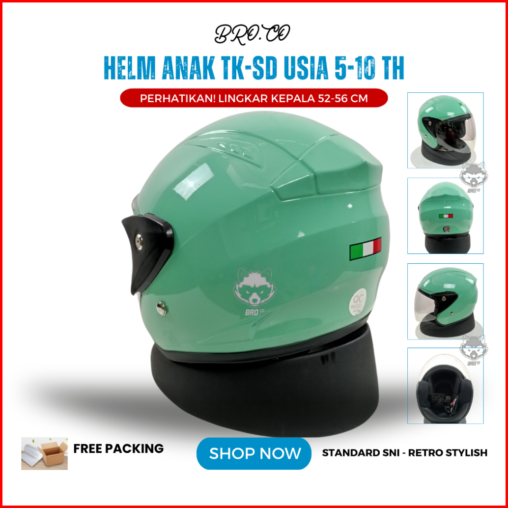 Helm Pilot Retro Italy Anak Anak Junior Tanggung Half Face Hijau Pastel Glossy Standard Sni Premium Brokids Bro.co Untuk