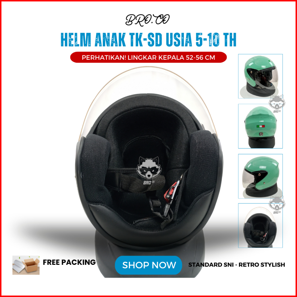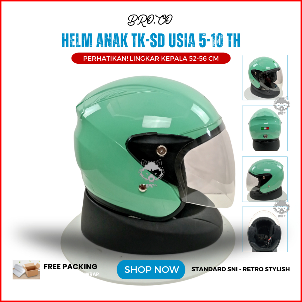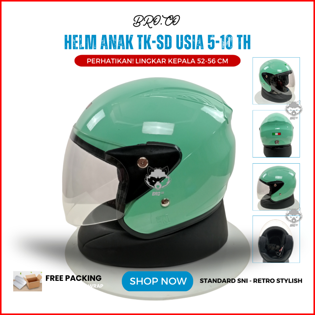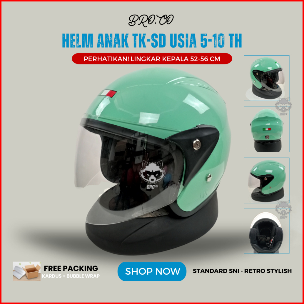 Helm Pilot Retro Italy Anak Anak Junior Tanggung Half Face Hijau Pastel Glossy Standard Sni Premium Brokids Bro.co Untuk