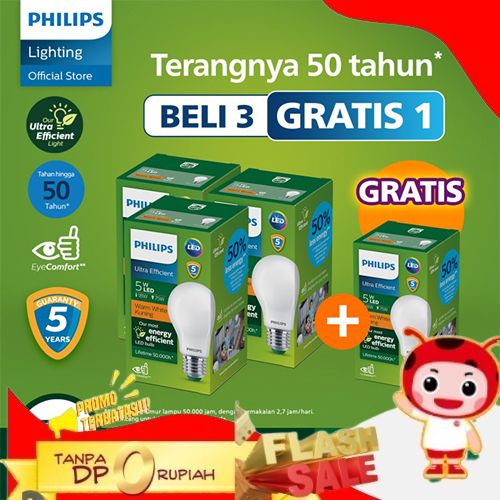 SUPER BELI 3 GRATIS 1 PHILIPS LAMPU BOHLAM LED ULTRA EFFICIENT 5W 27K WARM WHITE