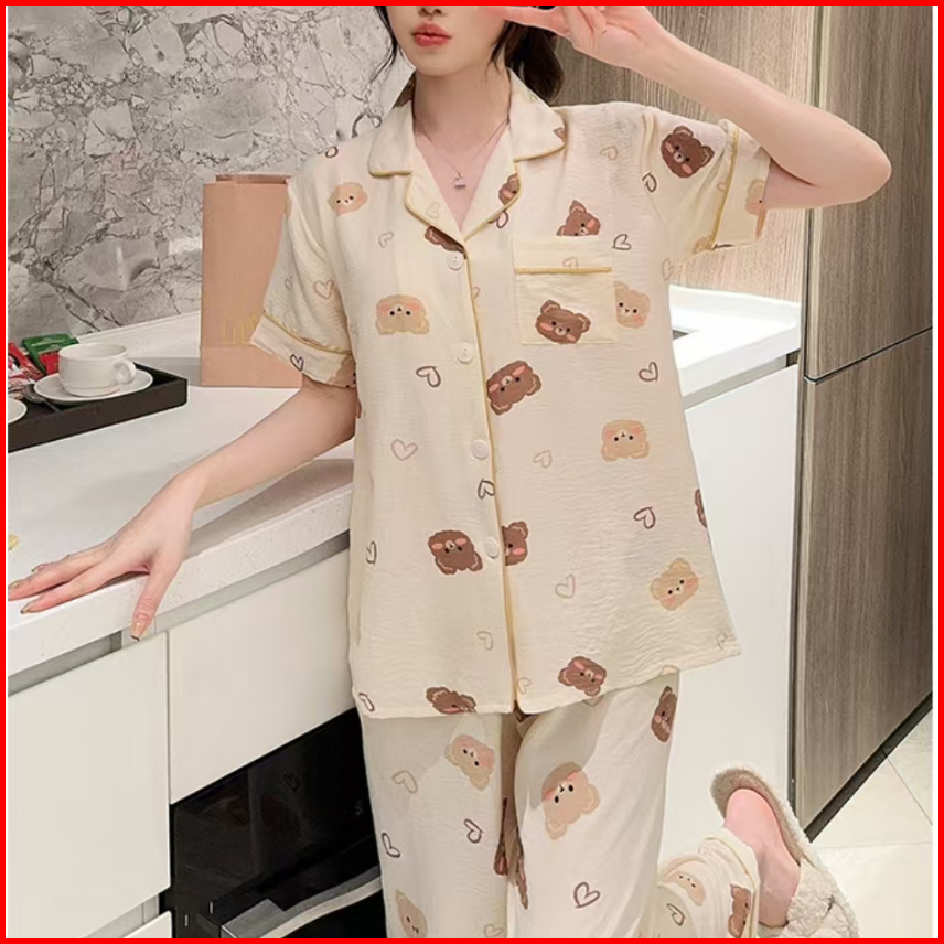 Piyama Wanita Sutra Es Gaya Baru Yang Lucu Kardigan Lengan Pendek Celana Panjang Set Pakaian Rumah
