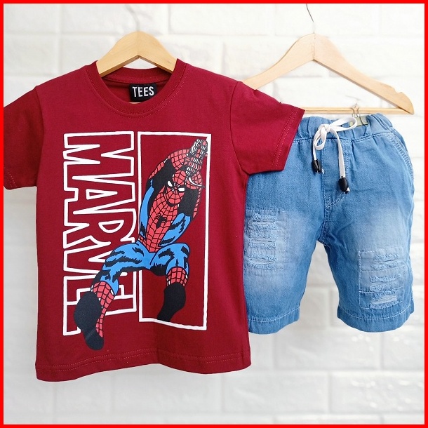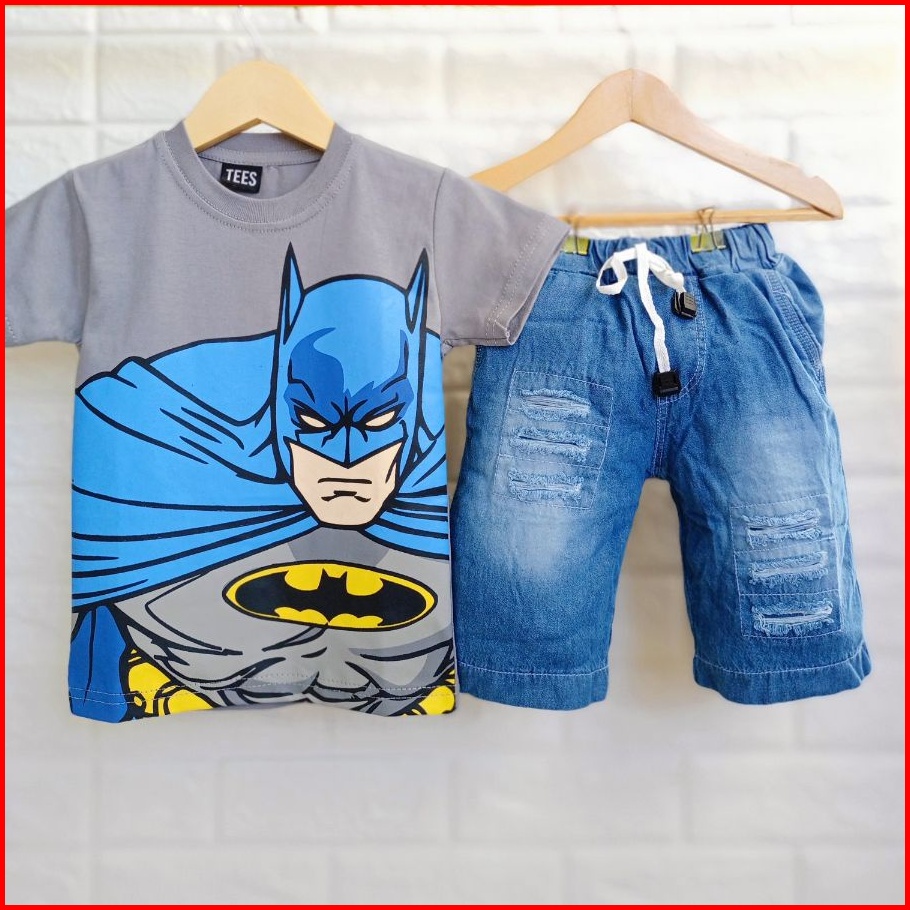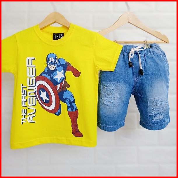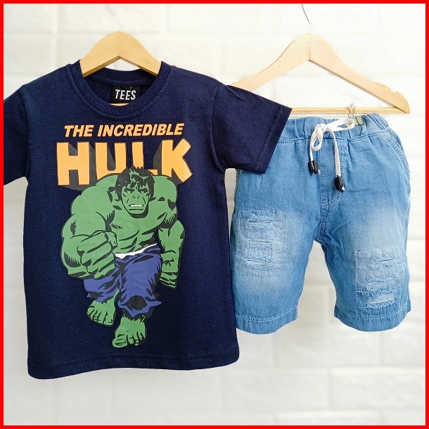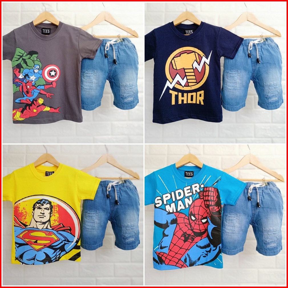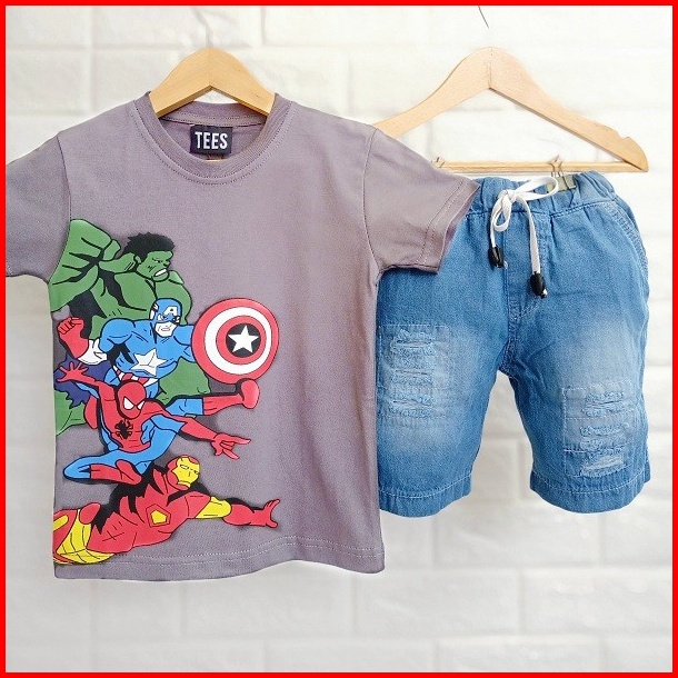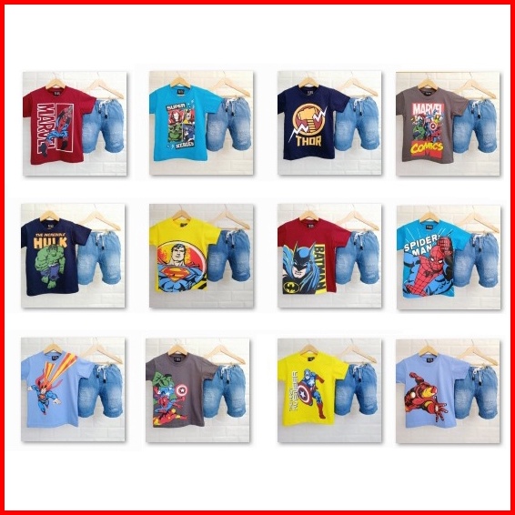 Setelan Anak Superhero 6-9 Tahun Celana Pendek Denim Avenger Hulk Ironman Batman Spiderman 1-9 Tahun