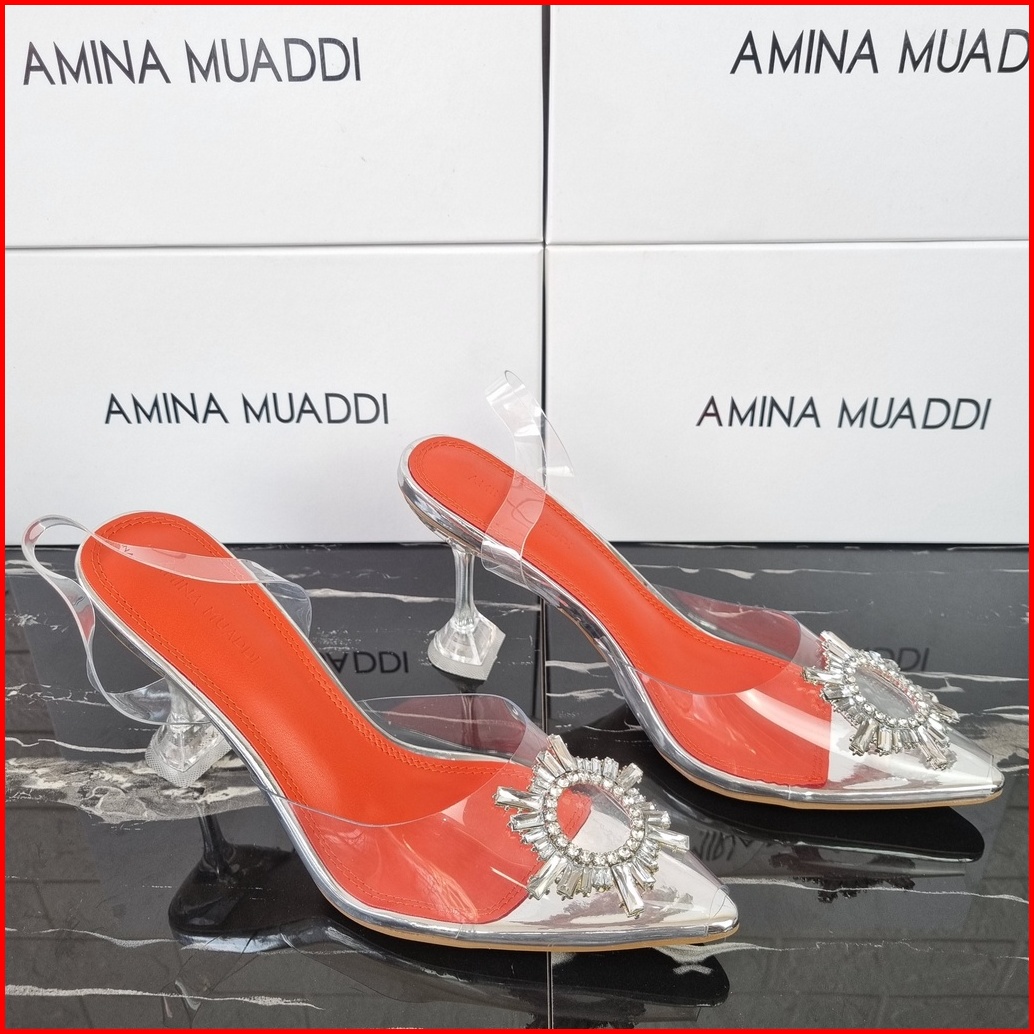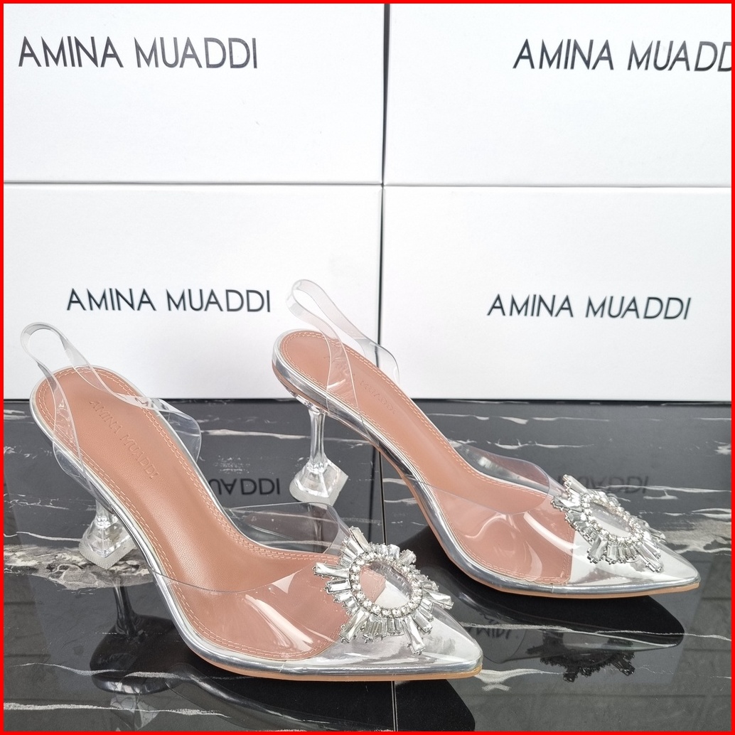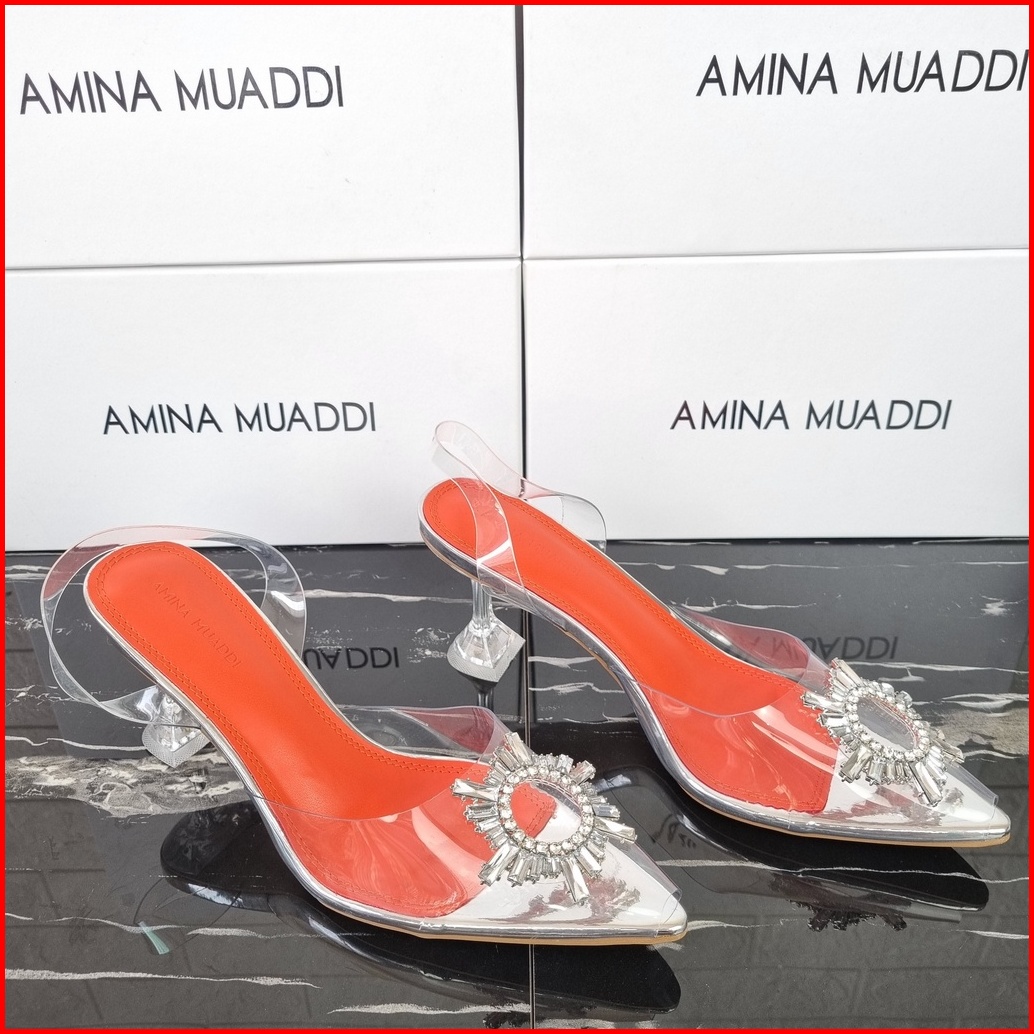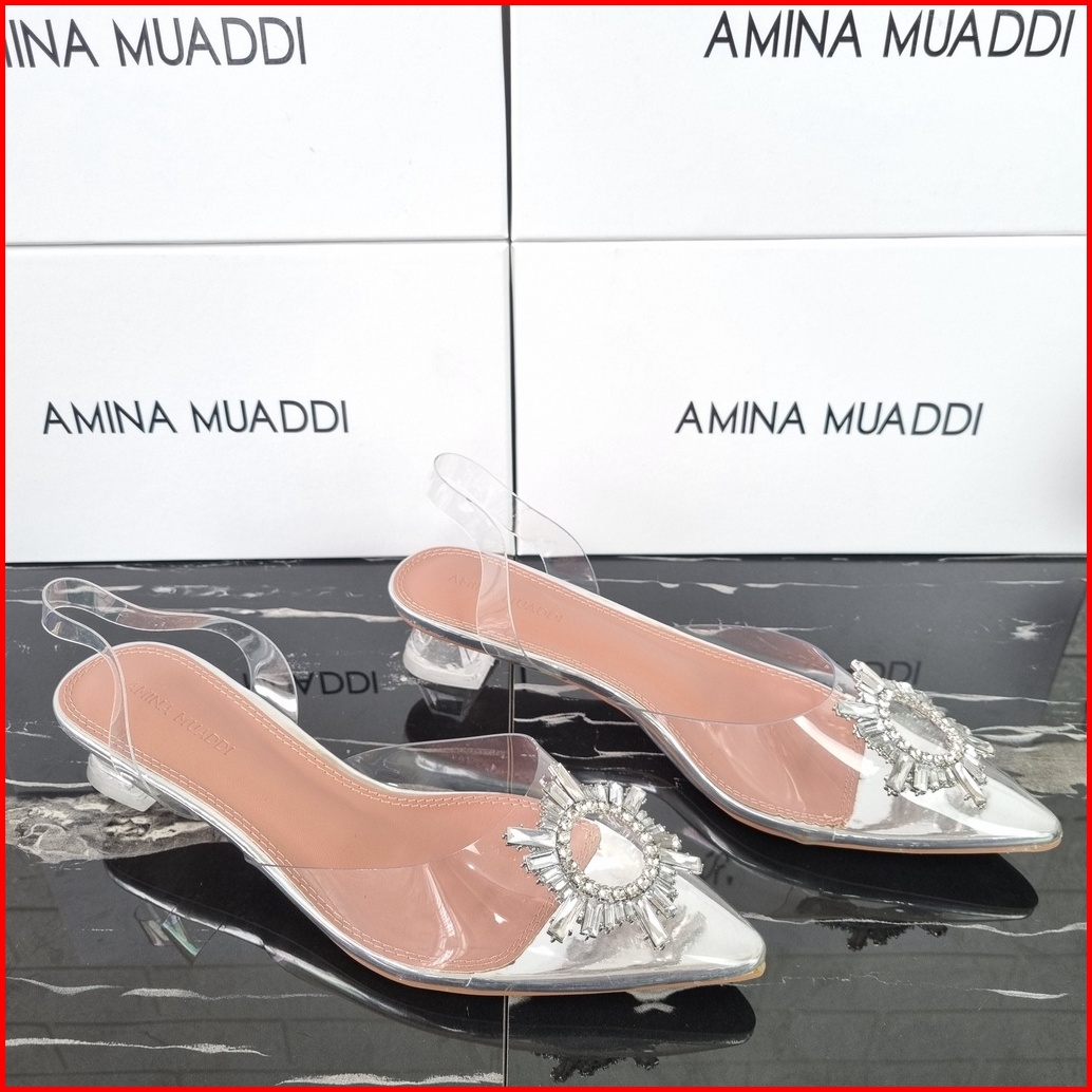 Sepatu Amina Muaddi Begum Crystal Glass Sling Heels Transparent Pvs - Sam001
