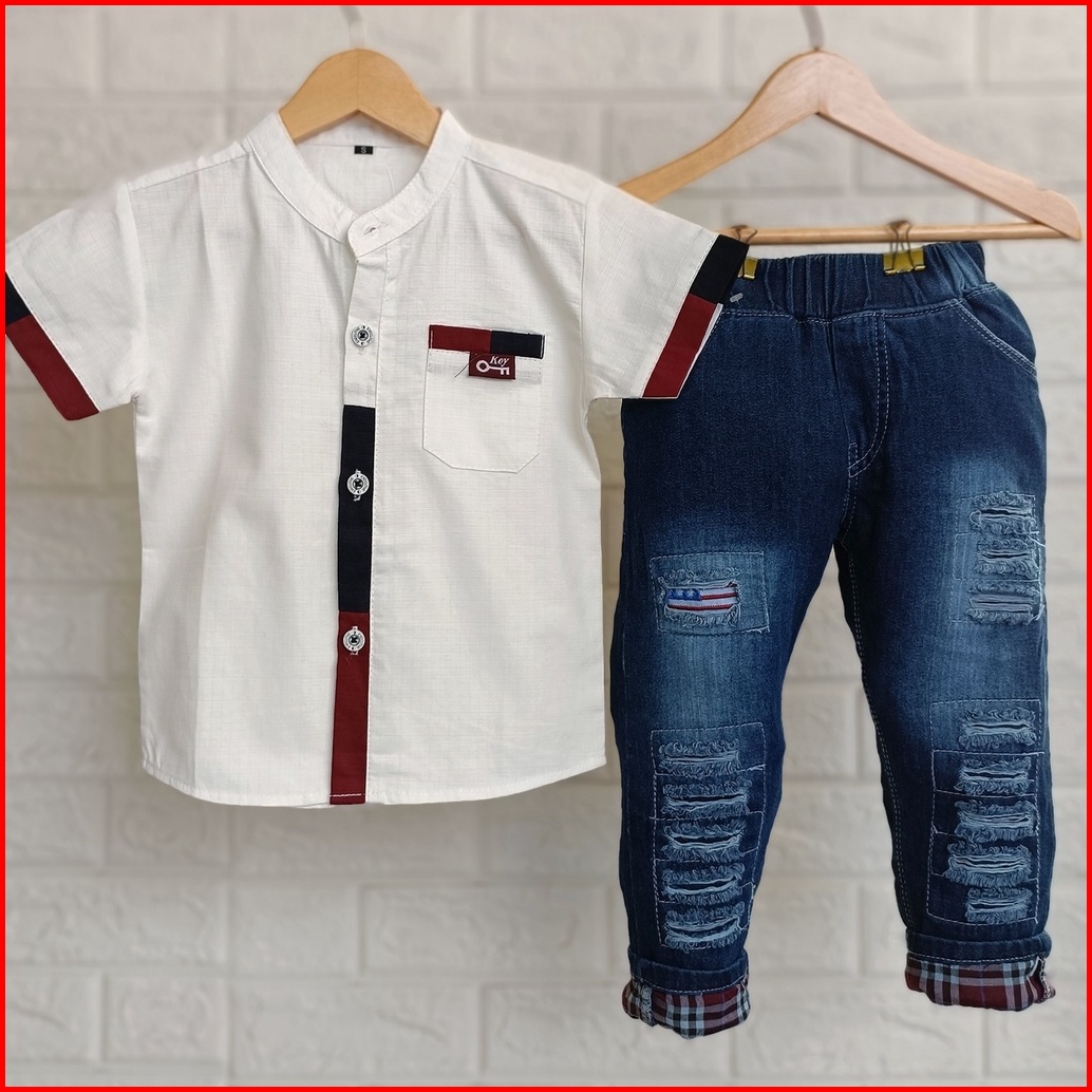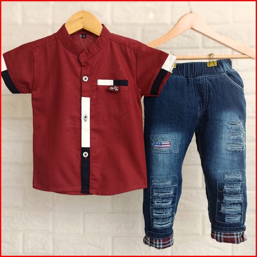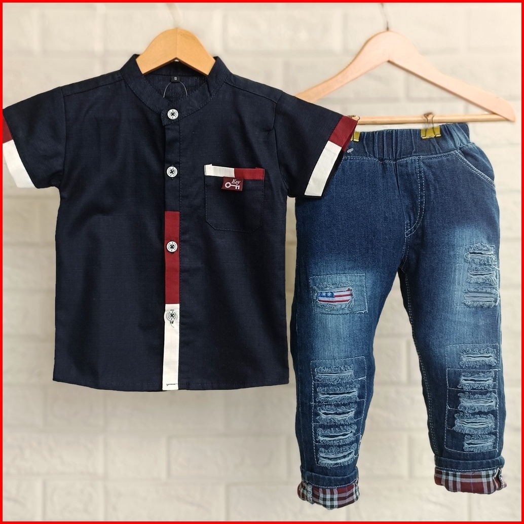 Setelan Kemeja Anak Laki-laki Celana Panjang Jeans Baju Kemeja Anak Cowok Kemeja Line Jeans Blstk 1 Tahun - 10 Tahun Kem