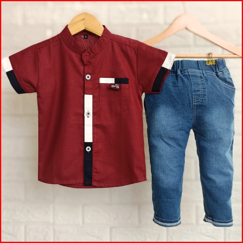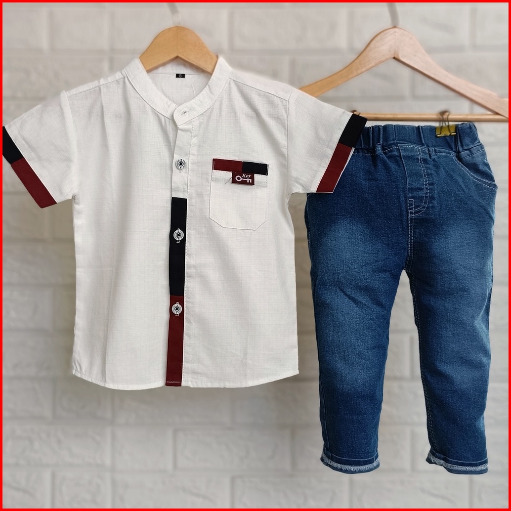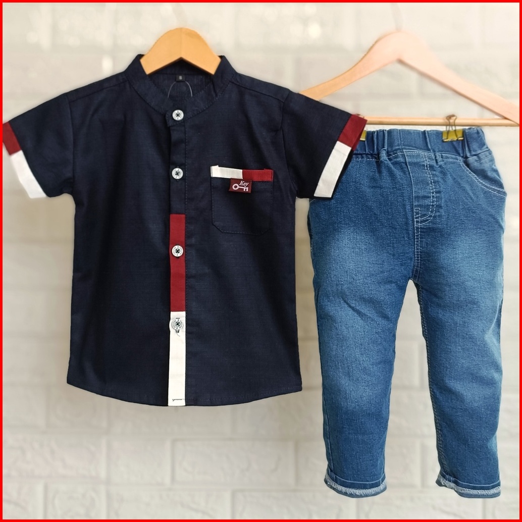 Baju Kemeja Anak Laki-laki Celana Panjang Jeans Stretch Setelan Kemeja Anak Cowok Kemeja Line Jeans Stretch 1 Tahun - 10