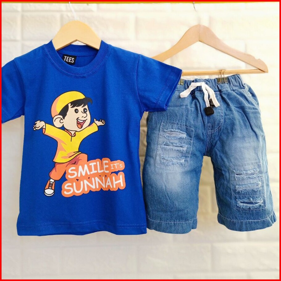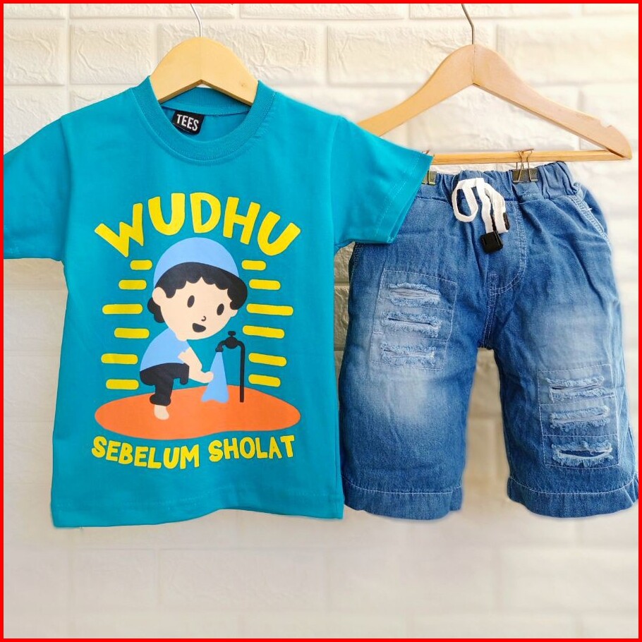 Setelan Anak Laki Laki Muslim Celana Jeans Pendek Denim 1 Tahun - 9 Tahun Baju Muslim Hijau Wudhu