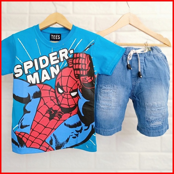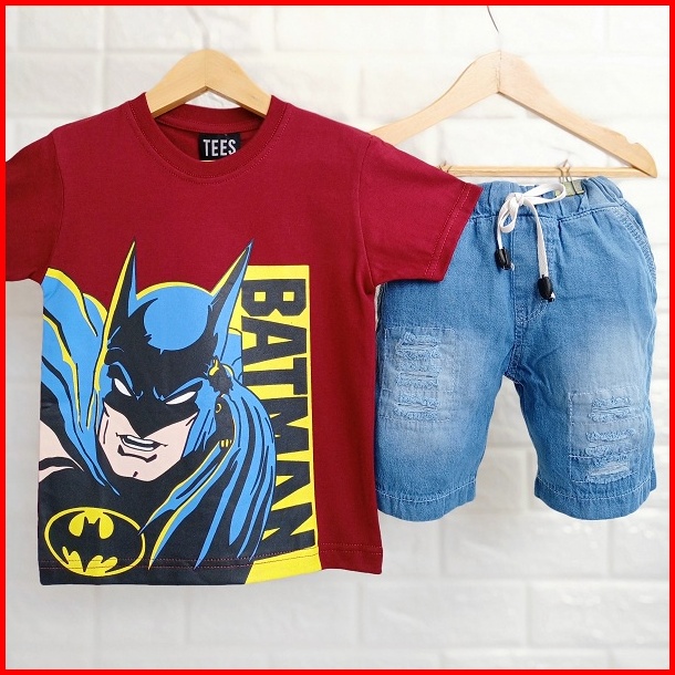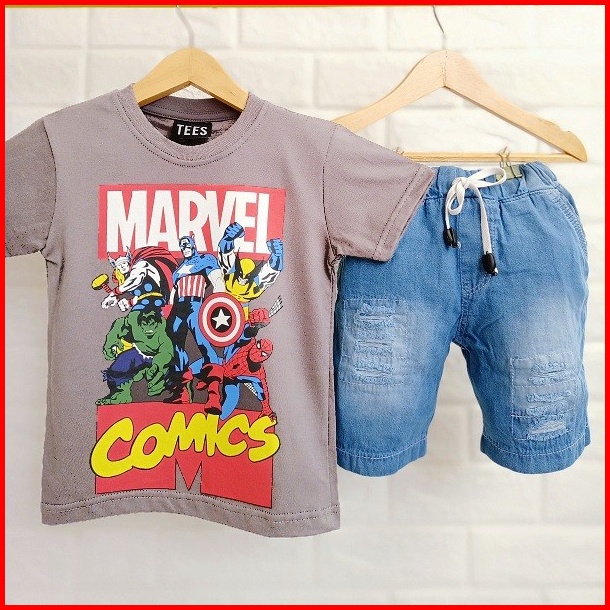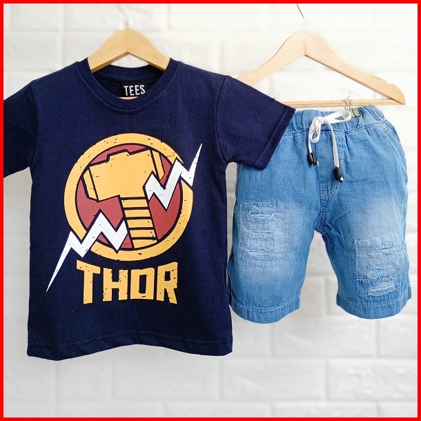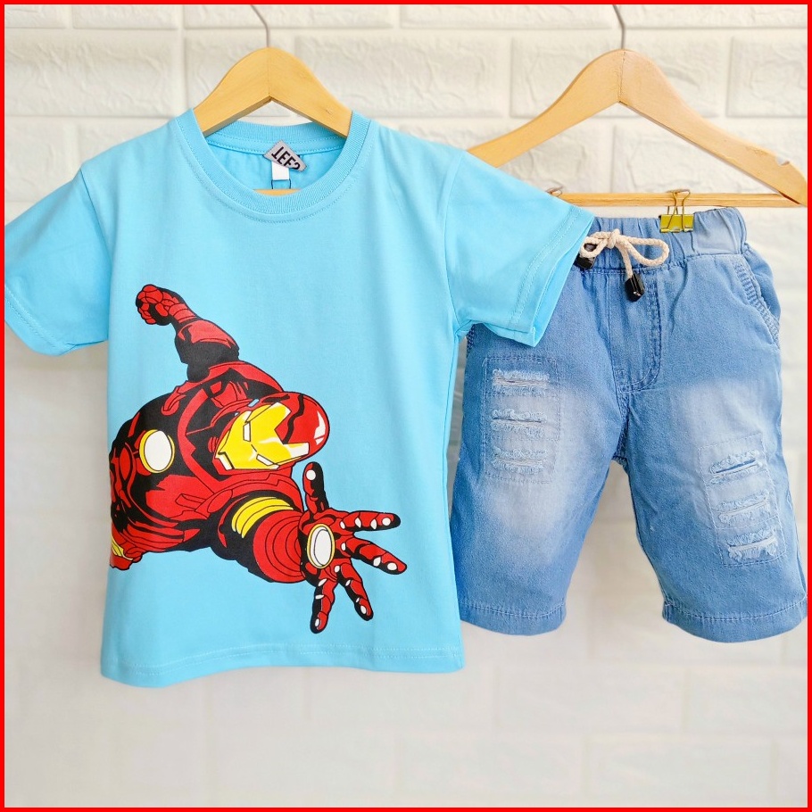 Setelan Anak Superhero Celana Pendek Denim Avenger Thor Ironman Batman Spiderman 1-9 Tahun