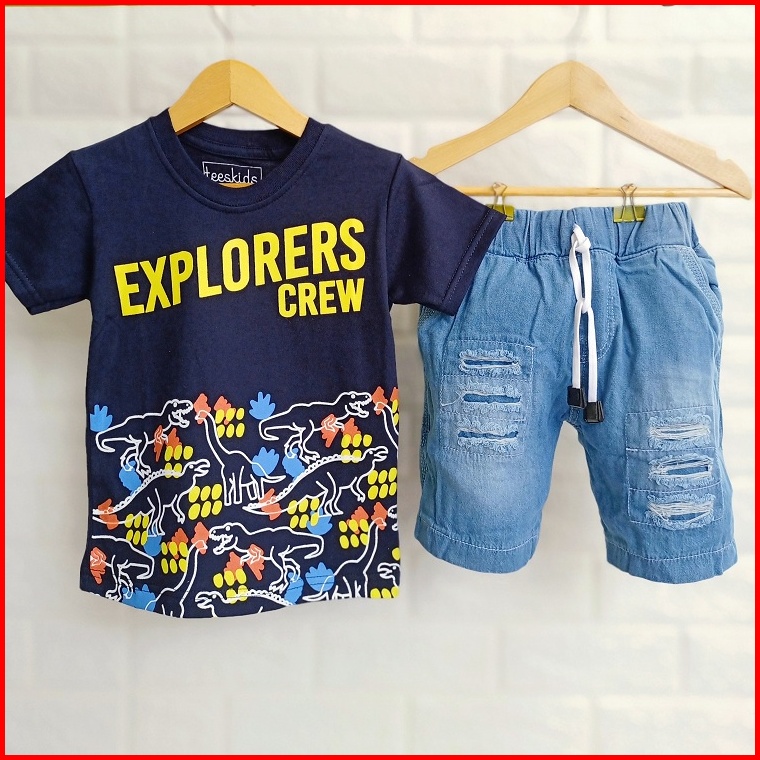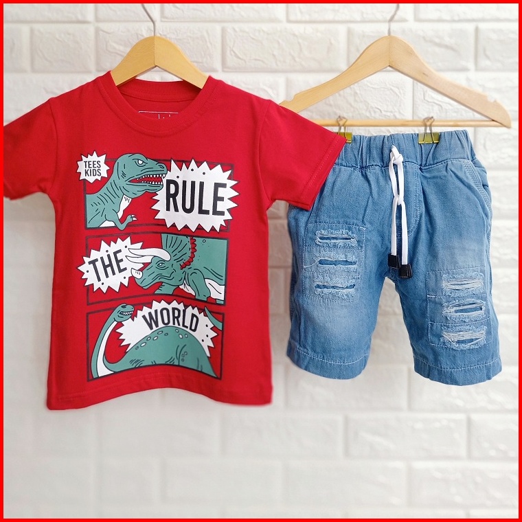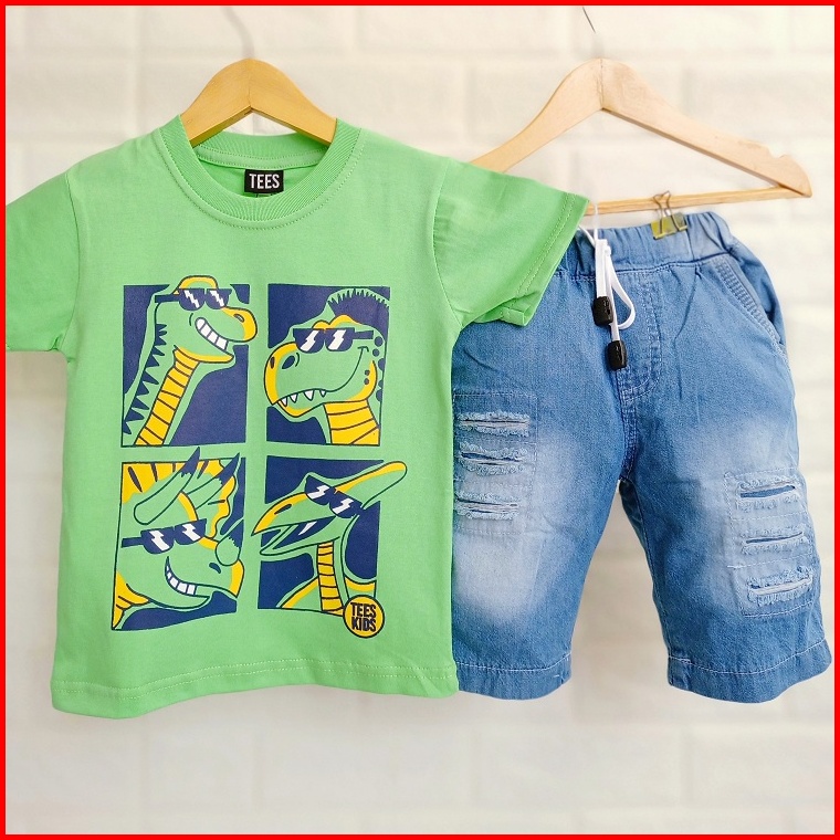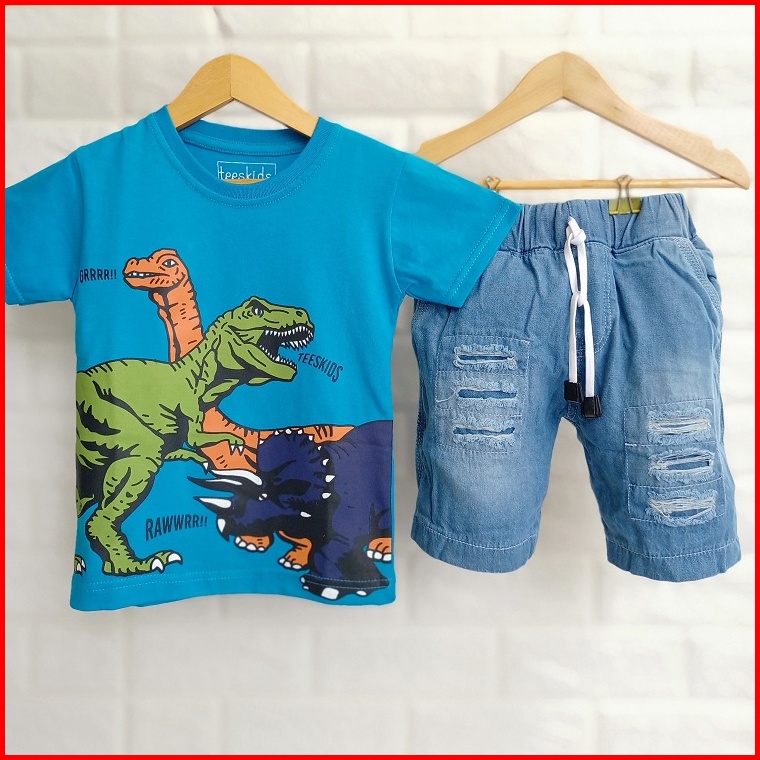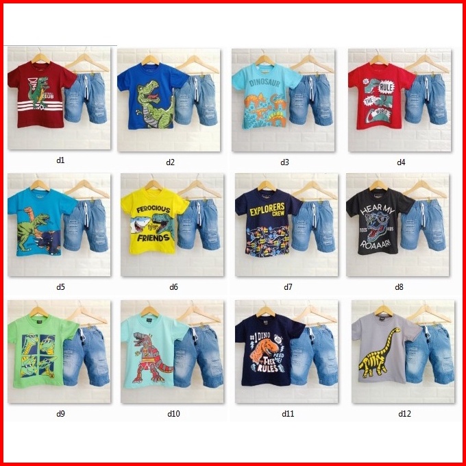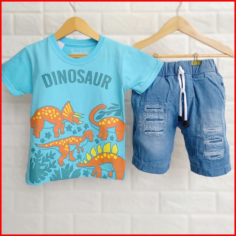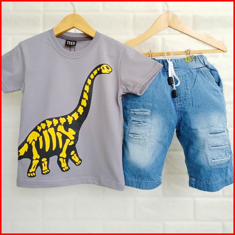 Setelan Anak Laki Laki Dino Celana Pendek Denim 1 Tahun - 9 Tahun Baju Anak Cowok