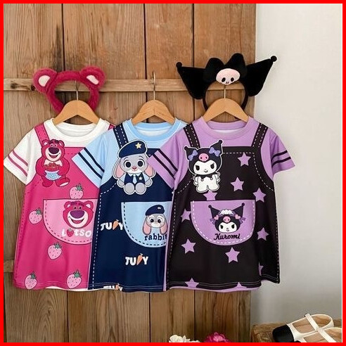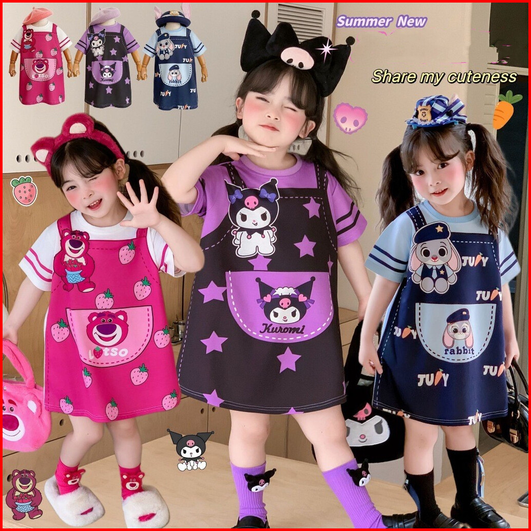 Honey.baby 1-9 Tahun Gaun T-skirt Tiga Warna Kartun Dopamin Rok Kelinci Judy Beruang Stroberi Kurome Dress Putri Yang Lu