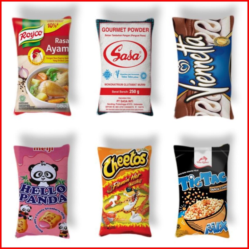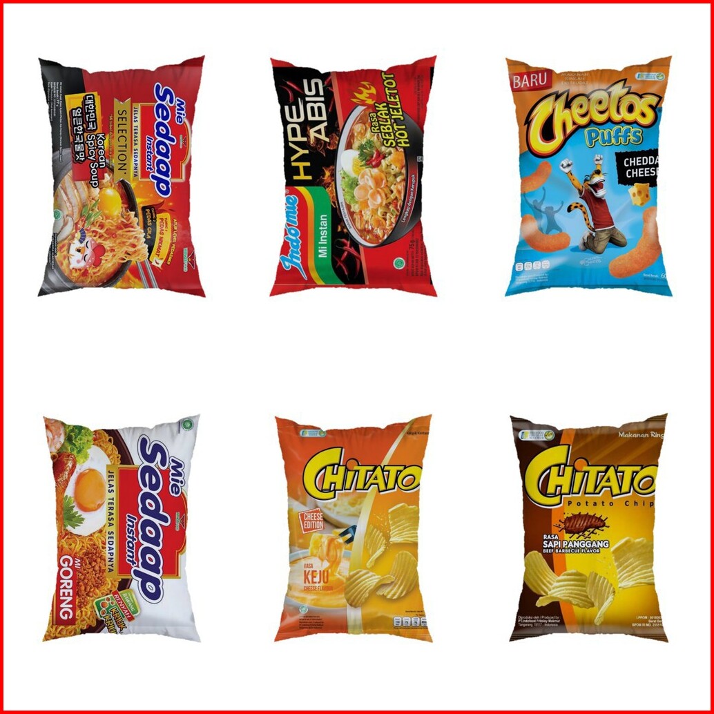yupi, pocky, feast, biskuit kelapa, oreo, samyang, kitkat, m&m, beng beng, ultramilk, kokumi, lays, indomie goreng, dairy milk, royco, sasa, hello panda, cheetos, tic-tac, vienneta, mi sedap spicy, indomie hype abis, cheetos cheese, mi sedap goreng, chitato sapi panggan