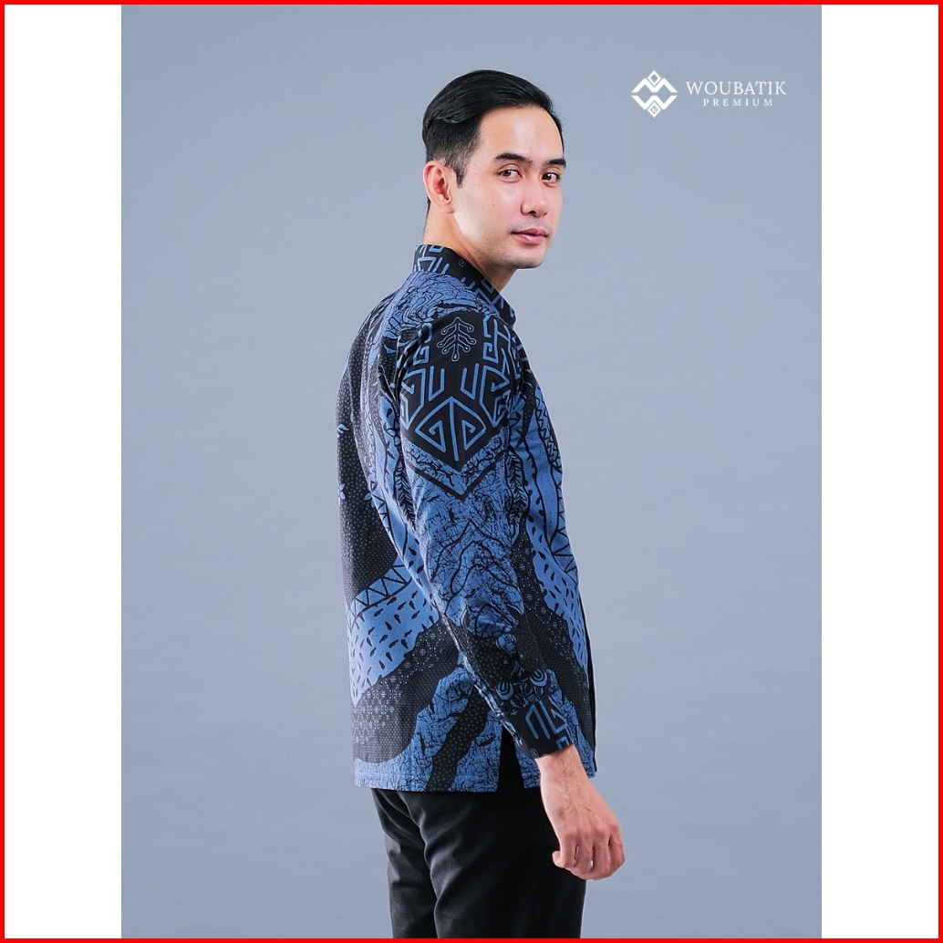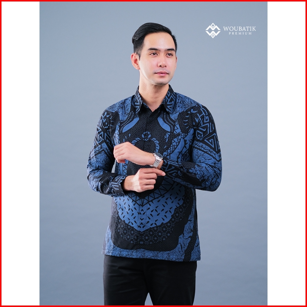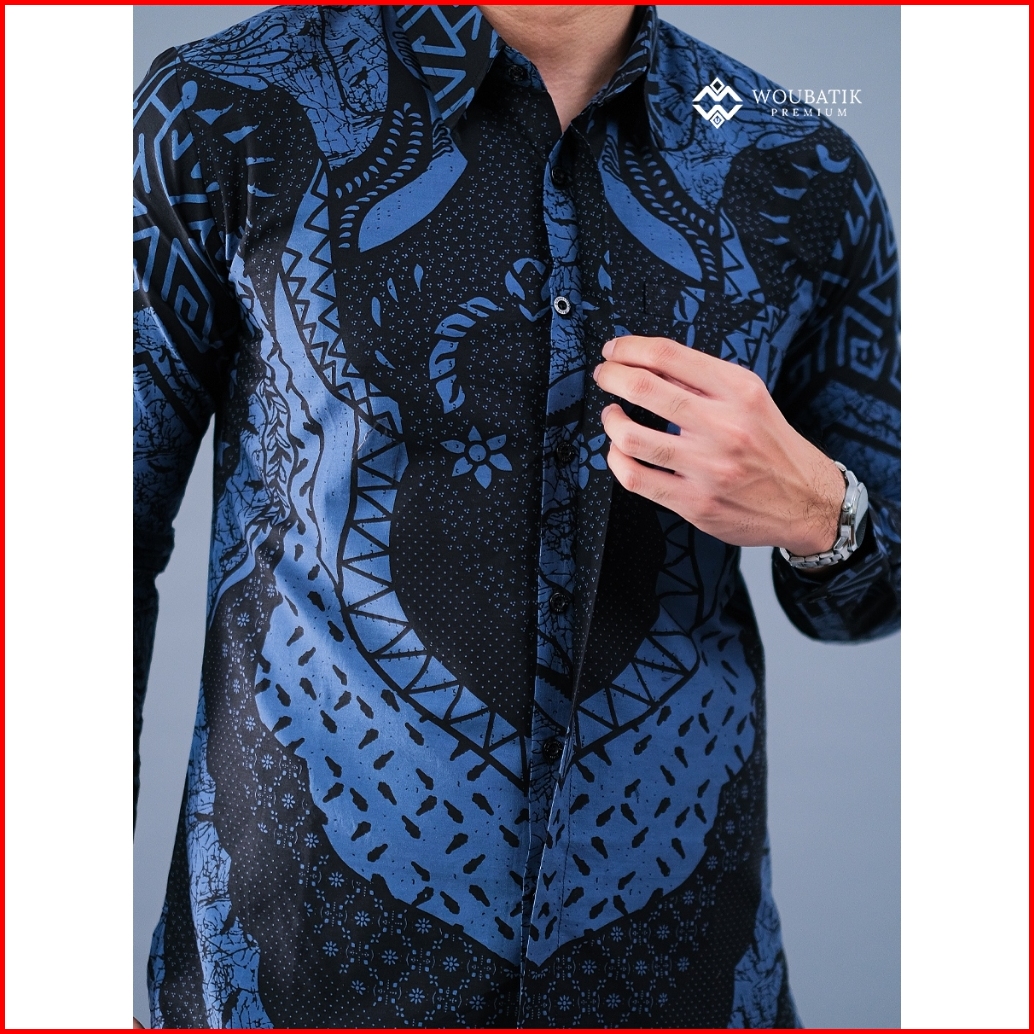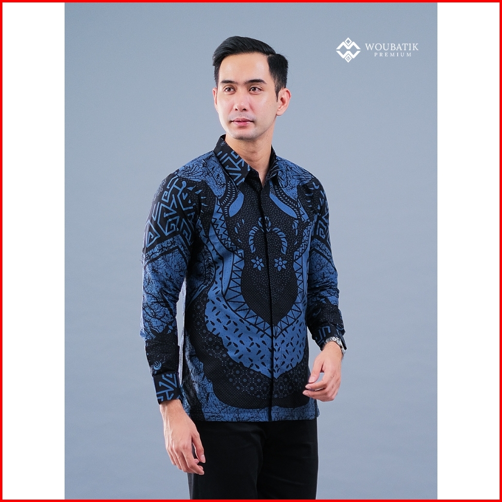 Woubatik - Kemeja Batik Pria Furing Lengan Panjang Slimfit Warna Hitam Motif Biru Blue Modern Premium Kp 401