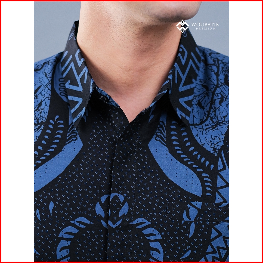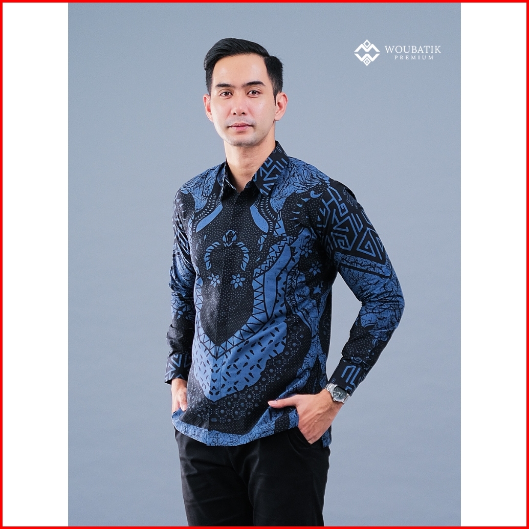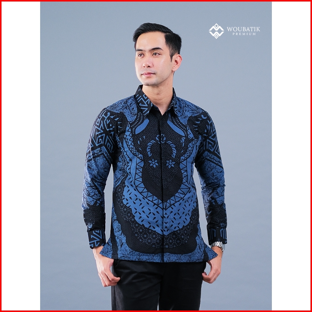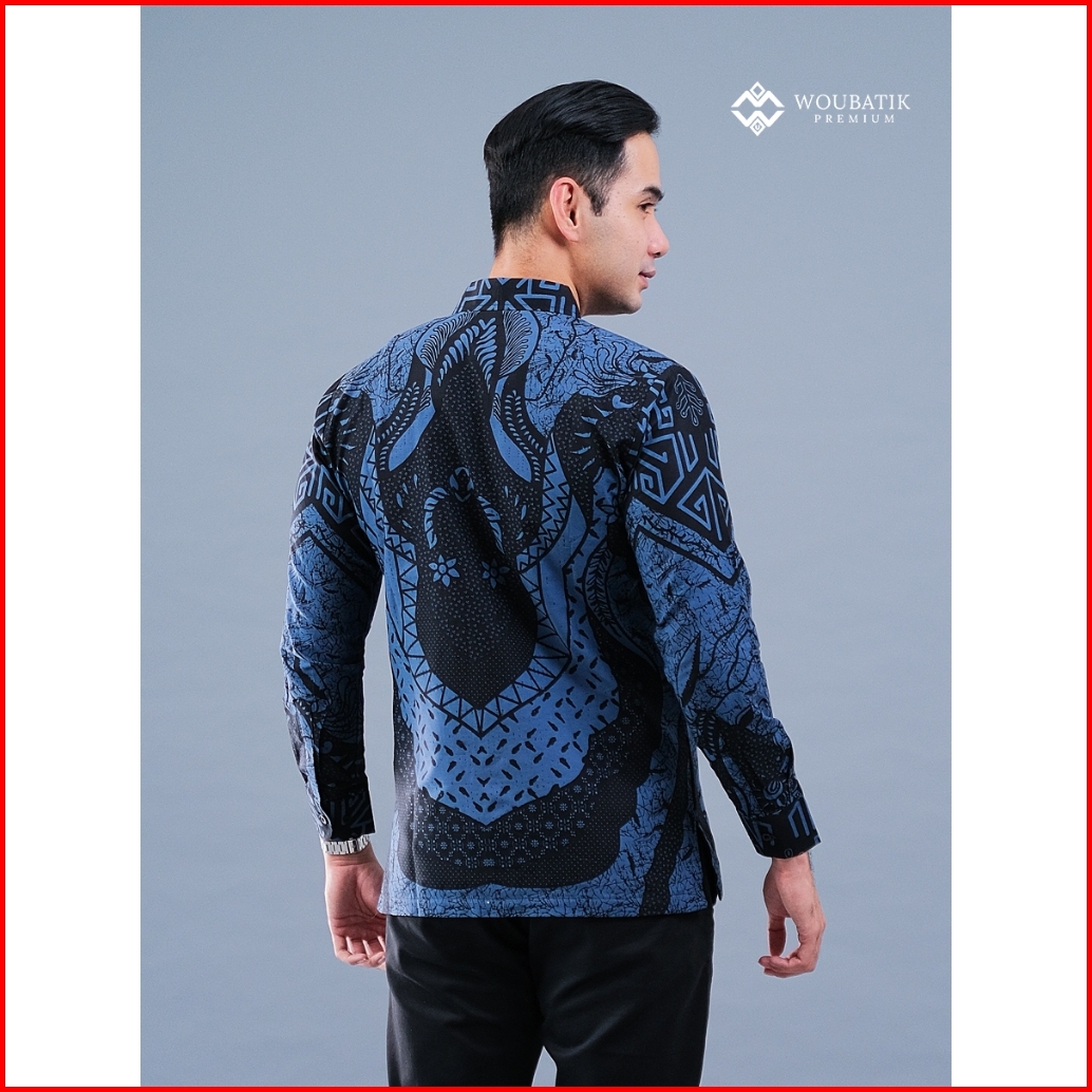 Woubatik - Kemeja Batik Pria Furing Lengan Panjang Slimfit Warna Hitam Motif Biru Blue Modern Premium Kp 401