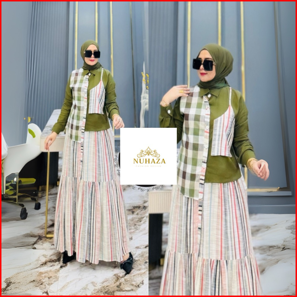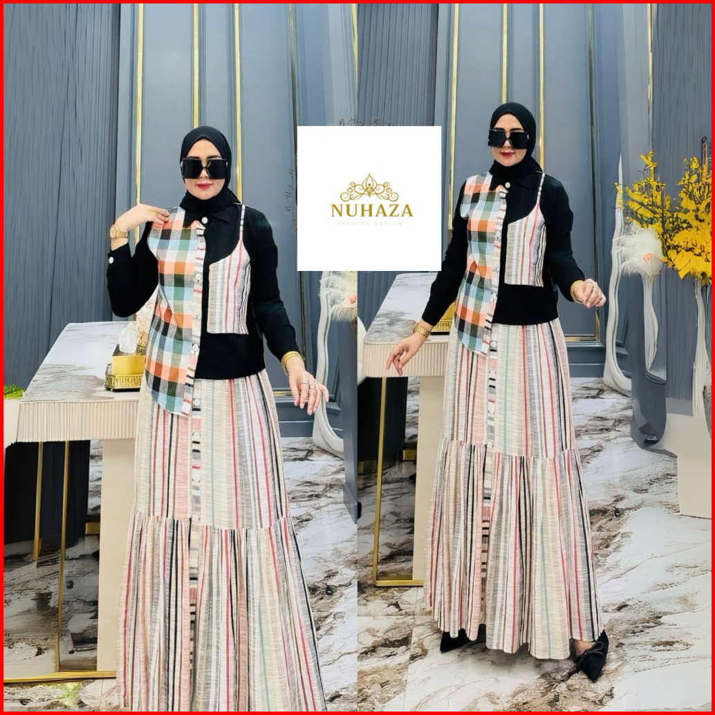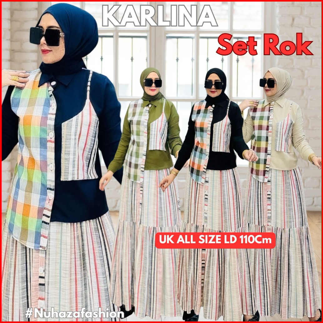 Baju Stelan Rok Set Rok Pakaian Wanita Dewasa Bahan Katun Linen Flanel Kotak Kotak Kombinasi Salur Motif Polos Warna Nav