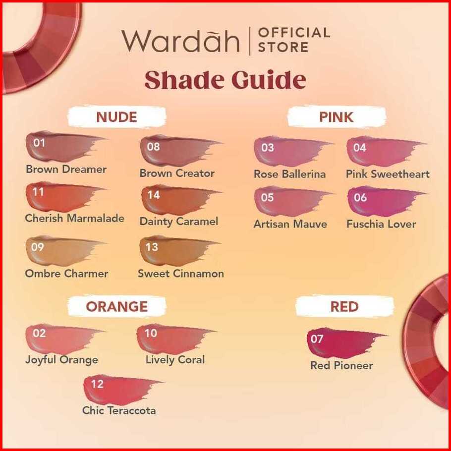 #01 Brown Dreamer, #02 Joyfull Orange, #03 Rose Ballerina, #04 Pink Sweetheart, #05 Artisan Mauve, #06 Fuchsia Lover, #07 Red Pioneer, #08 Brown Creator, #09 Ombre Charmer, #10 Lively Coral, #11 Cherish Marmalad, #12 Chic Terracota, #13 Sweet Cinnamon, #14 Dainty Caramel, #15 Traquil Hazel, #16 Rouge Passion, #17 Beyond Sunset, #18 Serene Sienna, #19 Peony Bliss, #20 Rosy Bloom, #21 Magnetic Red, #22 Poise Plum