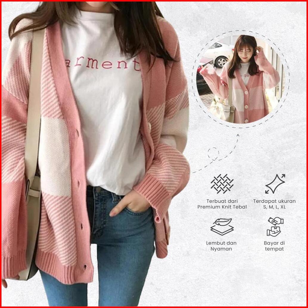 Pink Casual Kardigan Rajut Korea Style Auntumn Atasan Cardigan Premium Kekinian Motif -najahstore