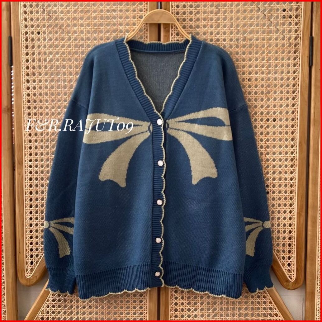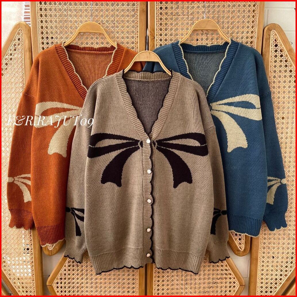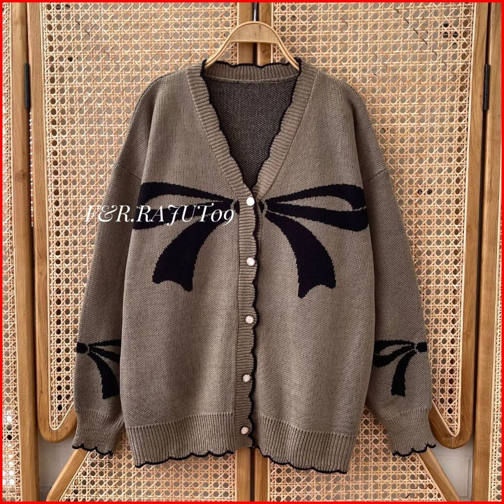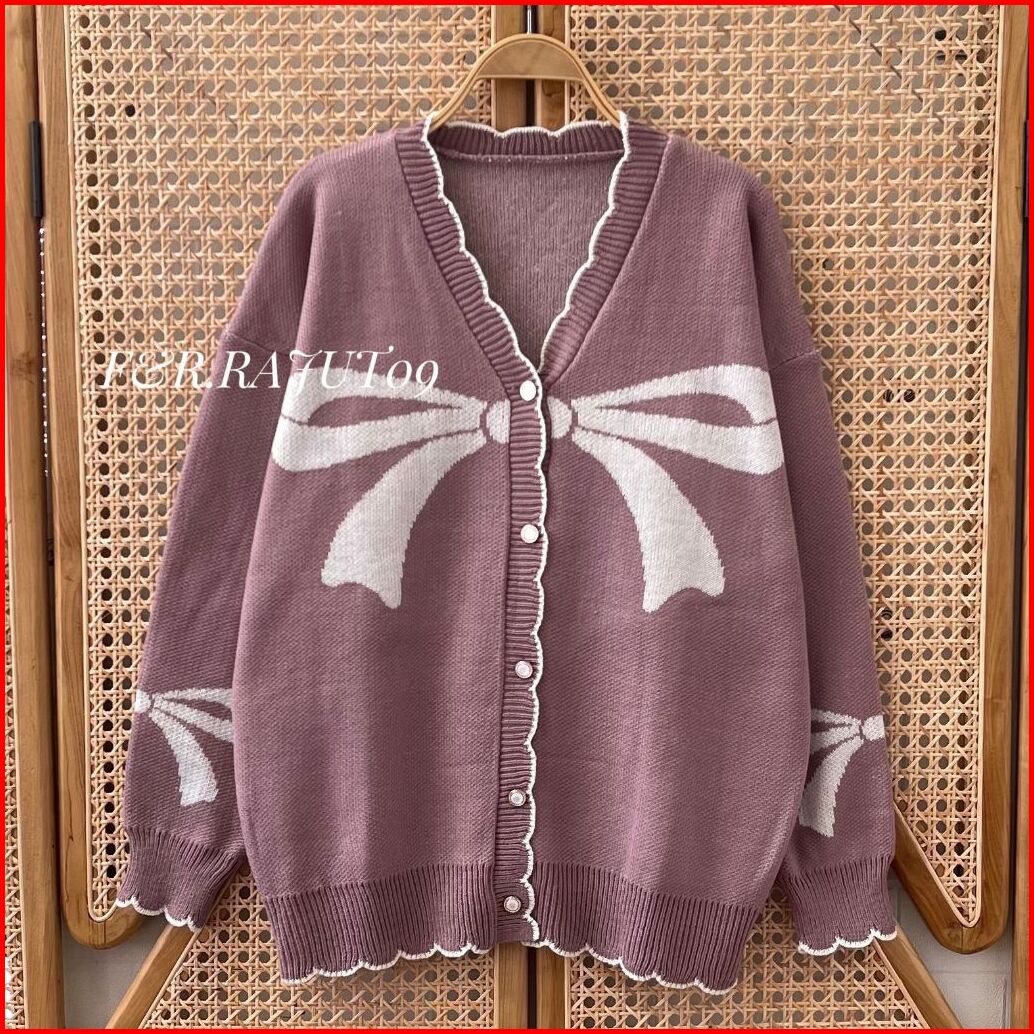 F R Ribbon Cardigan Rajut Premium Motif Pita Wanita Oversize Lengan Panjang Kekinian