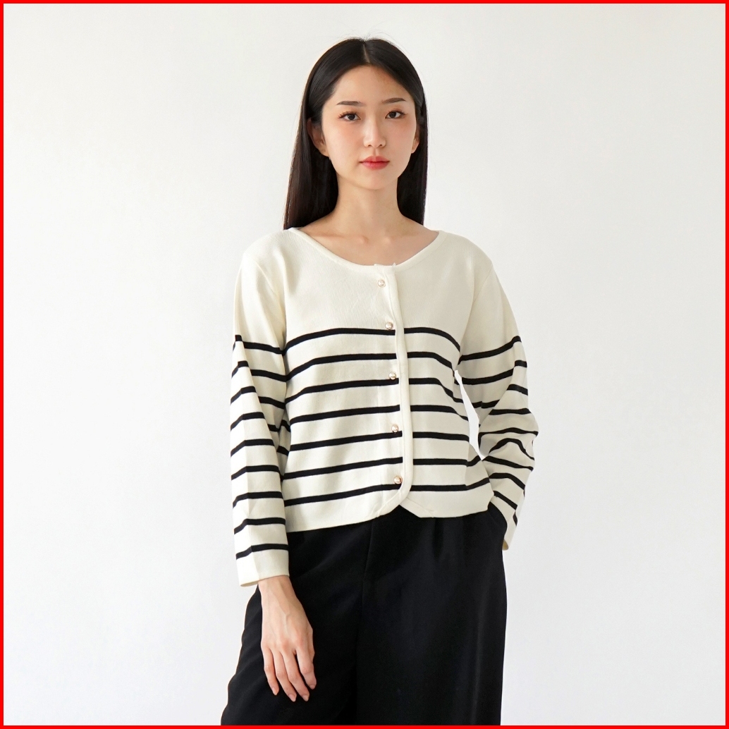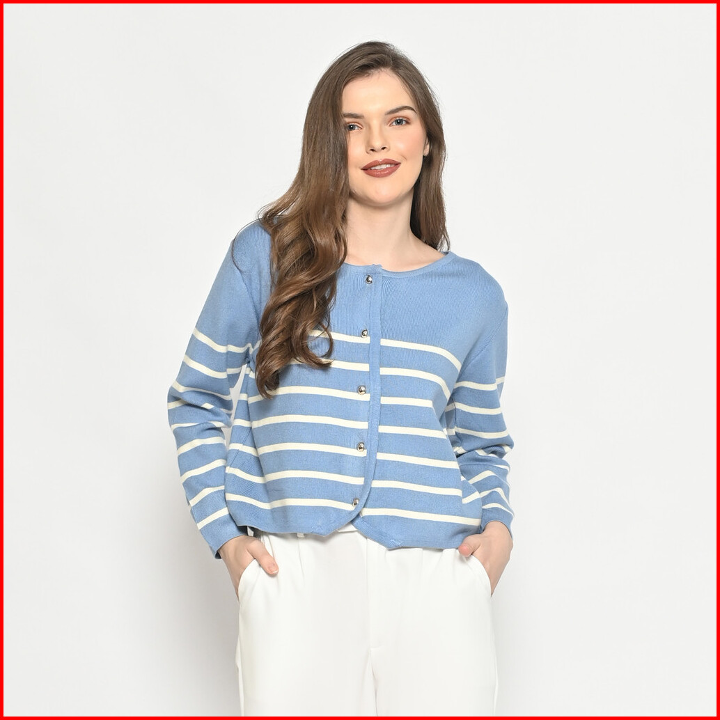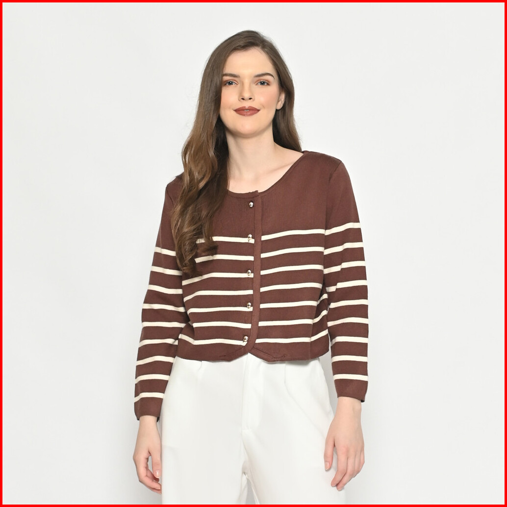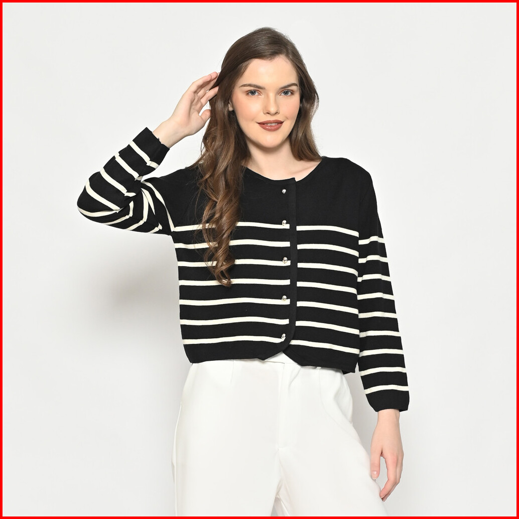 Queentin Cardigan Wanita Rajut Crop 422 Stretch Cashmere Knit Motif Salur Lengan Panjang