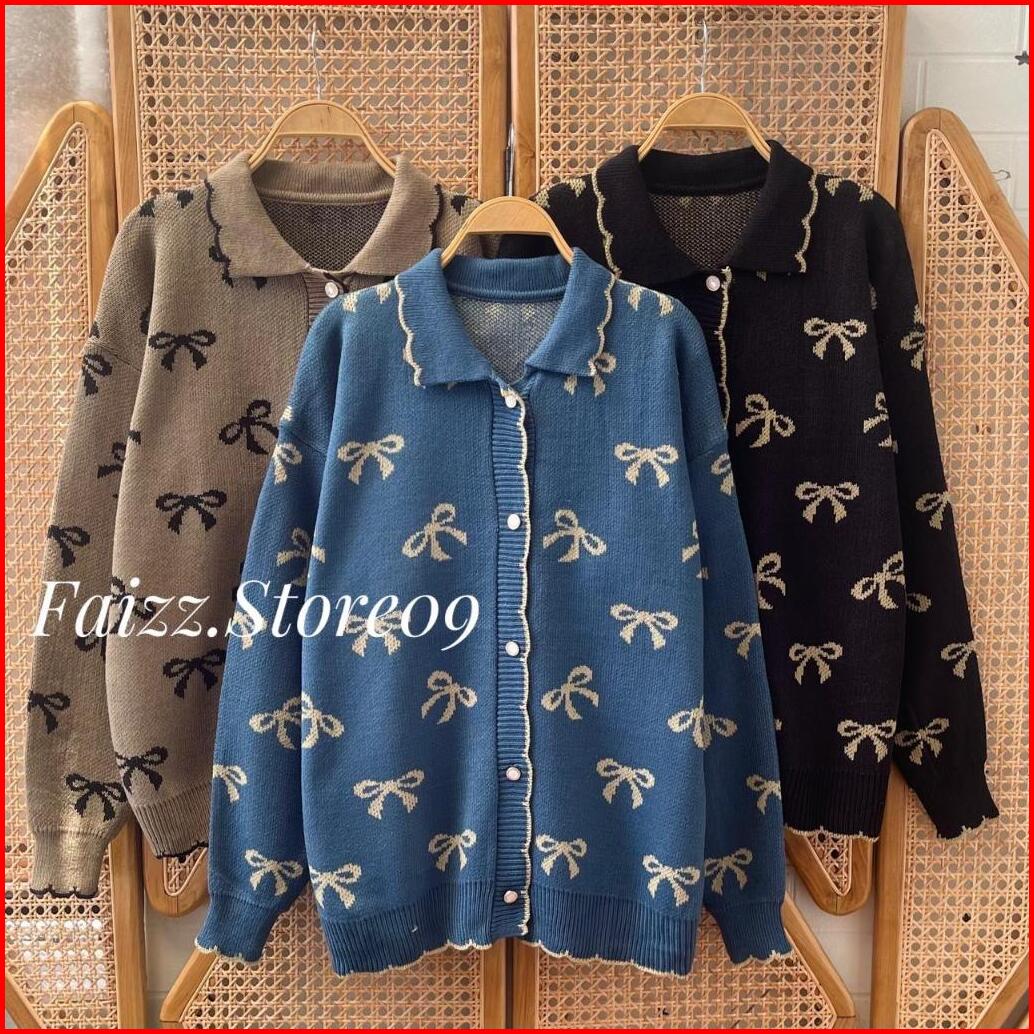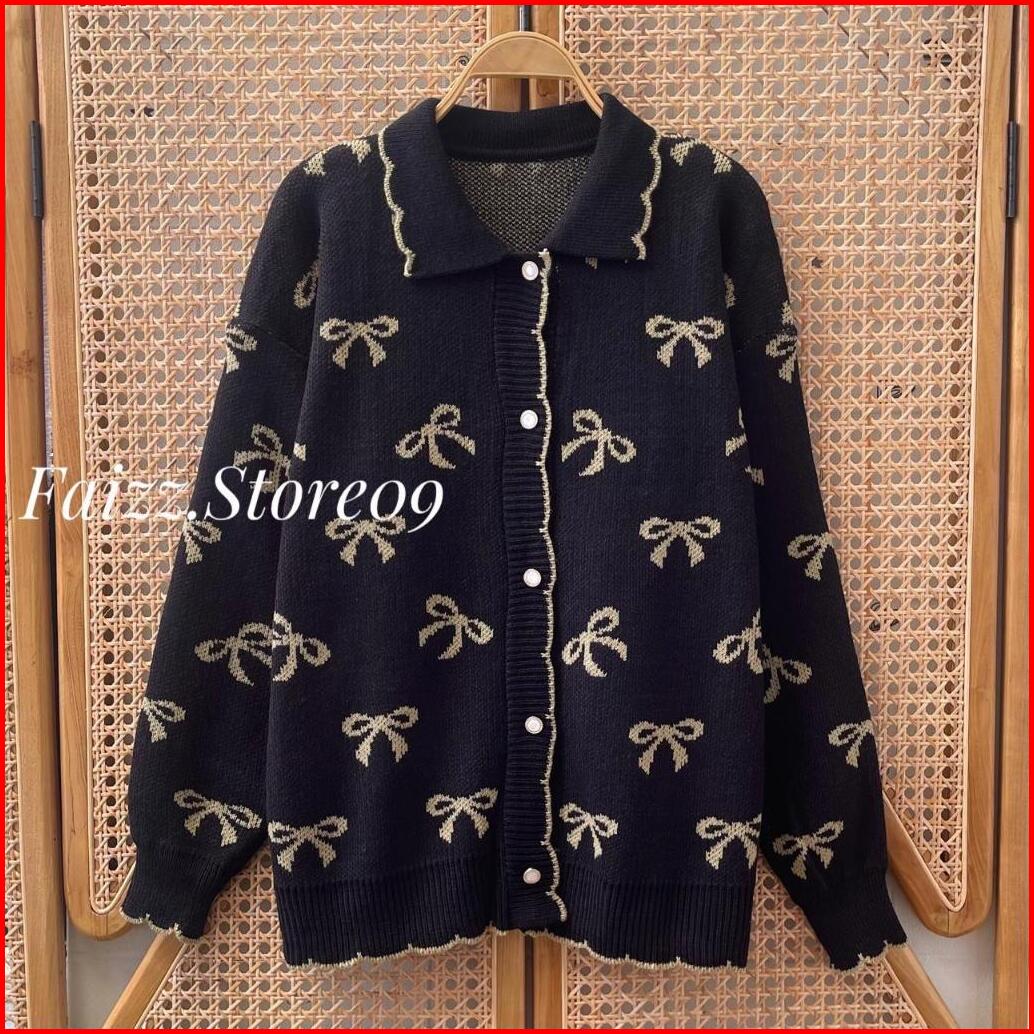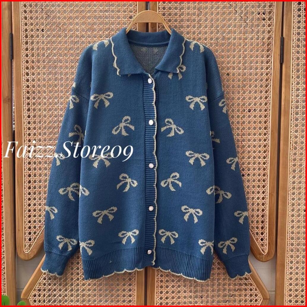 Poppy Outer Kancing - Cardigan Rajut Oversize Berkerah Motif Pita Atasan Korean Style Wanita Premium