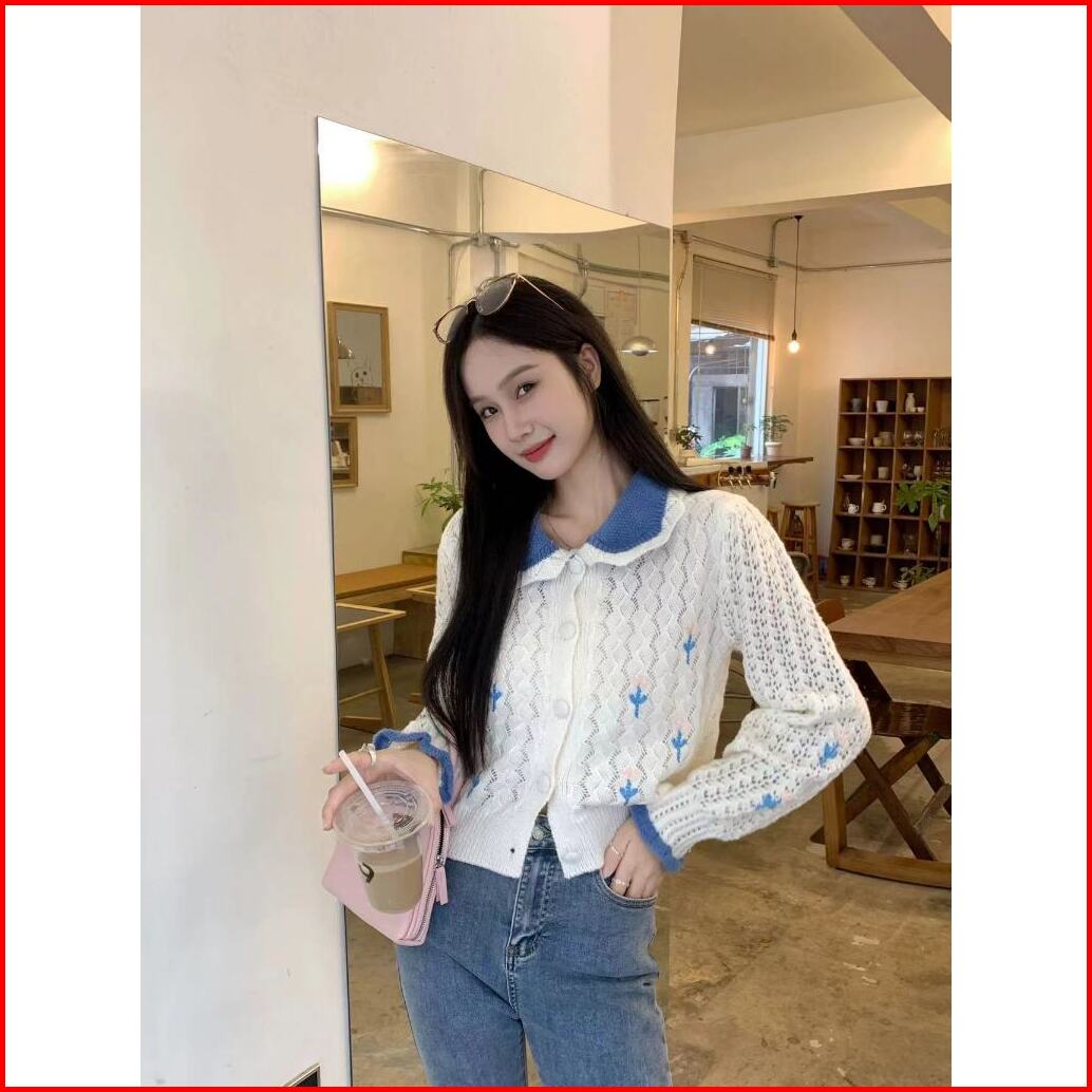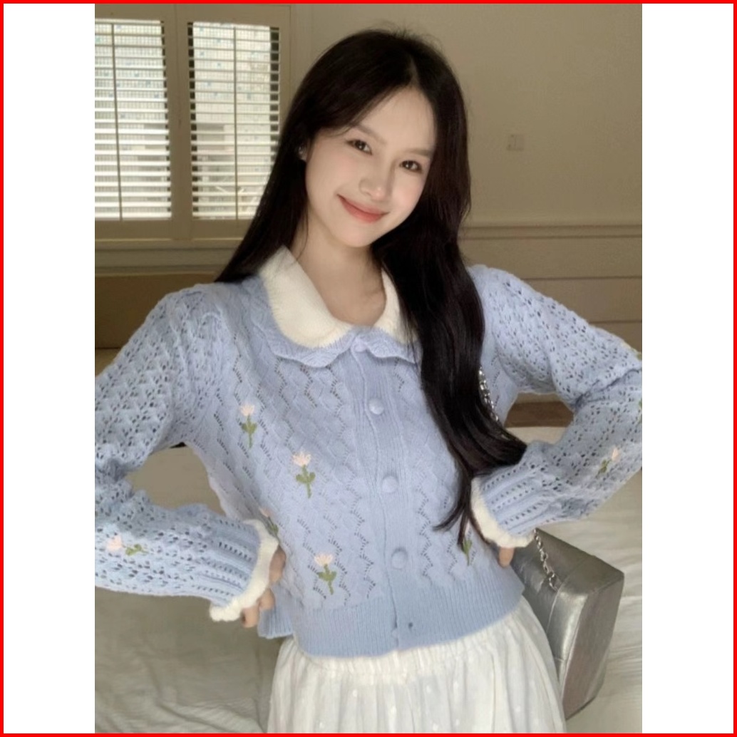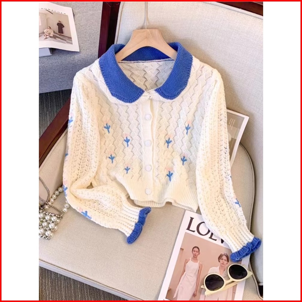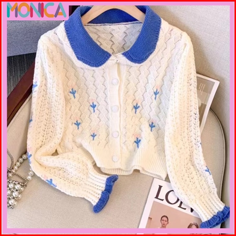 Monica Cardigan Sweater Rajut Peony Flower Sailor Korean Knitwear Wol Santai Slim-fitting Polos Bunga Setrip