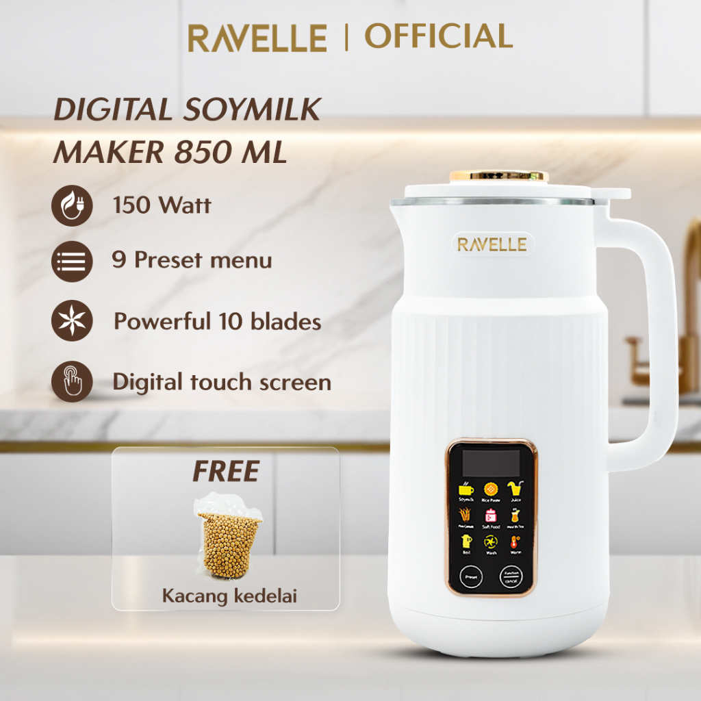 RAVELLE Digital Soymilk Maker 850ml 9 in 1 - Mesin Multifungsi Pembuat Susu Kacang Kedelai tanpa Disaring | Soy Milk, Al