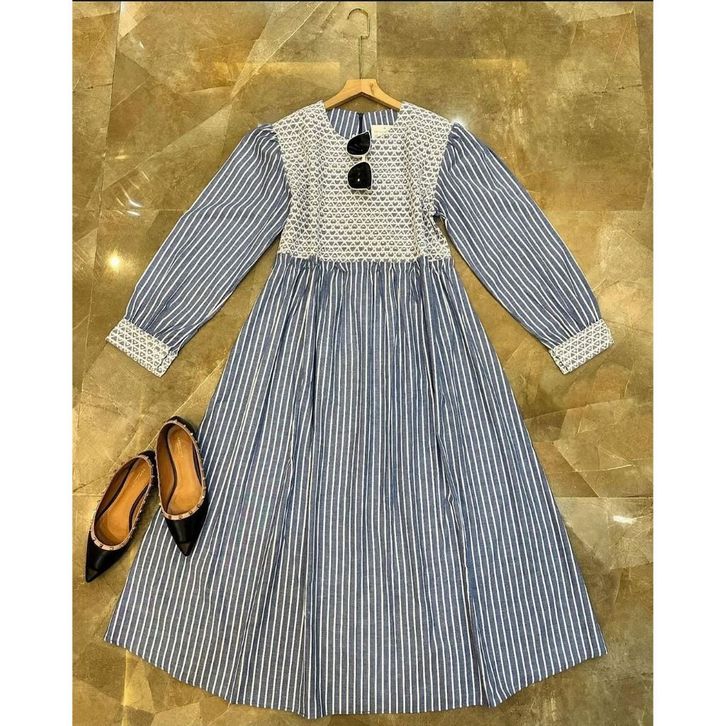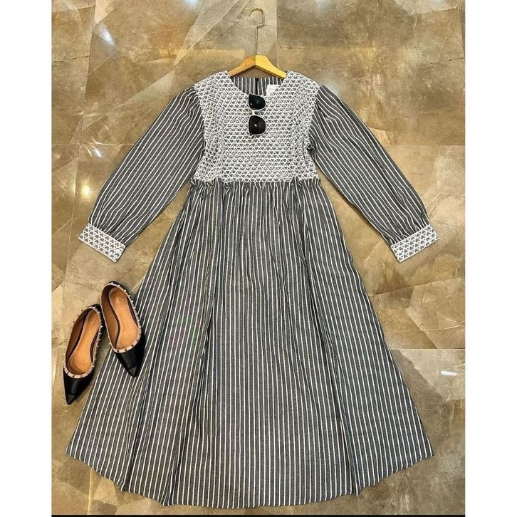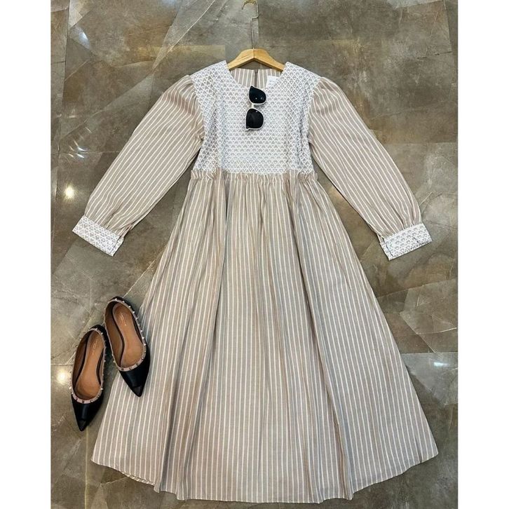 Depira Midi Dress Bahan Katun Salur Dress Korean Style Baju Gamis Lebaran 2024 Gamis Terbaru ELF