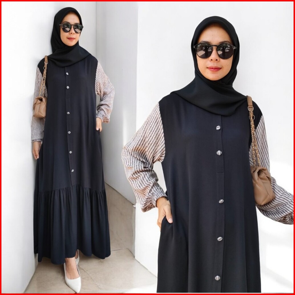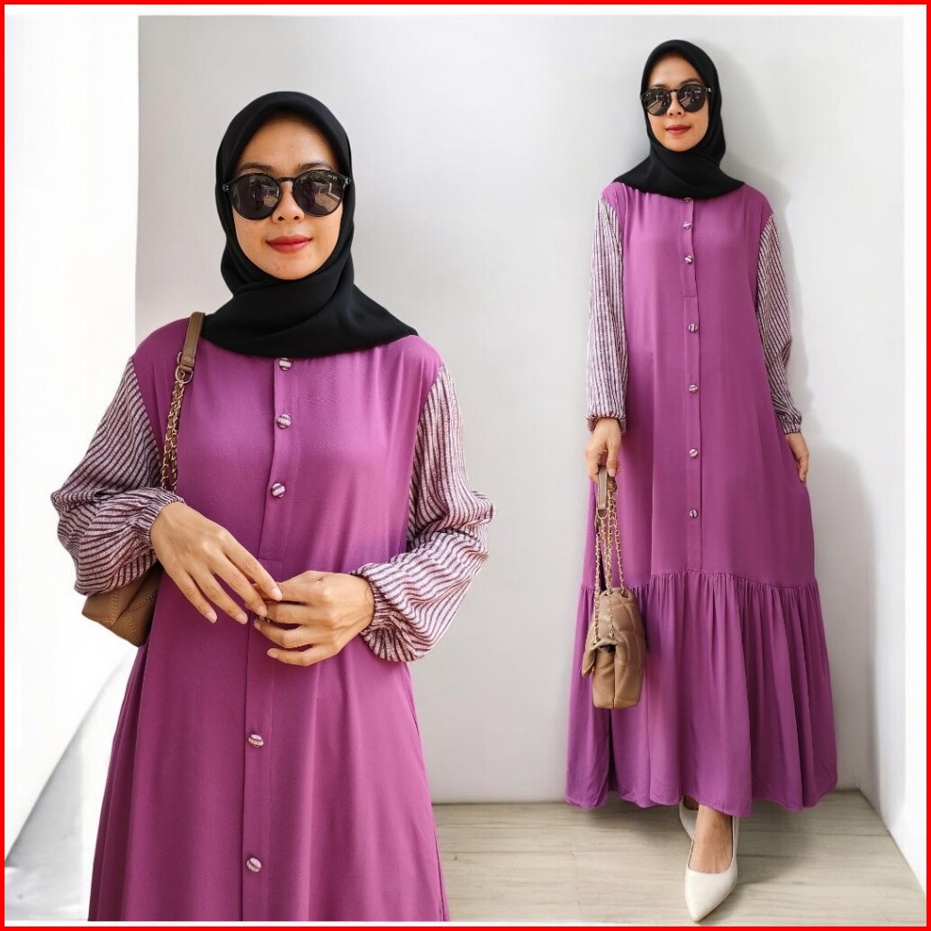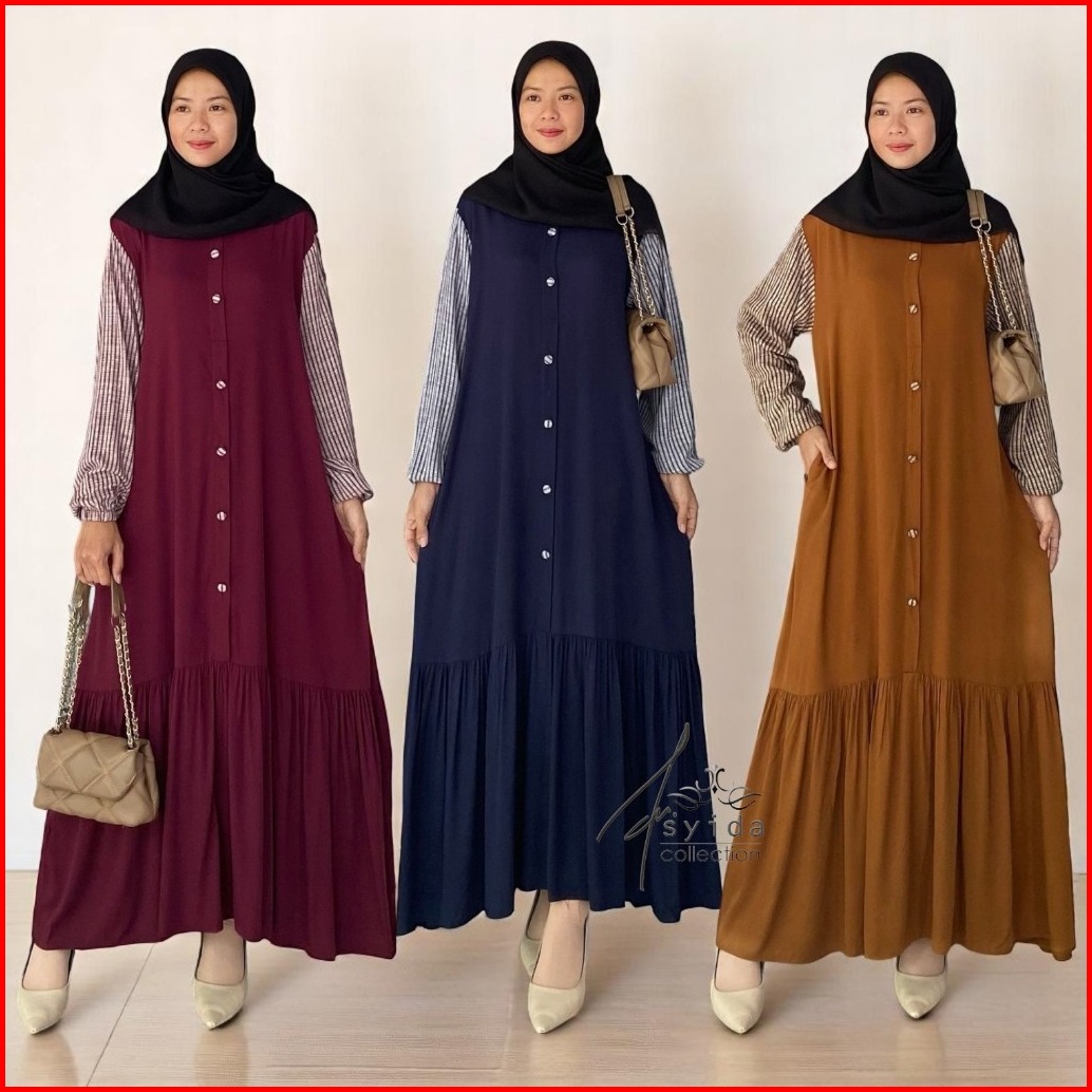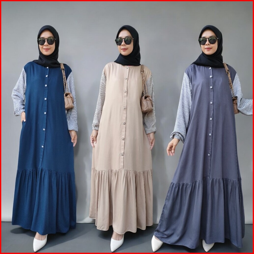 Gamis Rayon Twill Mix Rayon Salur Full Kancing Depan Model Terbaru Adeeva