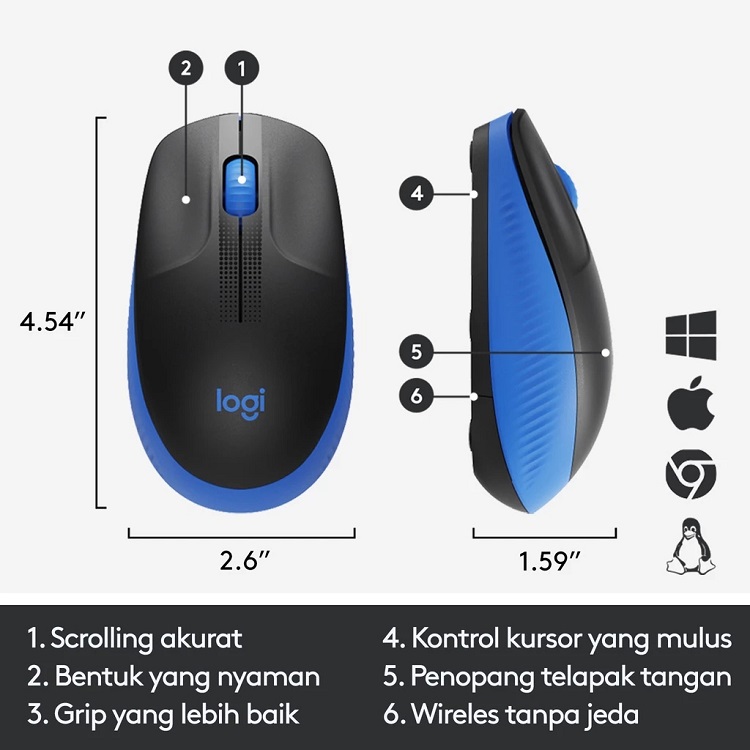 Logitech M190 Mouse Wireless Full Size untuk Windows, Mac, Chrome OS & Linux - Blue