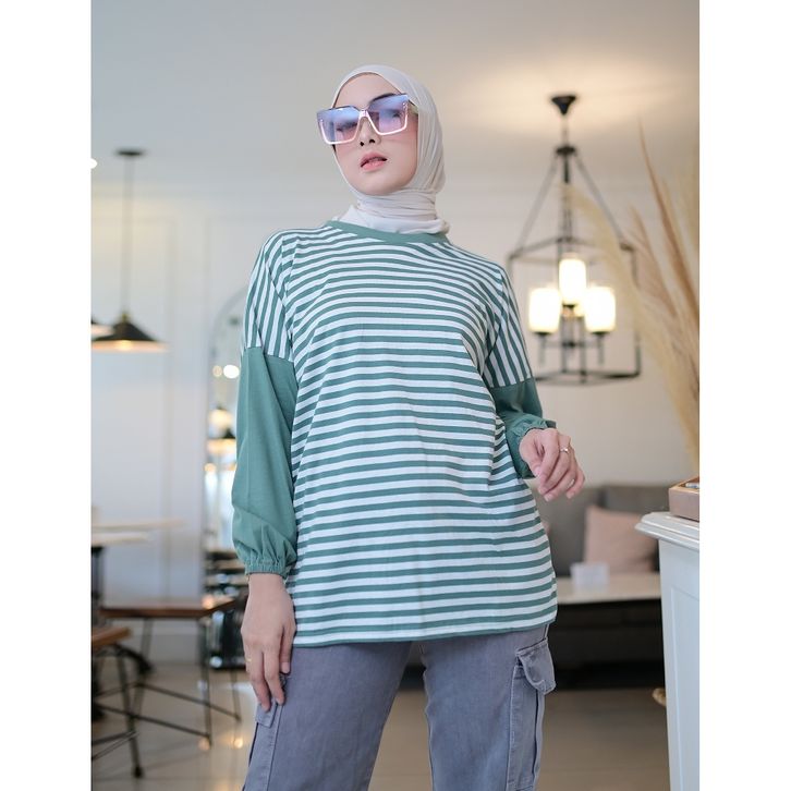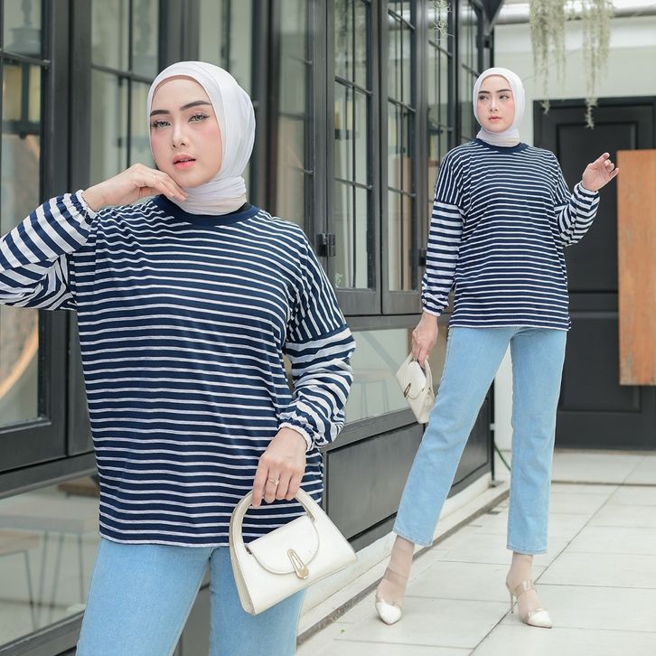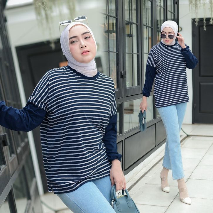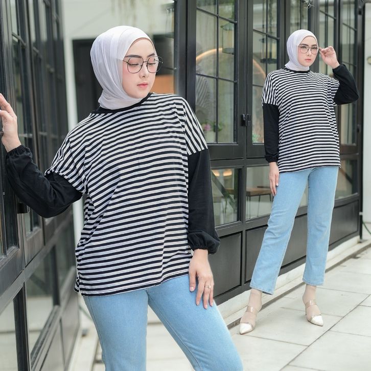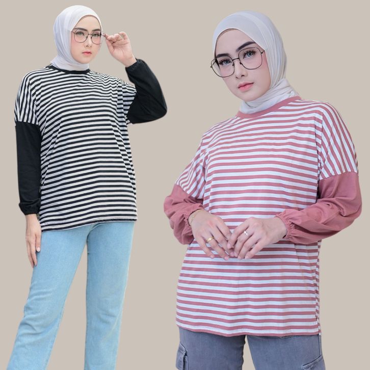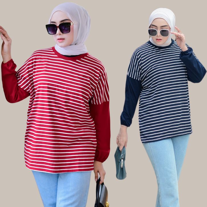 Kaos Atasan Blouse Wanita Lengan Panjang Muslimah Katun Kombet Bianca Stripes Mixed Top TERLARIS