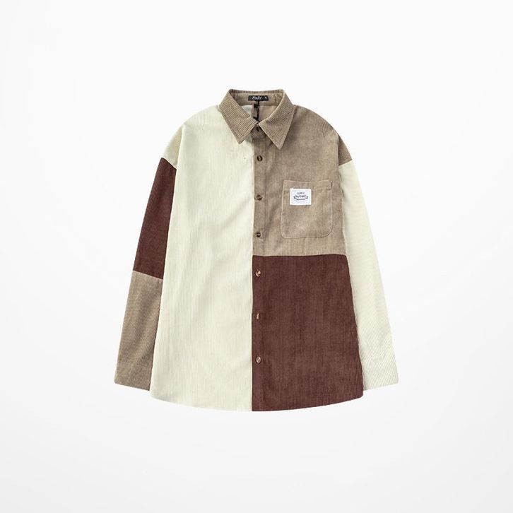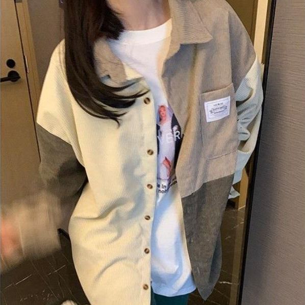 S-4XL Kemeja Korduroi Wanita Gaya Korea Retro Blok Warna Atasan Lengan Panjang TERLARIS