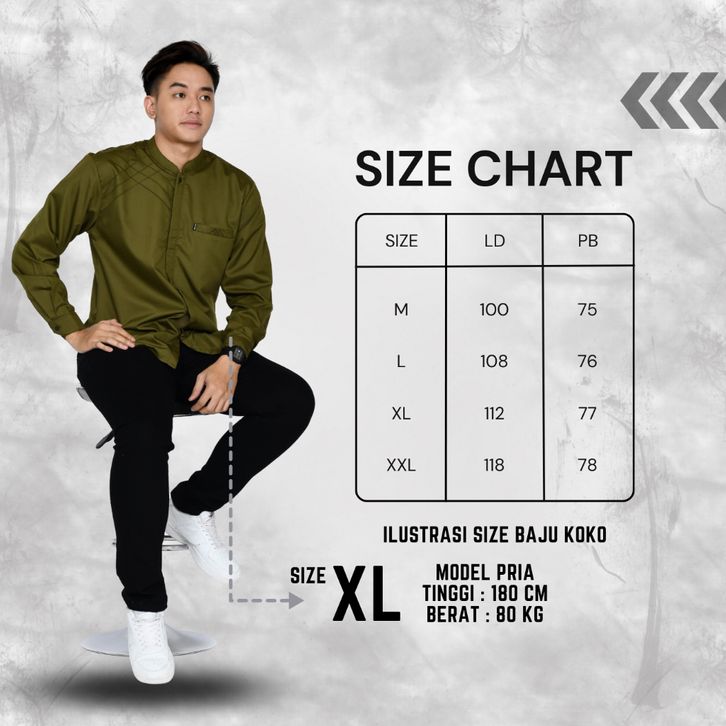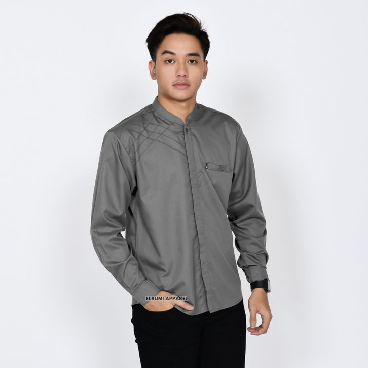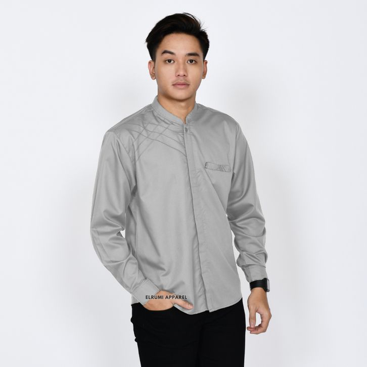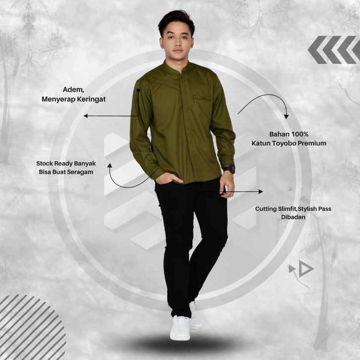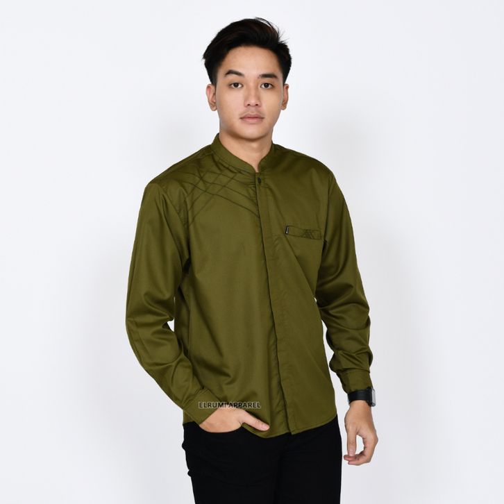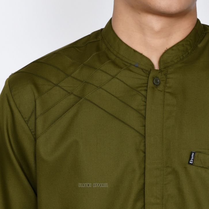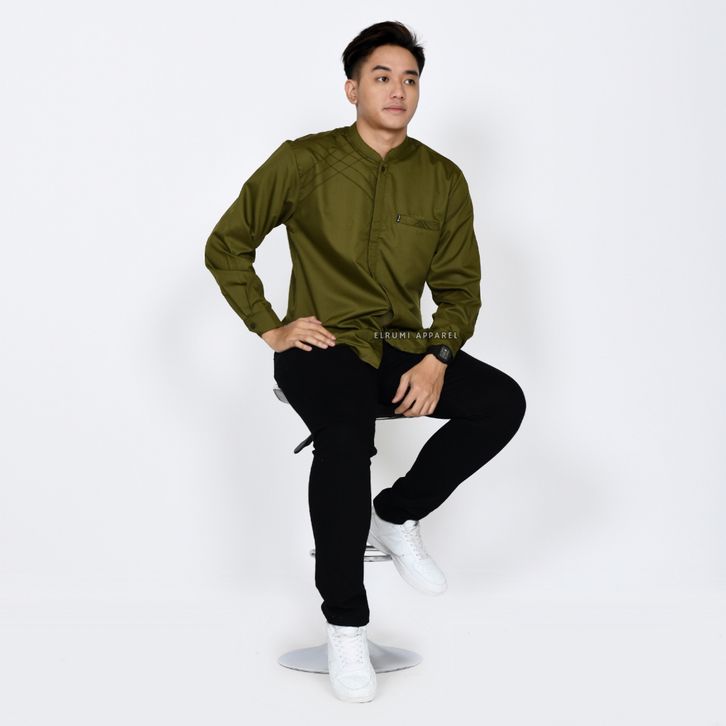 Baju Koko Pria Dewasa Lengan Panjang Warna Olive Motif Signature Original Elrumi