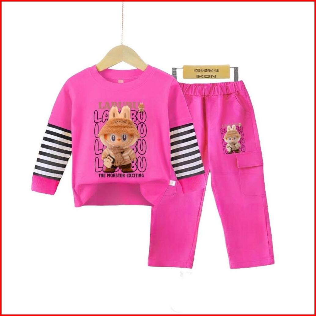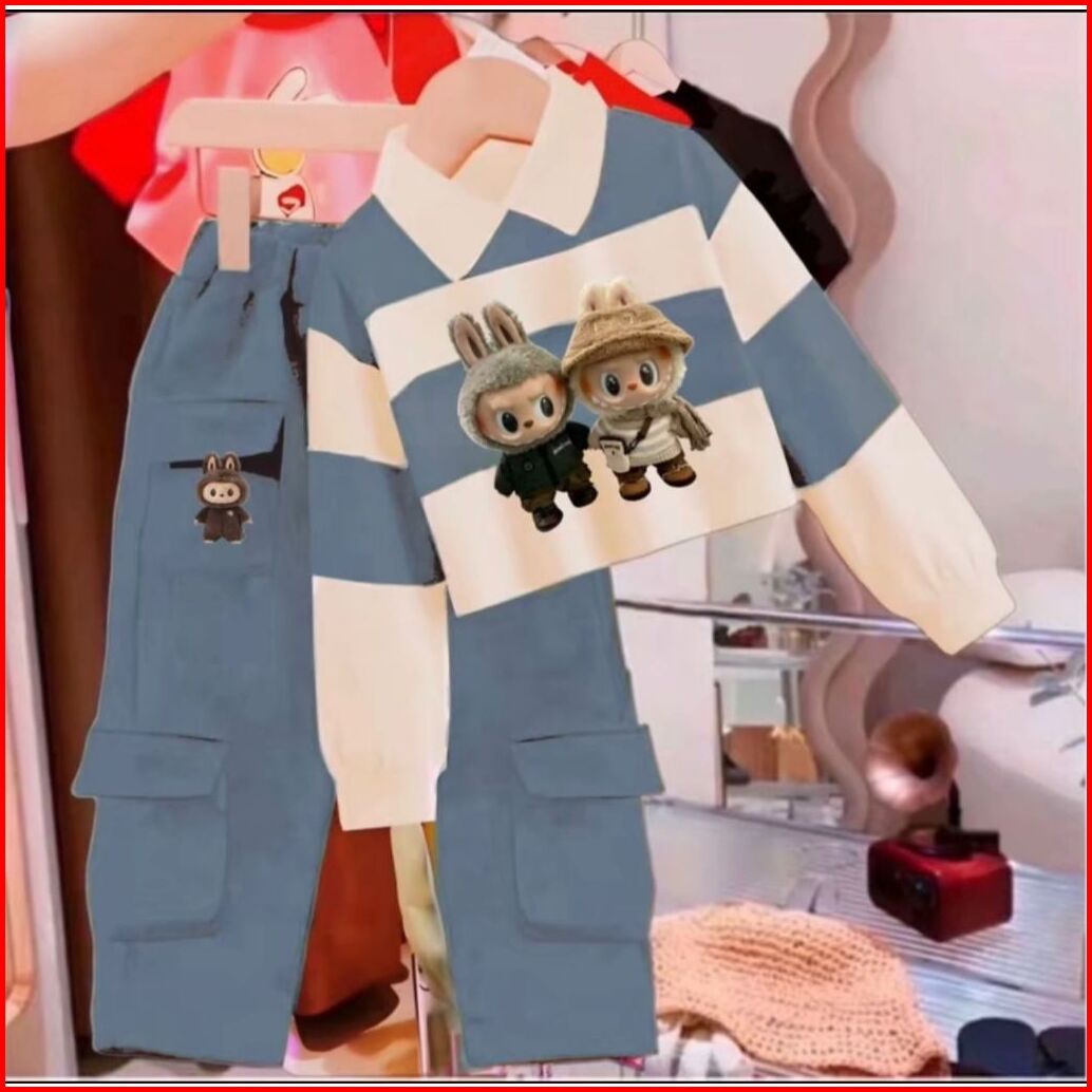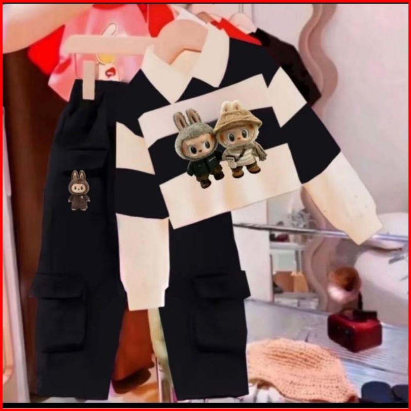 Setelan Terlaris Baju Anak Perempuan Model Labubu Setrip Kargo Untuk Anak 3-12 Tahun Setelan Anak Murah
