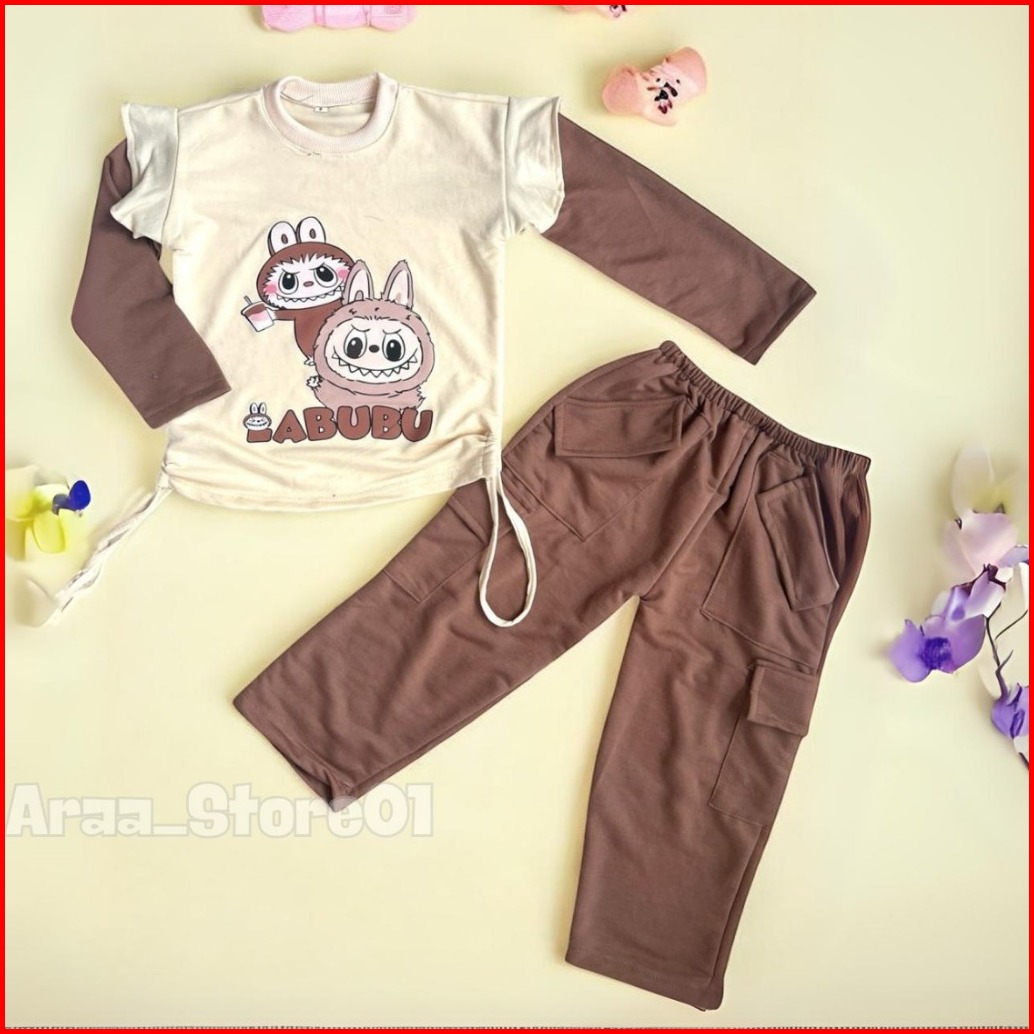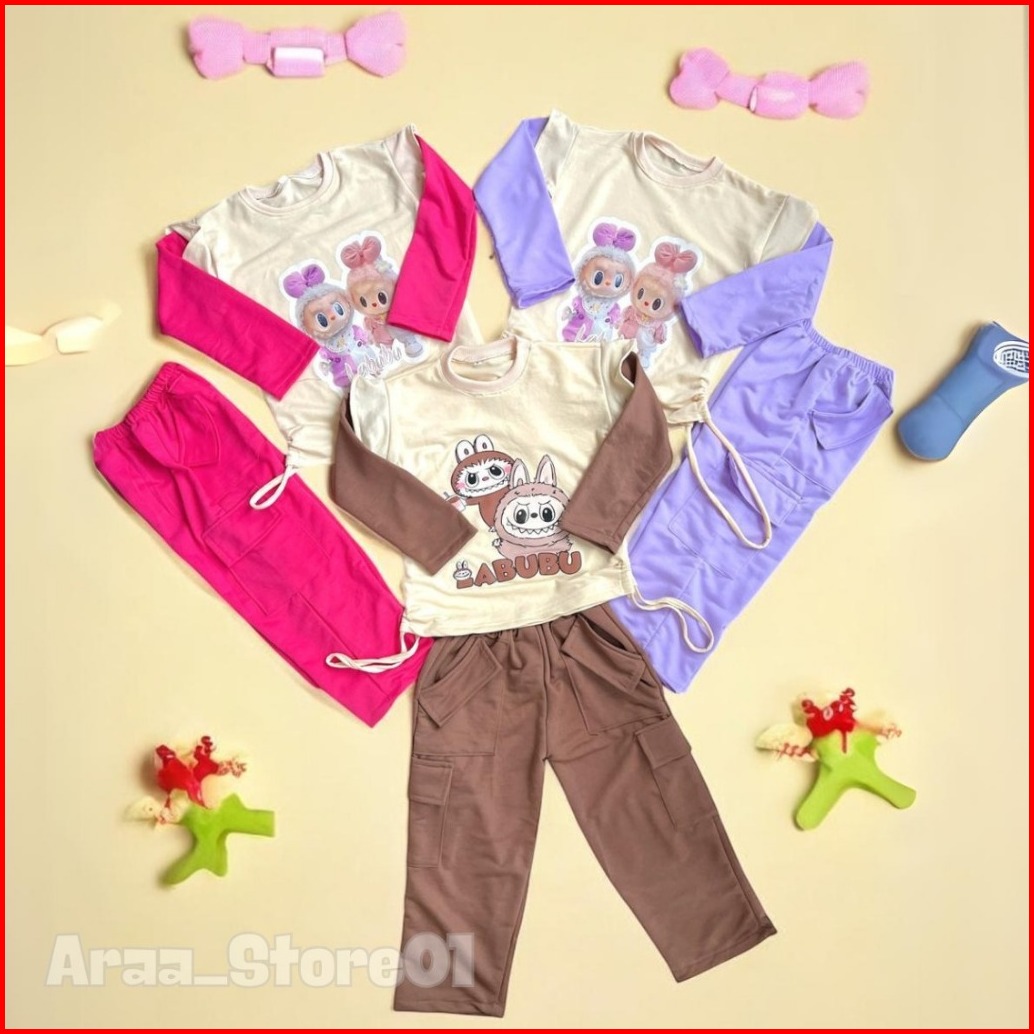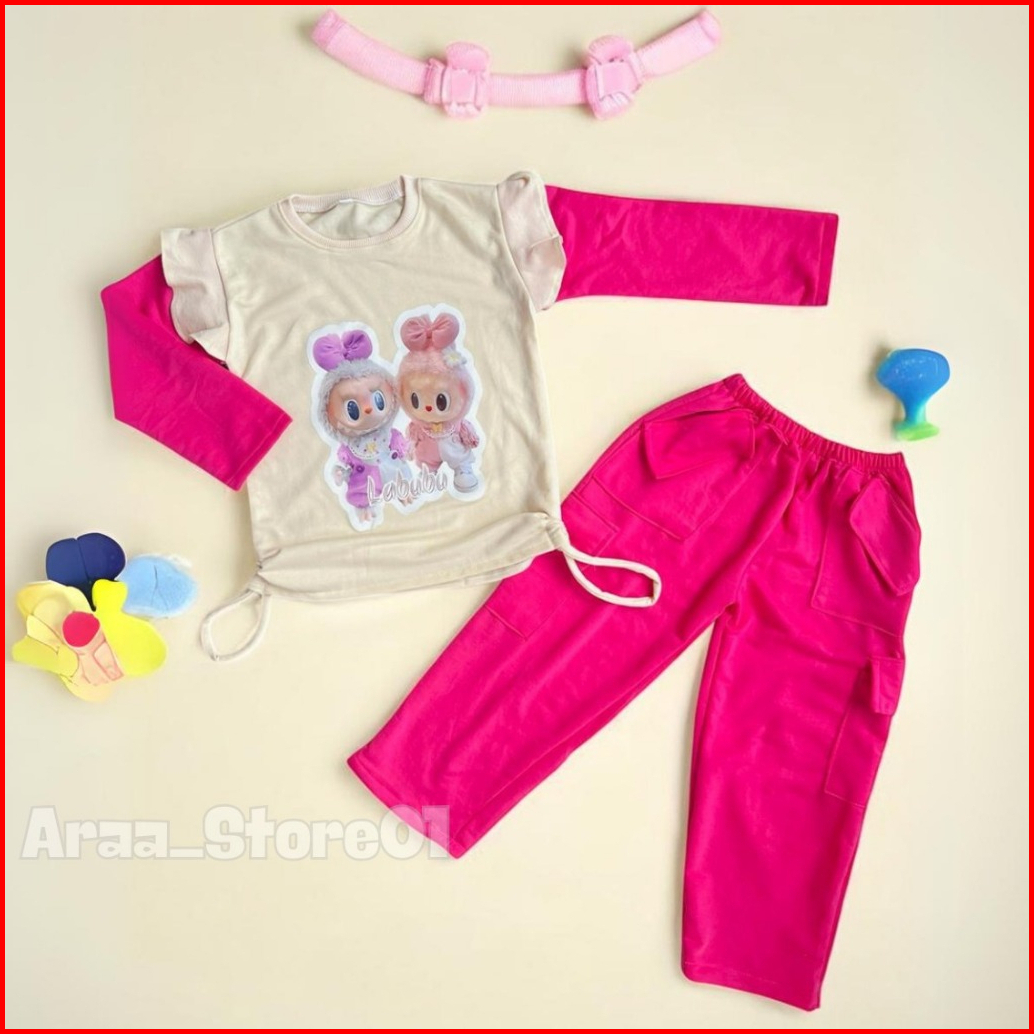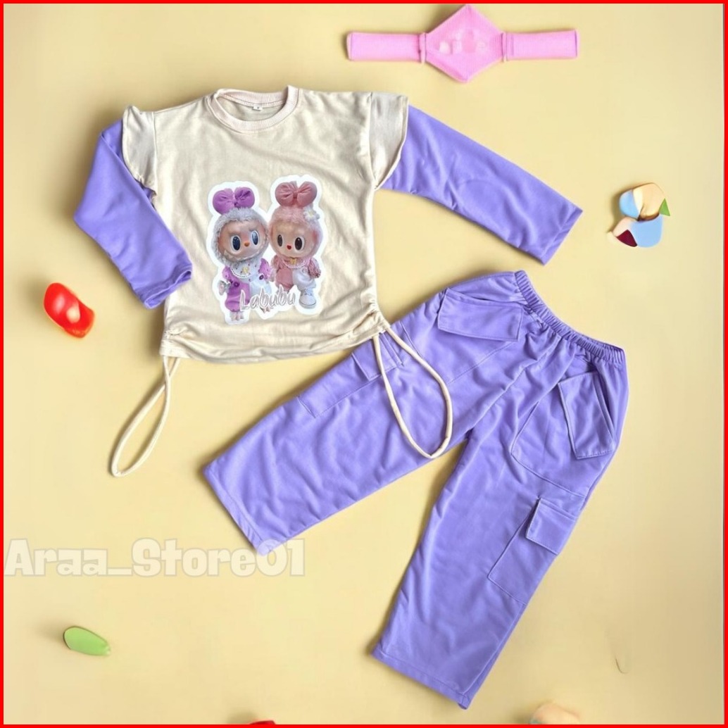 Setelan Baju Anak Perempuan Labubu Lengan Panjang Model Rempel Celana Kargo Usia 3 Sampai 10 Tahun