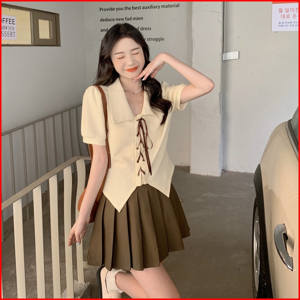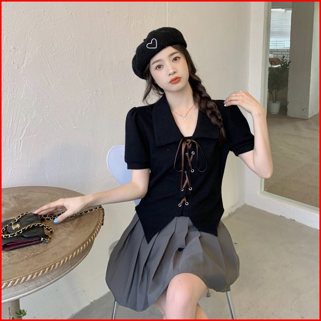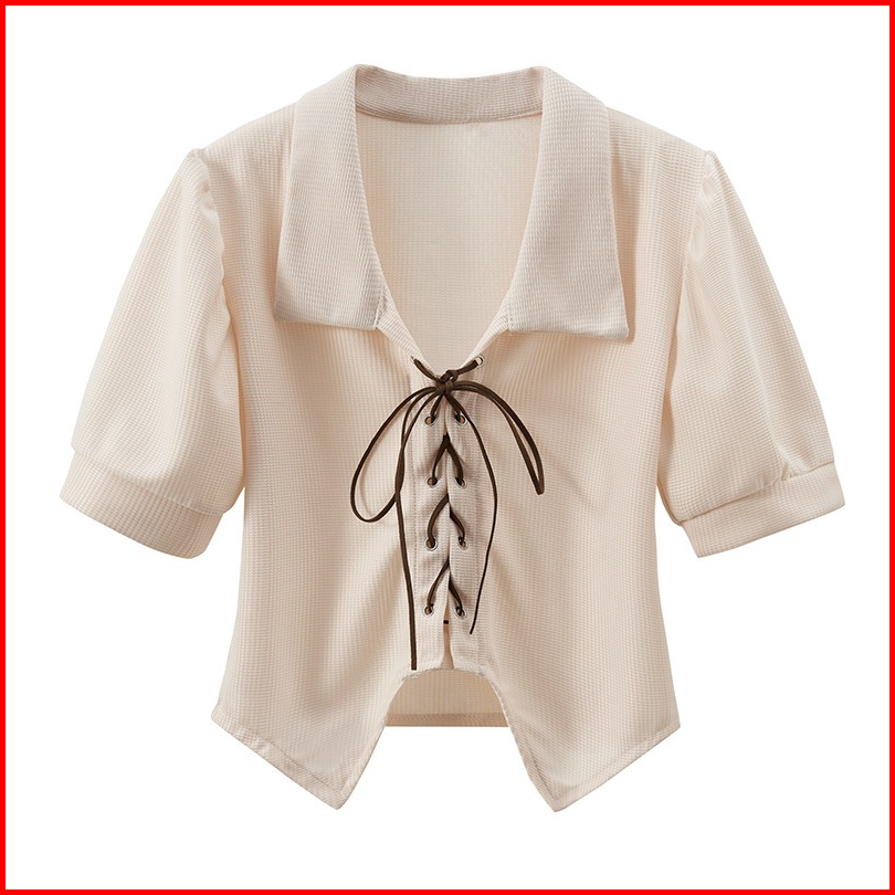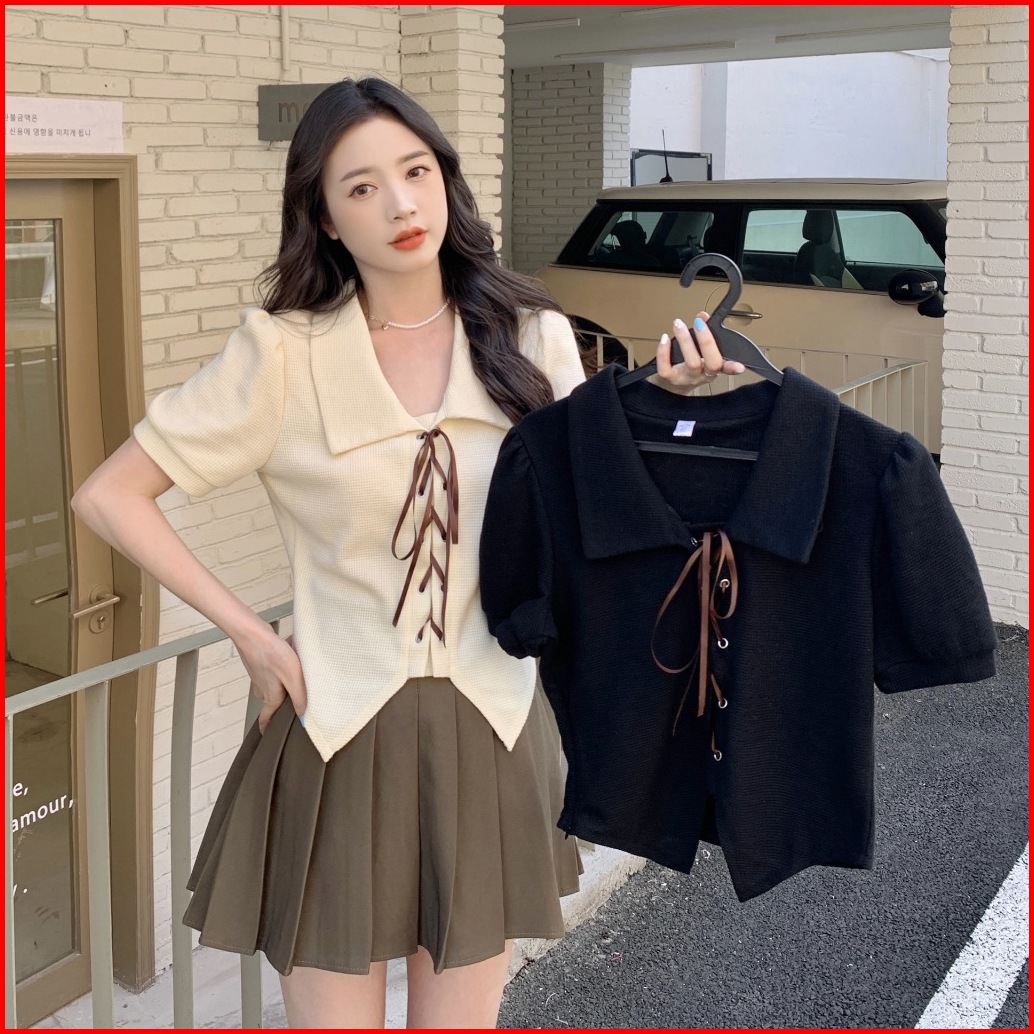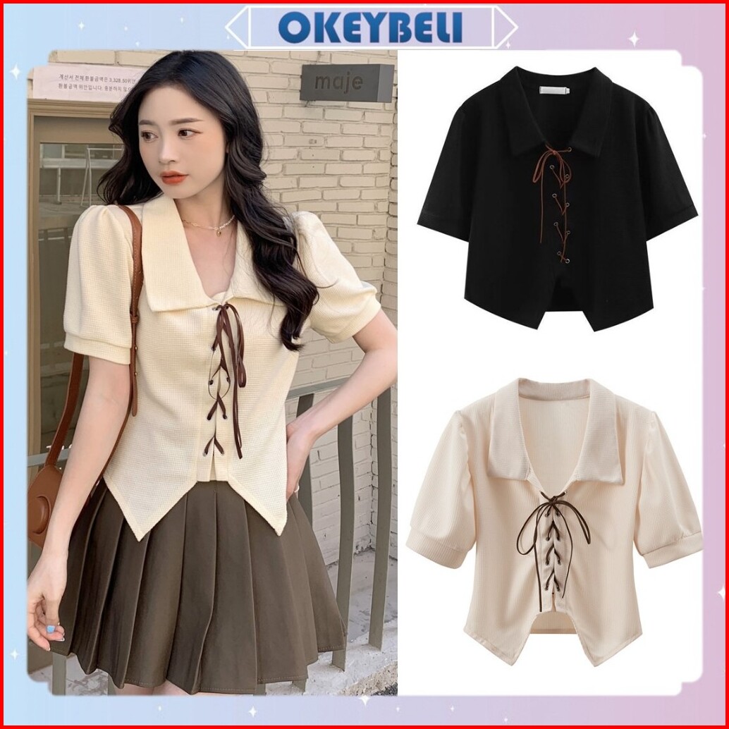 Okey Belibj1525 Baju Atasan Wanita Kemeja Lengan Pendek Bertali Kerah Wafel Casual Fashion Korea