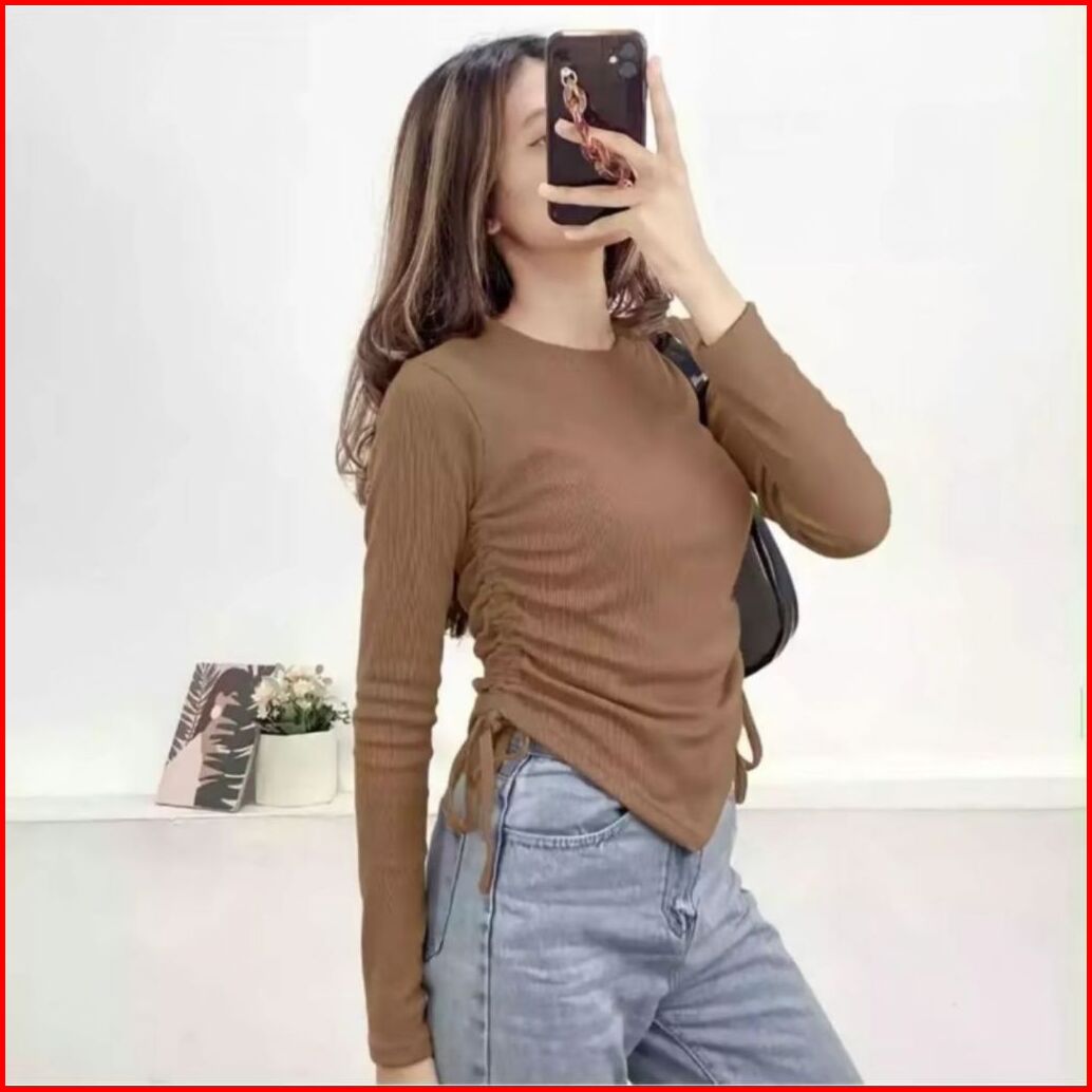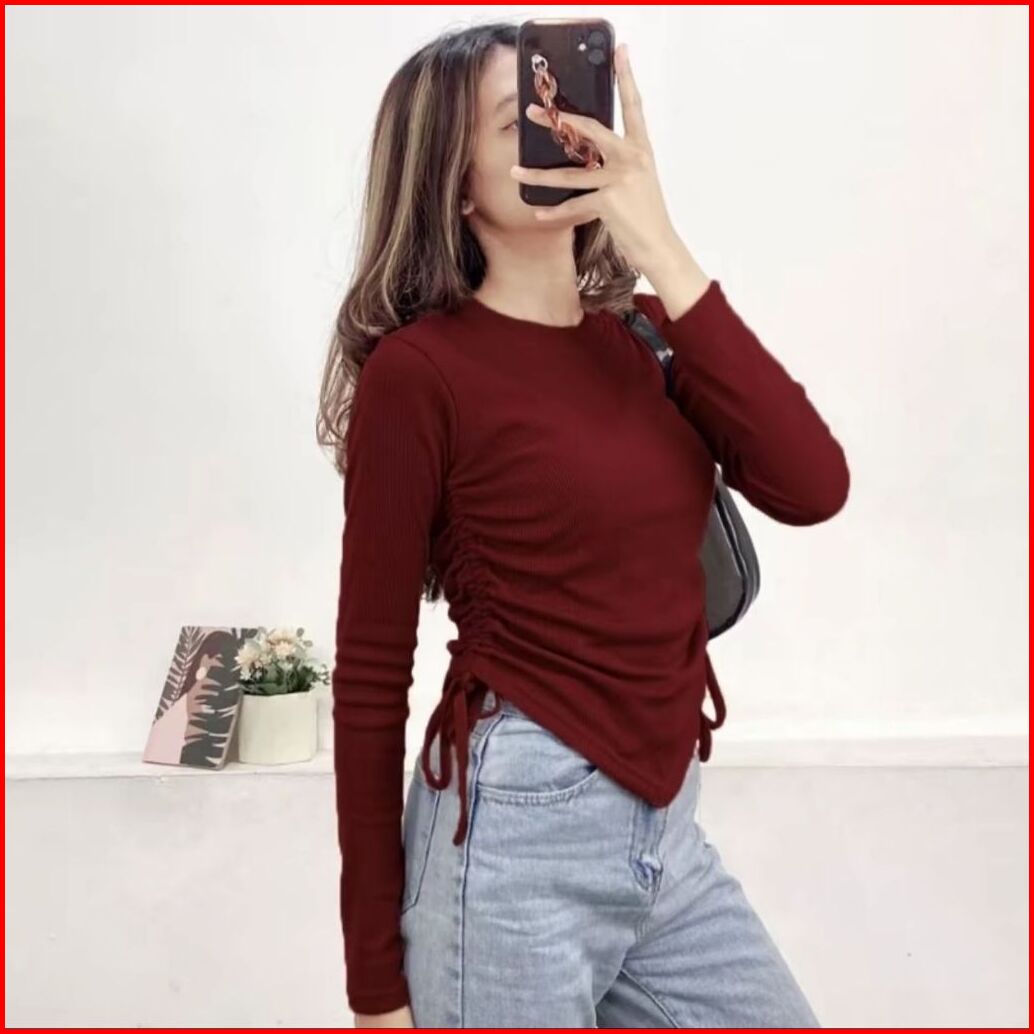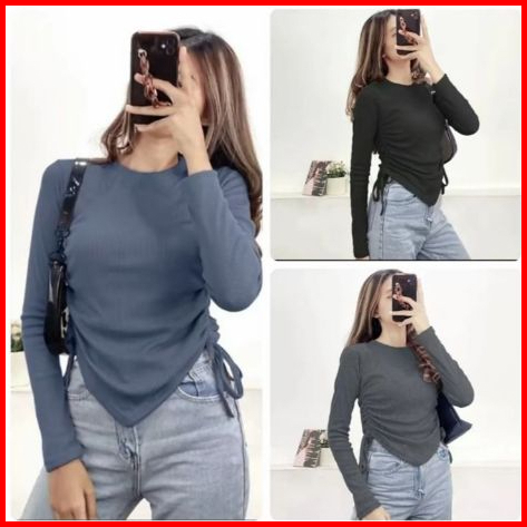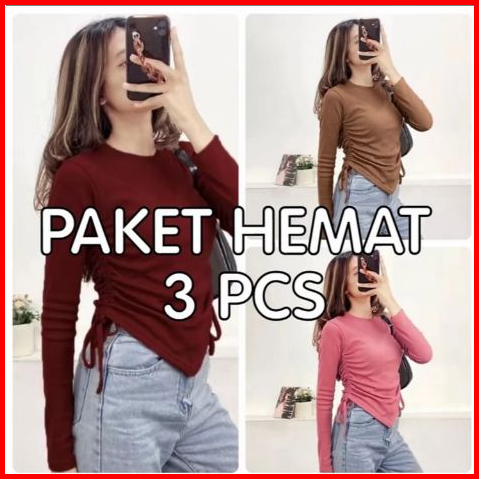Paket Murah 3 Pcs Top Blouse Vallen Serut Tali Samping Rib Lengan Panjang - Atasan Crop Top Wanita