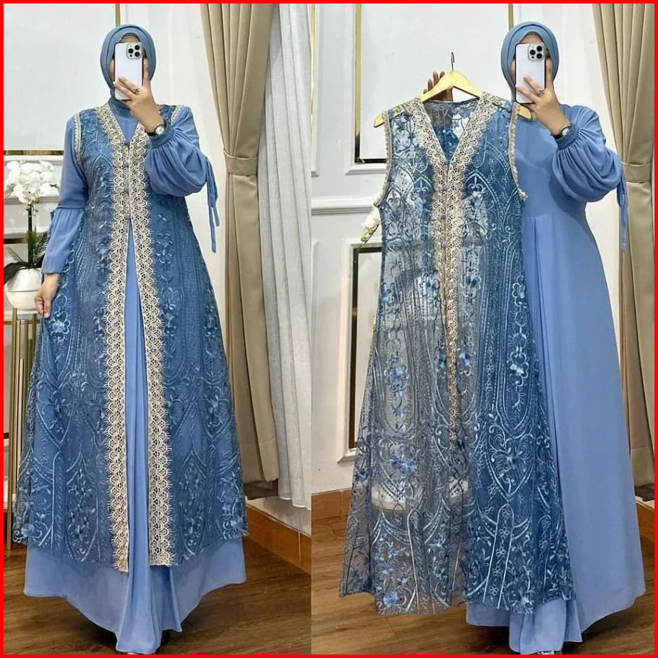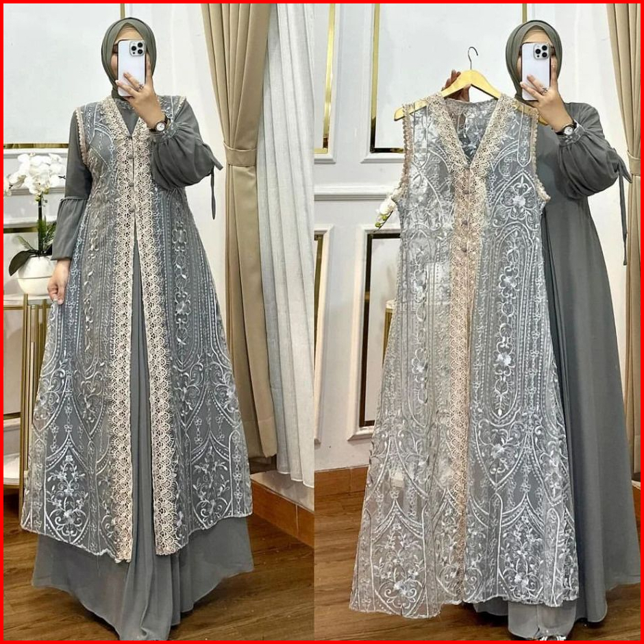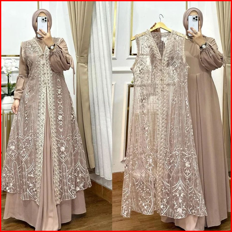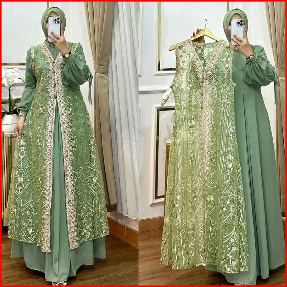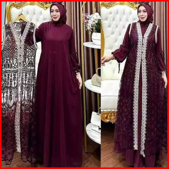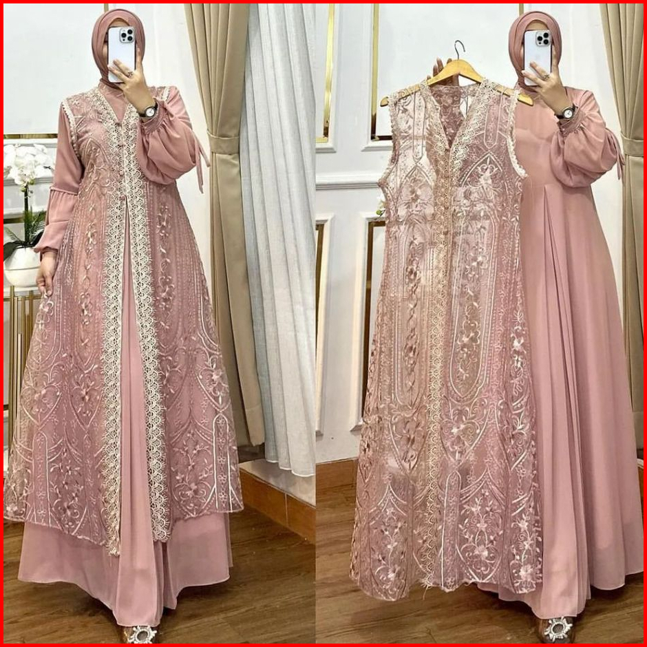 Gamis Dress Muslim Brokat Wanita Kekinian Inner Outer Terbaru 2024 Baju Pesta Kondangan Mewah Elegan