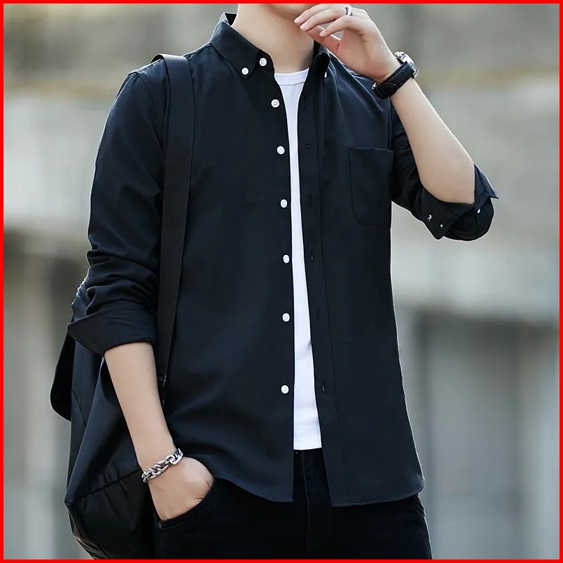 Kemeja Hitam Polos Cowok Keren Casual Putih Navy Marron Abu Lengan Panjang