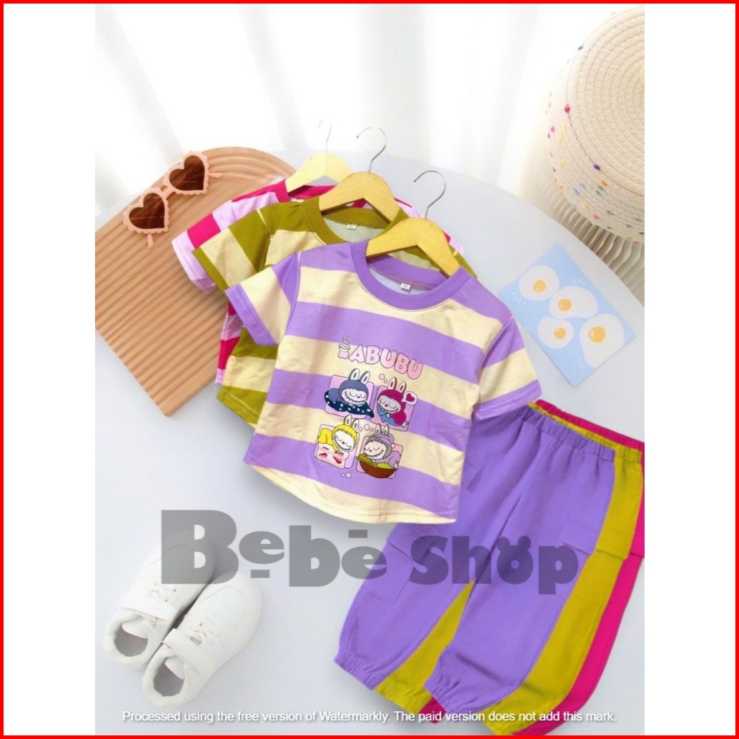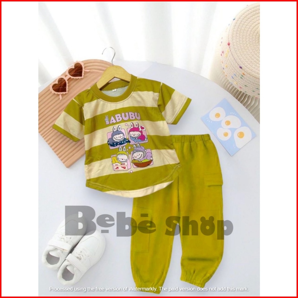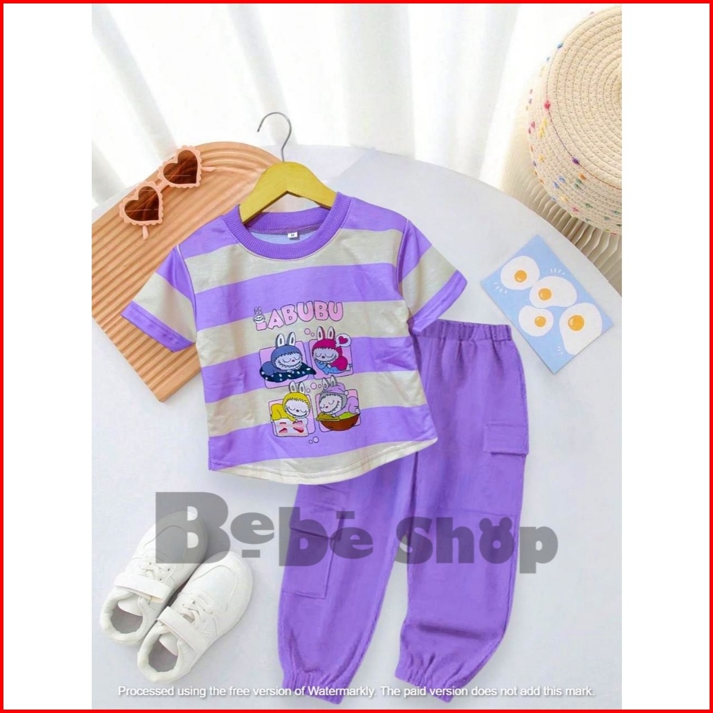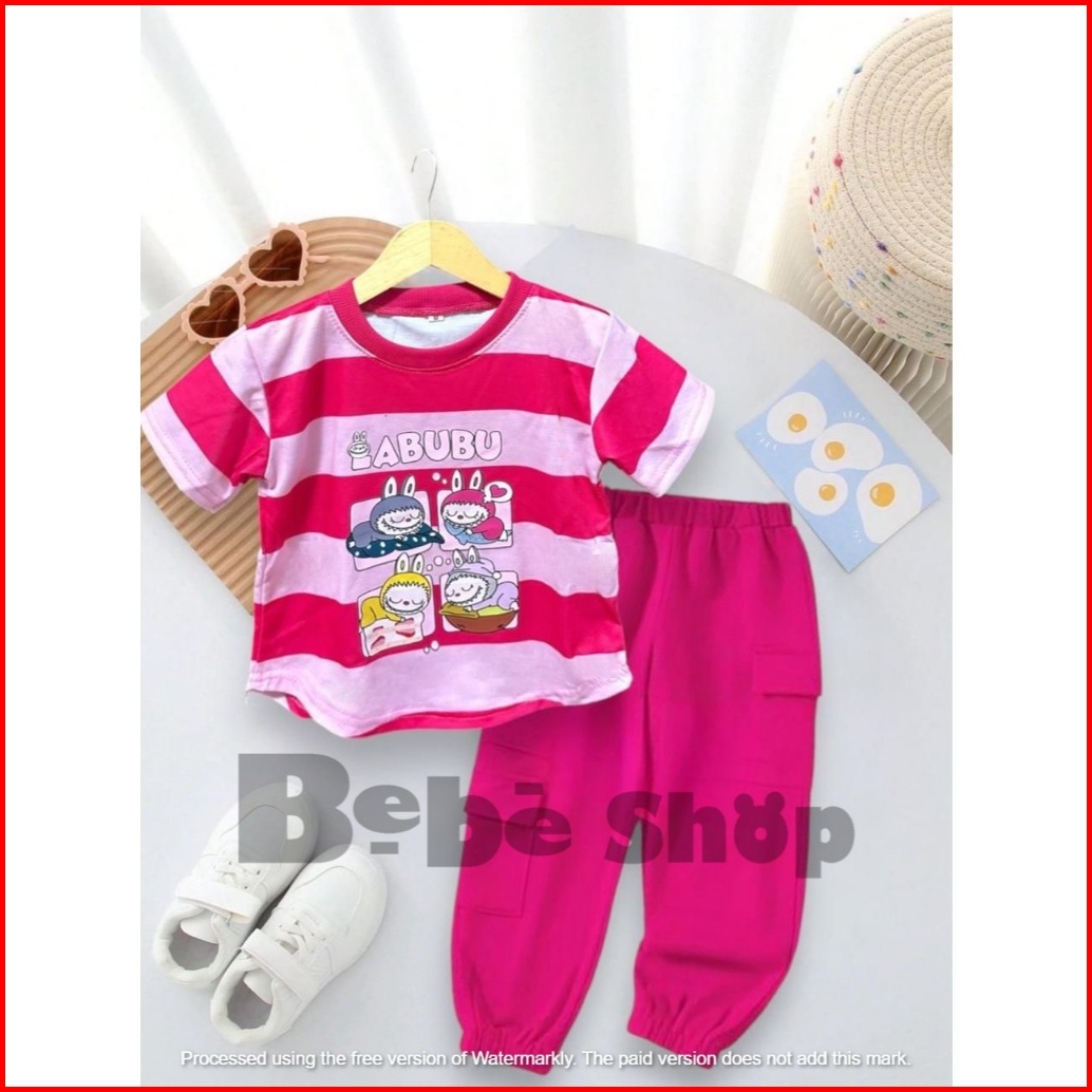 One Set Labubu Anak Perempuan Bahan Flis Motif Terbaru Model Salur Celana Kargo Usia 1 Sampai 6 Tahun