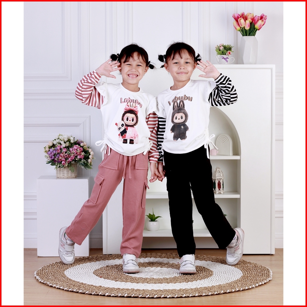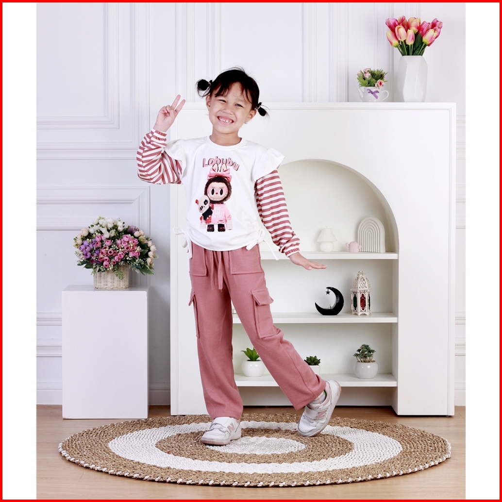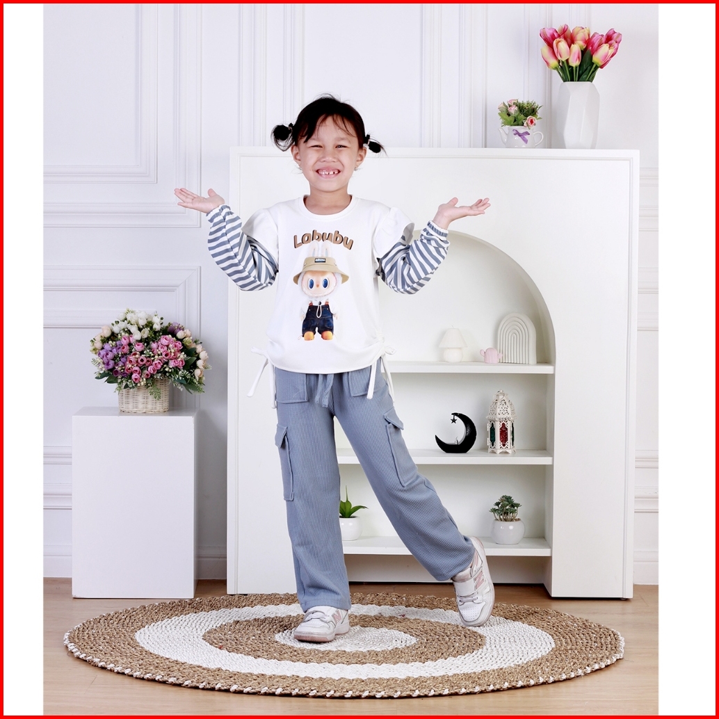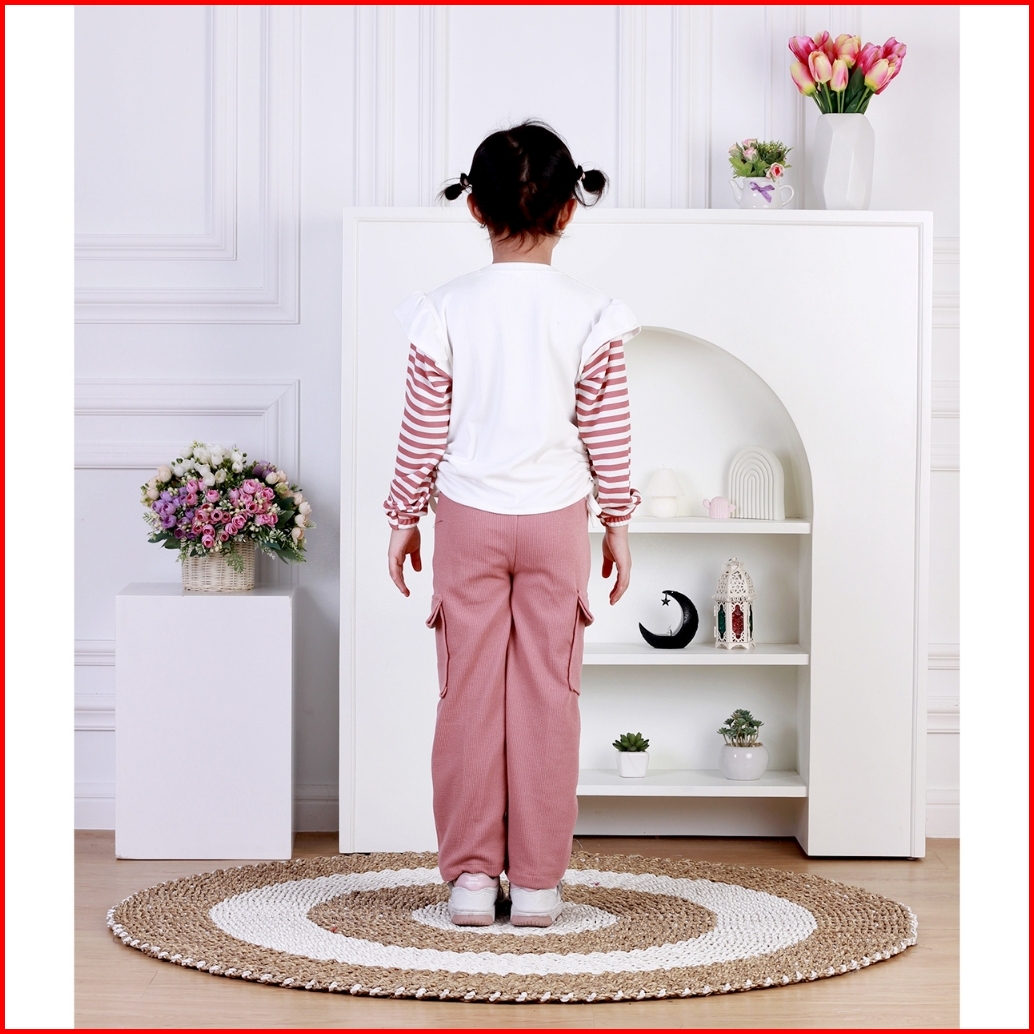 Dungdungkids Setelan Anak Viral Knitt Salur Celana Kargo 3 - 12 Tahun