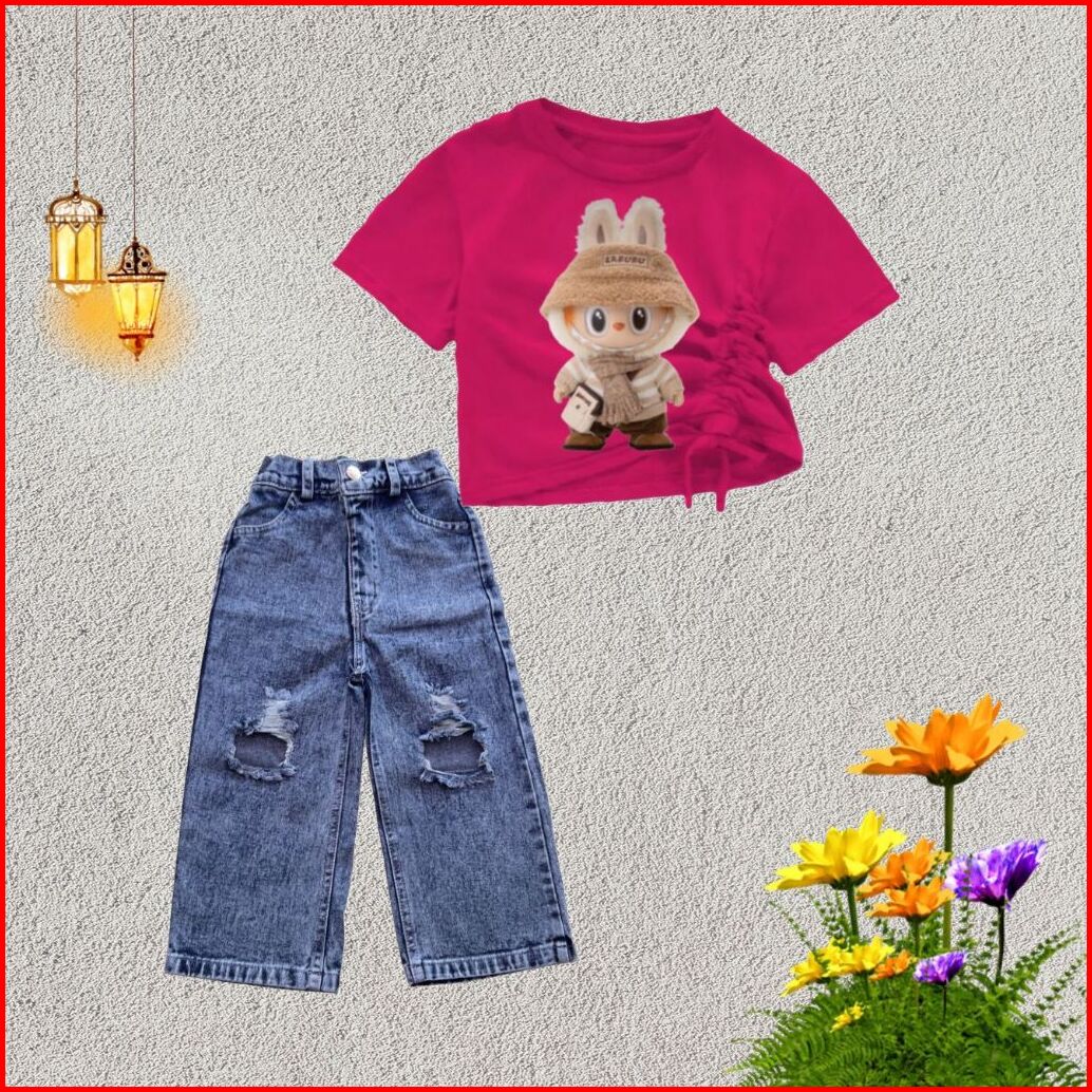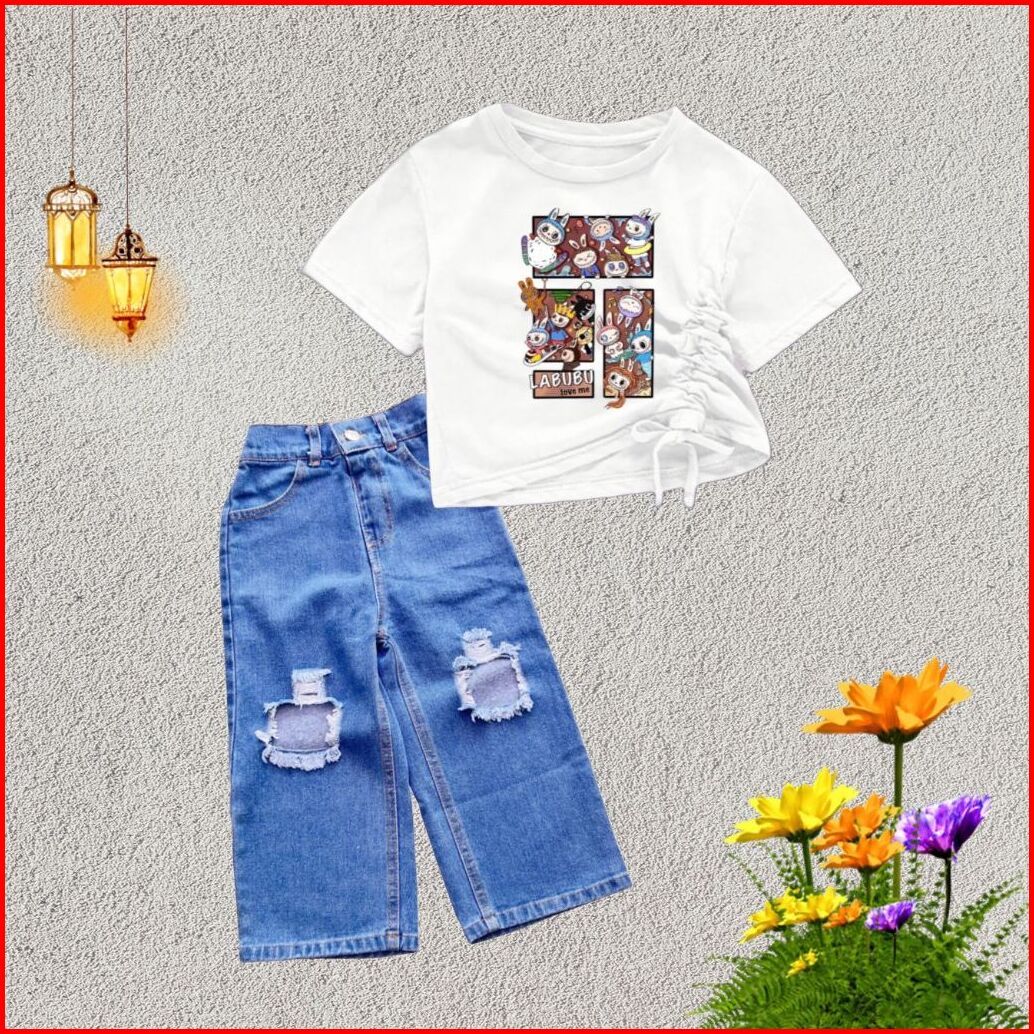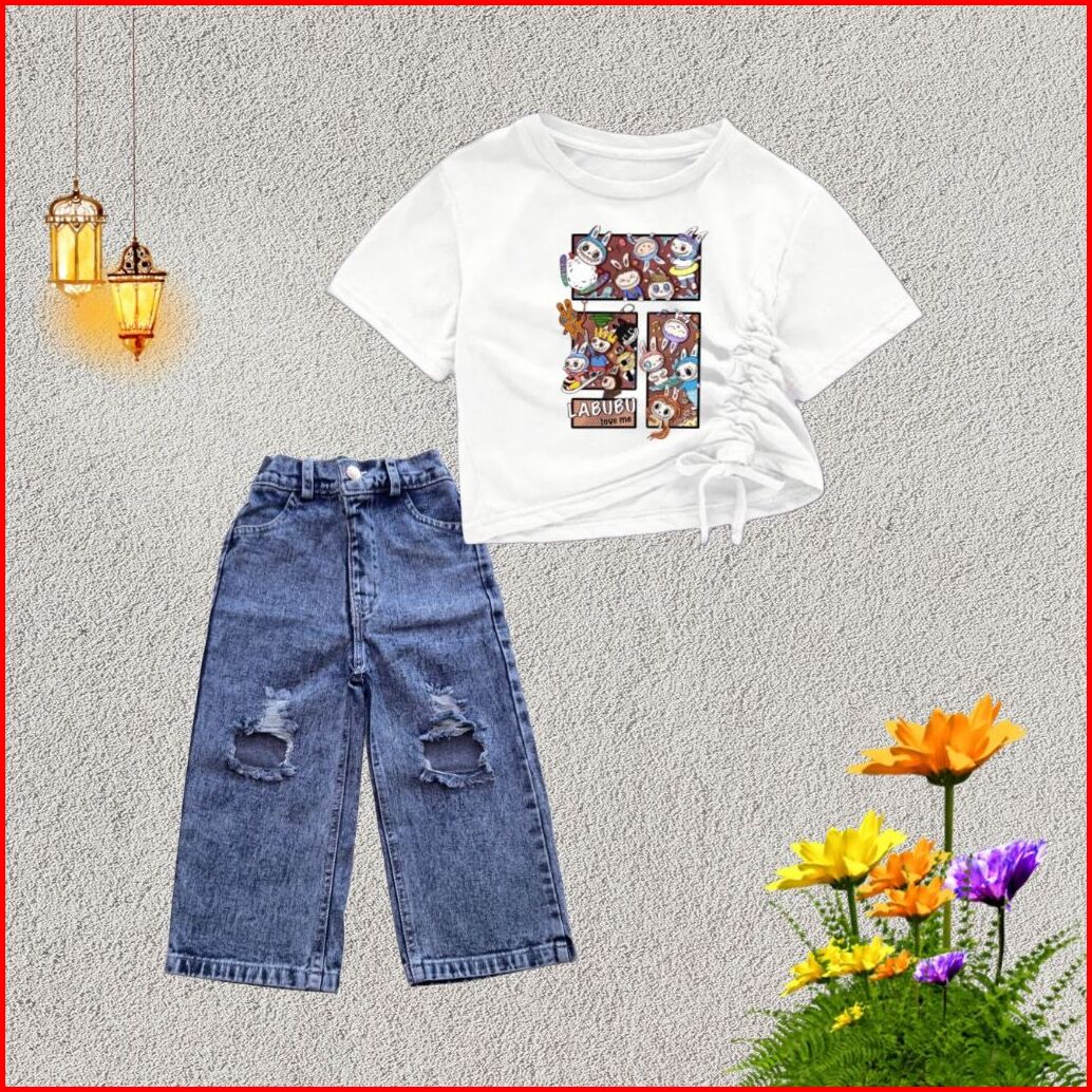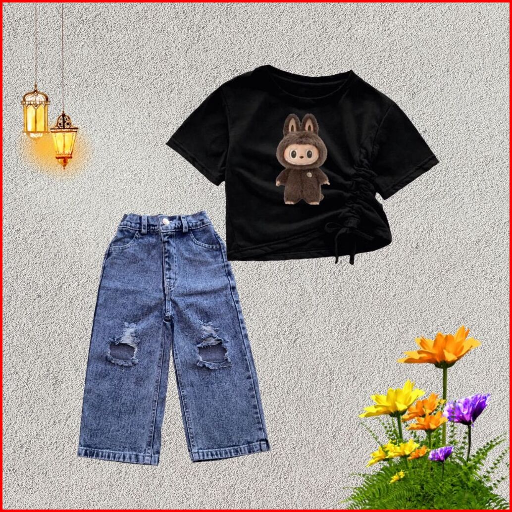 Setelan Kulot Sobek Bm Sandwash Kaos Serut Sablon Labubuu