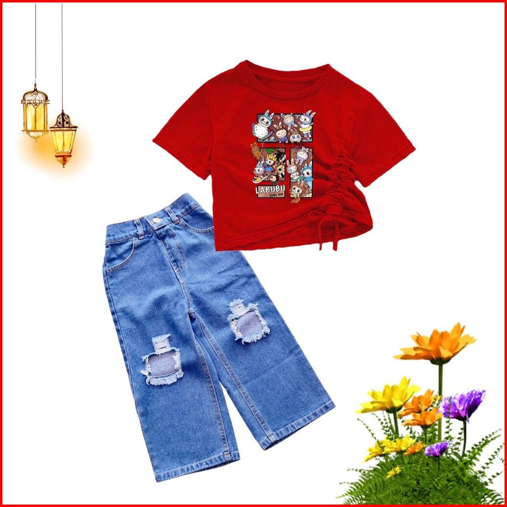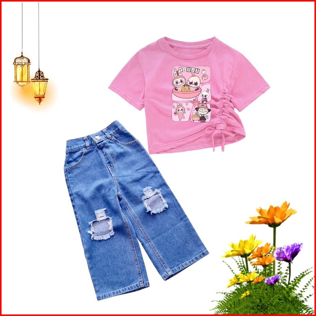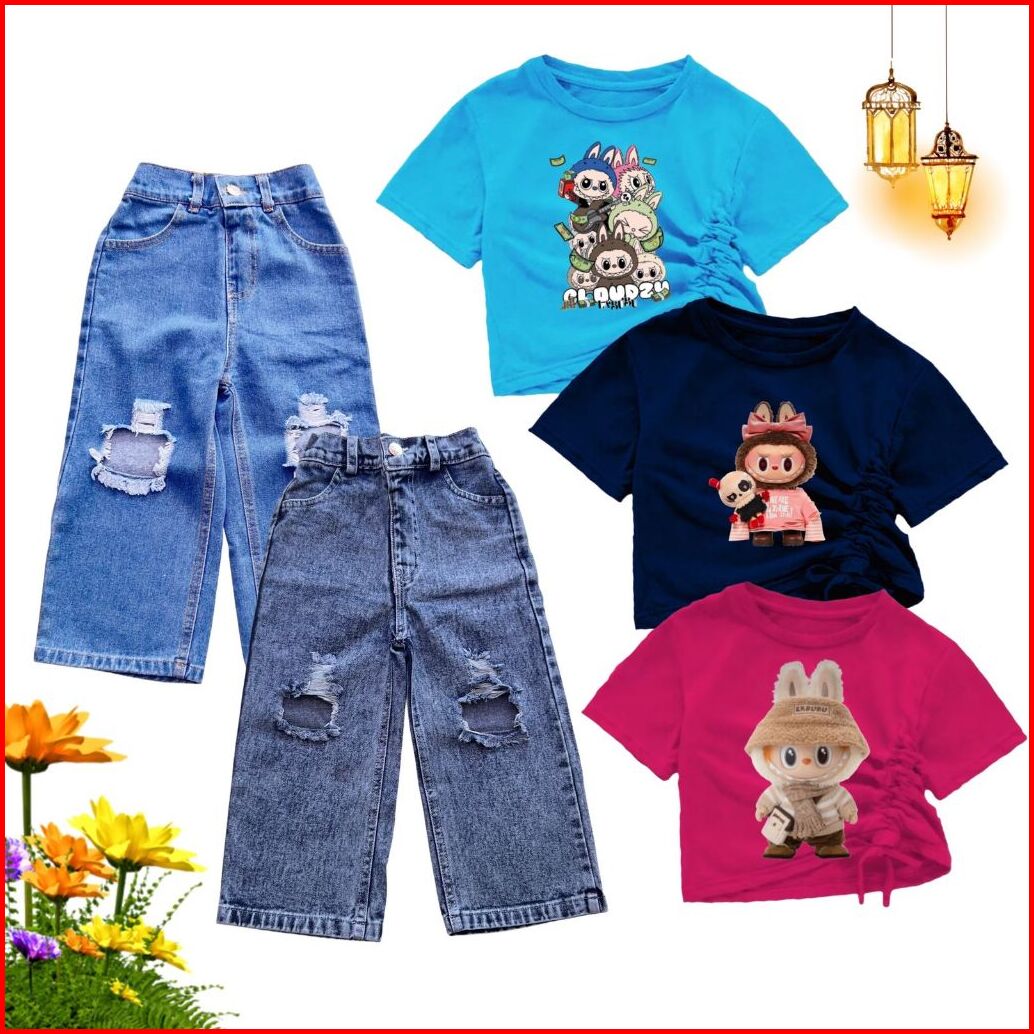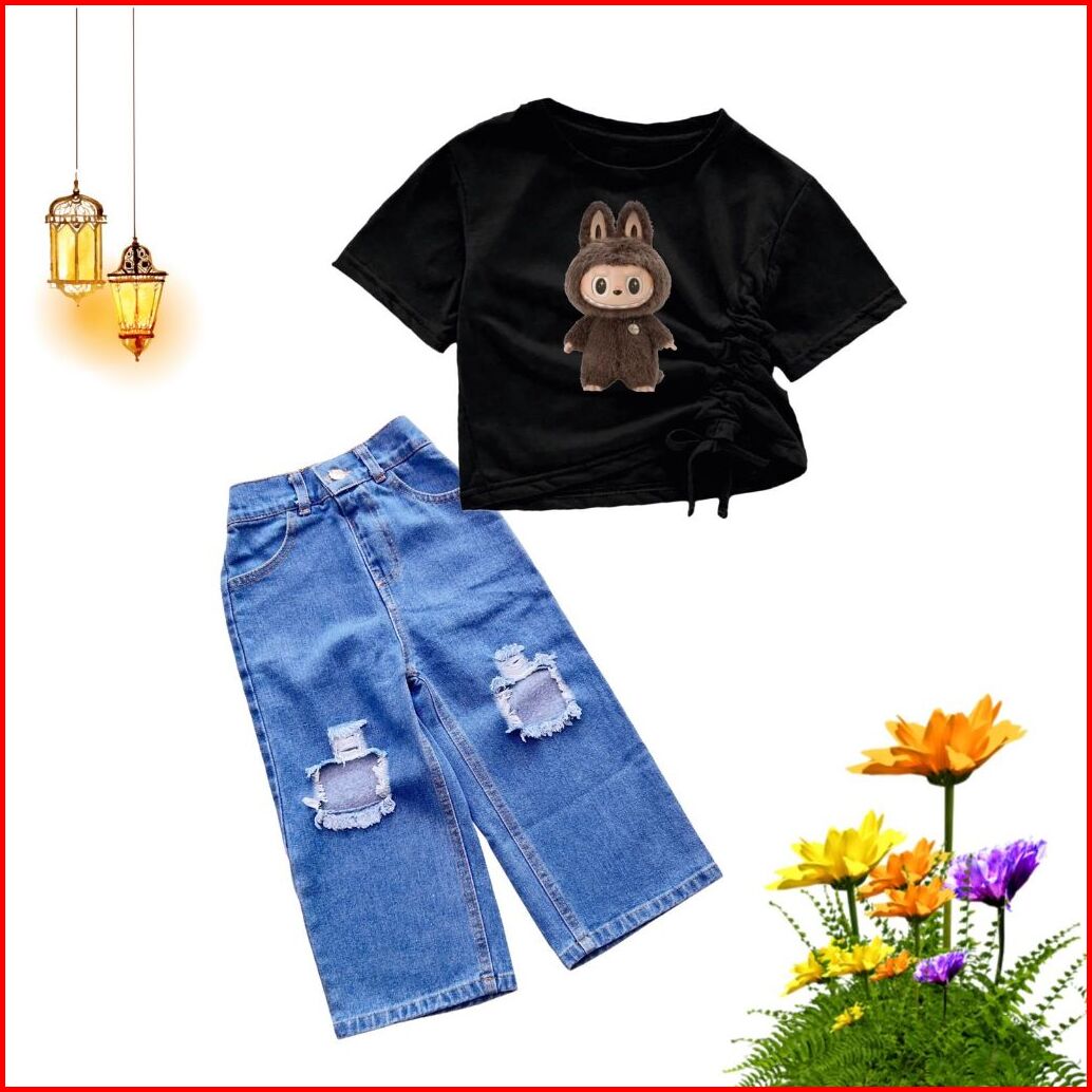 Setelan Kulot Sobek Bm Sandwash Kaos Serut Sablon Labubuu